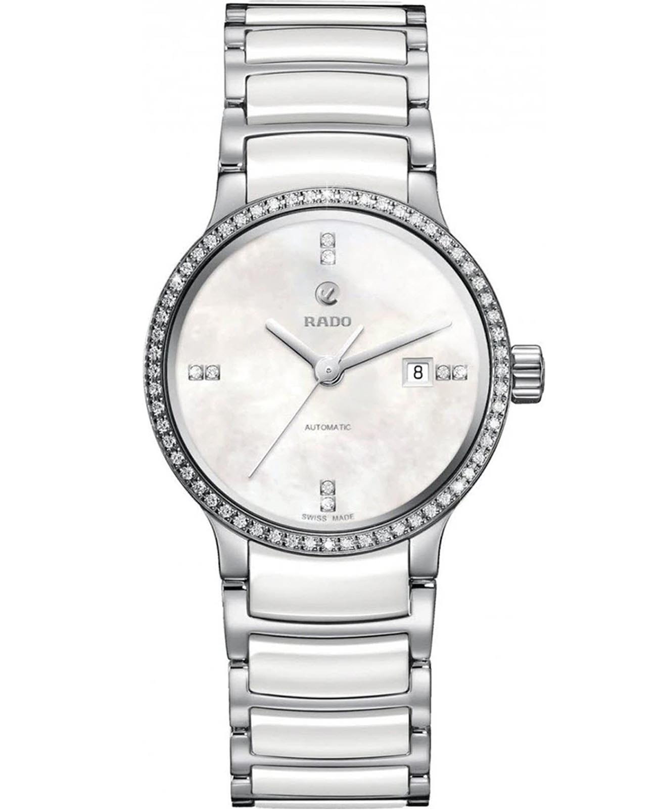 Женские швейцарские часы с автоподзаводом Rado Centrix Automatic Diamonds R30160912. Сапфировое стеклоСапфировое стеклоПрочный и надёжный материал из кристалла сапфира синтетического происхождения, характеризующийся особой твёрдостью и устойчивостью к царапинам и повреждениям. устойчивое к мелким механическим повреждениям. Браслет из стали и высокотехнологичной керамикиВысокотехнологичная керамикаИнновационный запатентованный Rado материал с гладкой или матовой поверхностью. Керамика за счёт кристаллической структуры обладает повышенной устойчивостью от возникновения царапин. Материал способен принимать температуру тела человека, обеспечивая невероятный комфорт при ношении. на раскладной застёжкеРаскладная застёжкаТакой тип застёжки используется только на браслетах из металла. Она никогда не раскрывается полностью, происходит разделение на 2 и более частей. Раскладывающая застёжка снизит вероятность потери часов к минимуму.. Корпус часов изготовлен из нержавеющей стали. Окошко даты находится в положении 3 часа. Циферблат и безельБезельВнешний ободок, закрепляющий стекло. В спортивных часах так называется поворотное кольцо с делениями на циферблате, выполняет роль таймера – замеряет отрезки времени на шкале. Неподвижный безель – элемент декора. Однонаправленно вращающийся безель на дайверских часах позволяет фиксировать моменты погружения и выныривания на поверхность. инкрустирован бриллиантами. Класс водозащиты: 30 метров, позволит защитить корпус от случайных брызг или капель дождя.