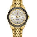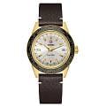 Мужские механические часы с ручным подзаводом Rado Captain Cook Over-Pole — это возвращение культовой модели в лимитированном издании. Корпус диаметром 39 мм и толщиной 10,9 мм выполнен из нержавеющей стали с PVD-покрытиемPVDУльтратонкое покрытие наносится в технике вакуумного напыления, сочетает в себе нитрид титана особой прочности со слоем золота или оксида хрома. Несёт в себе декоративную или защитную функцию. жёлтого золота. БезельБезельВнешний ободок, закрепляющий стекло. В спортивных часах так называется поворотное кольцо с делениями на циферблате, выполняет роль таймера – замеряет отрезки времени на шкале. Неподвижный безель – элемент декора. Однонаправленно вращающийся безель на дайверских часах позволяет фиксировать моменты погружения и выныривания на поверхность. — стальной с вставкой из высокотехнологичной керамикиВысокотехнологичная керамикаИнновационный запатентованный Rado материал с гладкой или матовой поверхностью. Керамика за счёт кристаллической структуры обладает повышенной устойчивостью от возникновения царапин. Материал способен принимать температуру тела человека, обеспечивая невероятный комфорт при ношении. жёлтого цвета. Циферблат оформлен индексами и стрелками с люминесцентным покрытиемЛюминесцентное покрытиеПозволяет считывать показания времени в темноте. Производители наносят на стрелки, часовые индексы, безель или поверхность циферблата светонакопительный состав, дающий холодное свечение. Super-Luminova®, обеспечивающим хорошую читаемость в темноте. Циферблат защищён сапфировым стекломСапфировое стеклоПрочный и надёжный материал из кристалла сапфира синтетического происхождения, характеризующийся особой твёрдостью и устойчивостью к царапинам и повреждениям.. Механизм с функцией мирового времениМировое время Полезное часовое усложнение, отображающее время в основных городах и известных областях по всему миру, оно связано с часовыми поясами, удобно для путешественников и бизнесменов. , антимагнитной пружиной Nivachron™Nivachron™Специально разработанный инновационный сплав Nivachron™ повышает устойчивость часов к воздействию магнитных полей., отрегулированный в пяти положениях, с запасом хода 80 часов. Декор механизма — узор «Côtes de Genève», синие винты и золотистые детали. Прозрачная задняя крышка с сапфировым стеклом и завинчивающимся креплением позволяет наблюдать за работой механизма. Часы оснащены стальным браслетом с PVD-покрытиемPVDУльтратонкое покрытие наносится в технике вакуумного напыления, сочетает в себе нитрид титана особой прочности со слоем золота или оксида хрома. Несёт в себе декоративную или защитную функцию. жёлтого золота и трёхсекционной застёжкой. В комплекте коричневый кожаный ремешок и удобная кожаная сумка для хранения. Смена браслета осуществляется с помощью системы . Водонепроницаемость 100 м позволяет использовать часы для плавания. Идеальный выбор для ценителя эксклюзивности, сложных функций и швейцарского мастерства.