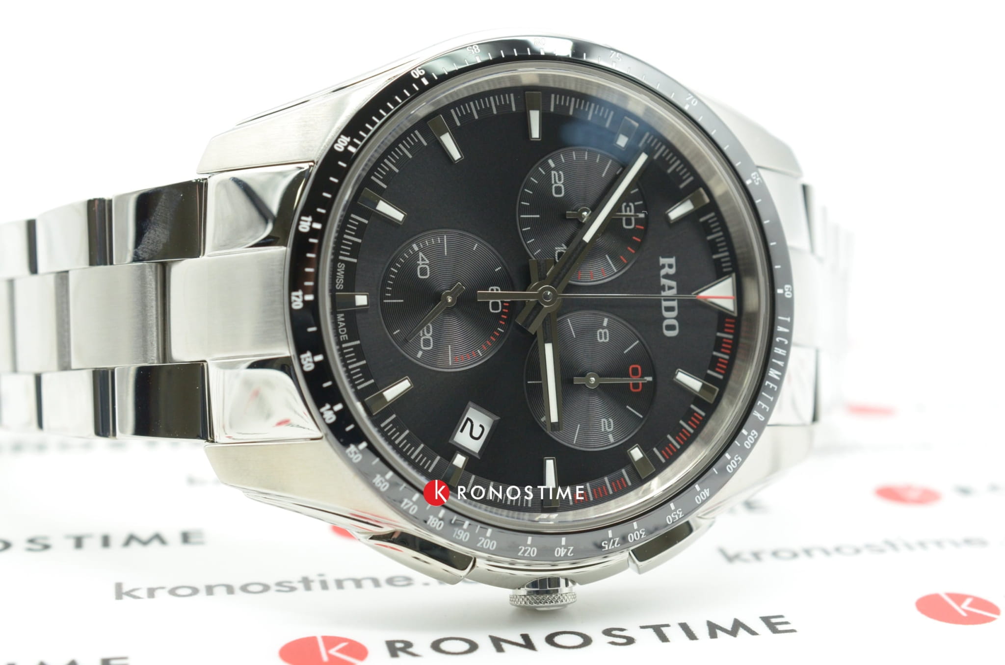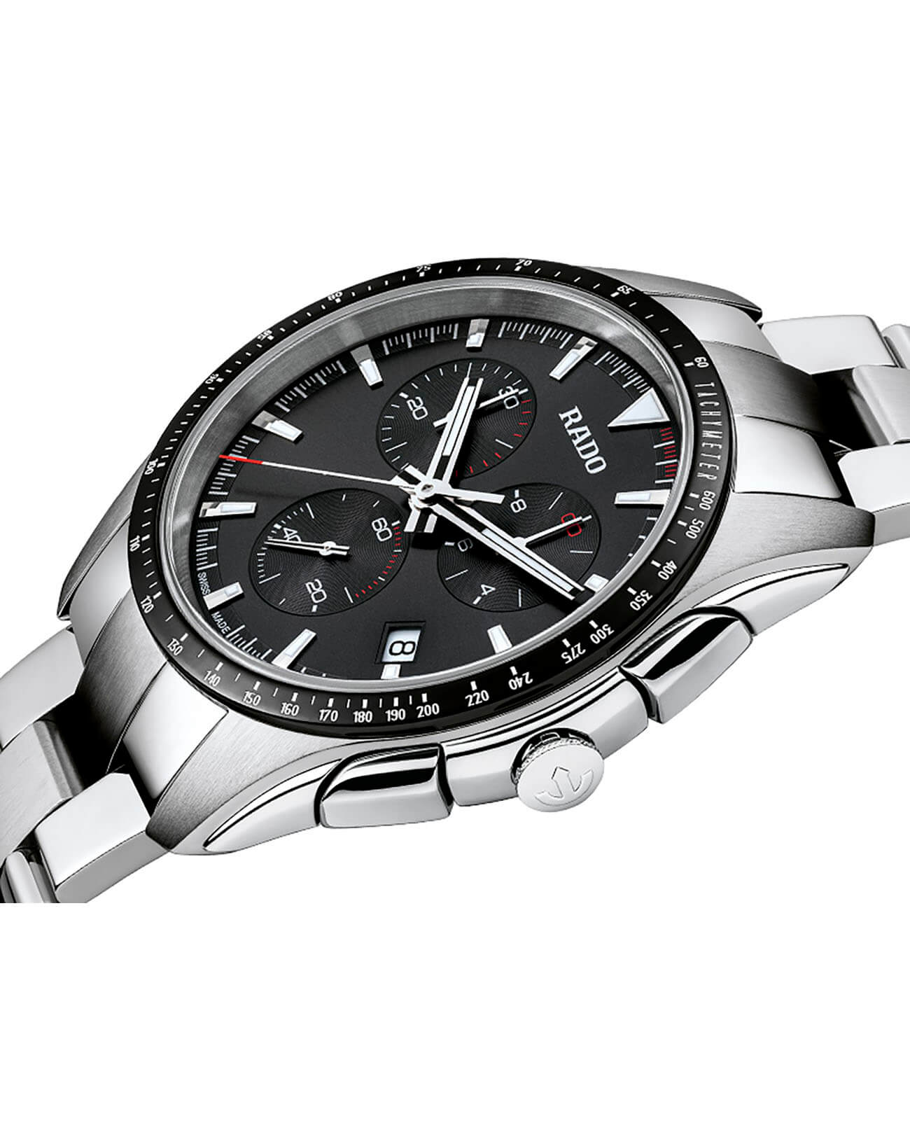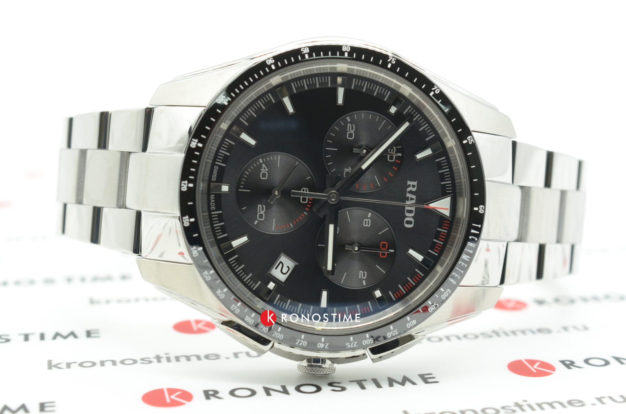 Спортивный хронографХронографФункция позволяет измерять отрезки времени с особой точностью: часы, минуты, секунды. Верным признаком хронографа является наличие на циферблате 3 дополнительных окошек-счётчиков. премиального сегмента позволит чувствовать себя на высоте при любых обстоятельствах, это идеальное дополнение делового или повседневного образа. Чёрный циферблат имеет красные цветовые акценты, придающие общему исполнению динамичности. Кварцевый высокоточный калибр ETA 251.274. Корпус из стали дополнен безелемБезельВнешний ободок, закрепляющий стекло. В спортивных часах так называется поворотное кольцо с делениями на циферблате, выполняет роль таймера – замеряет отрезки времени на шкале. Неподвижный безель – элемент декора. Однонаправленно вращающийся безель на дайверских часах позволяет фиксировать моменты погружения и выныривания на поверхность. из высокотехнологичной керамикиВысокотехнологичная керамикаИнновационный запатентованный Rado материал с гладкой или матовой поверхностью. Керамика за счёт кристаллической структуры обладает повышенной устойчивостью от возникновения царапин. Материал способен принимать температуру тела человека, обеспечивая невероятный комфорт при ношении.. Водостойкость 100 метров. Выпуклое стекло из сапфира с антибликовой поверхностью. Секундомер, календарь, тахиметрТахиметрРазмеченная шкала, располагается на ободке или безеле часов. Тахиметр позволяет рассчитать скорость на определённом участке пути, расстояние измеряется в километрах или милях.. Диаметр корпуса: 44,9 мм.