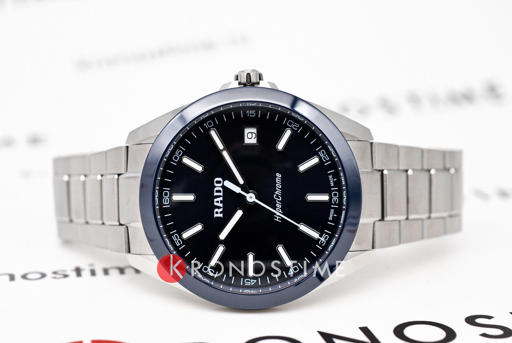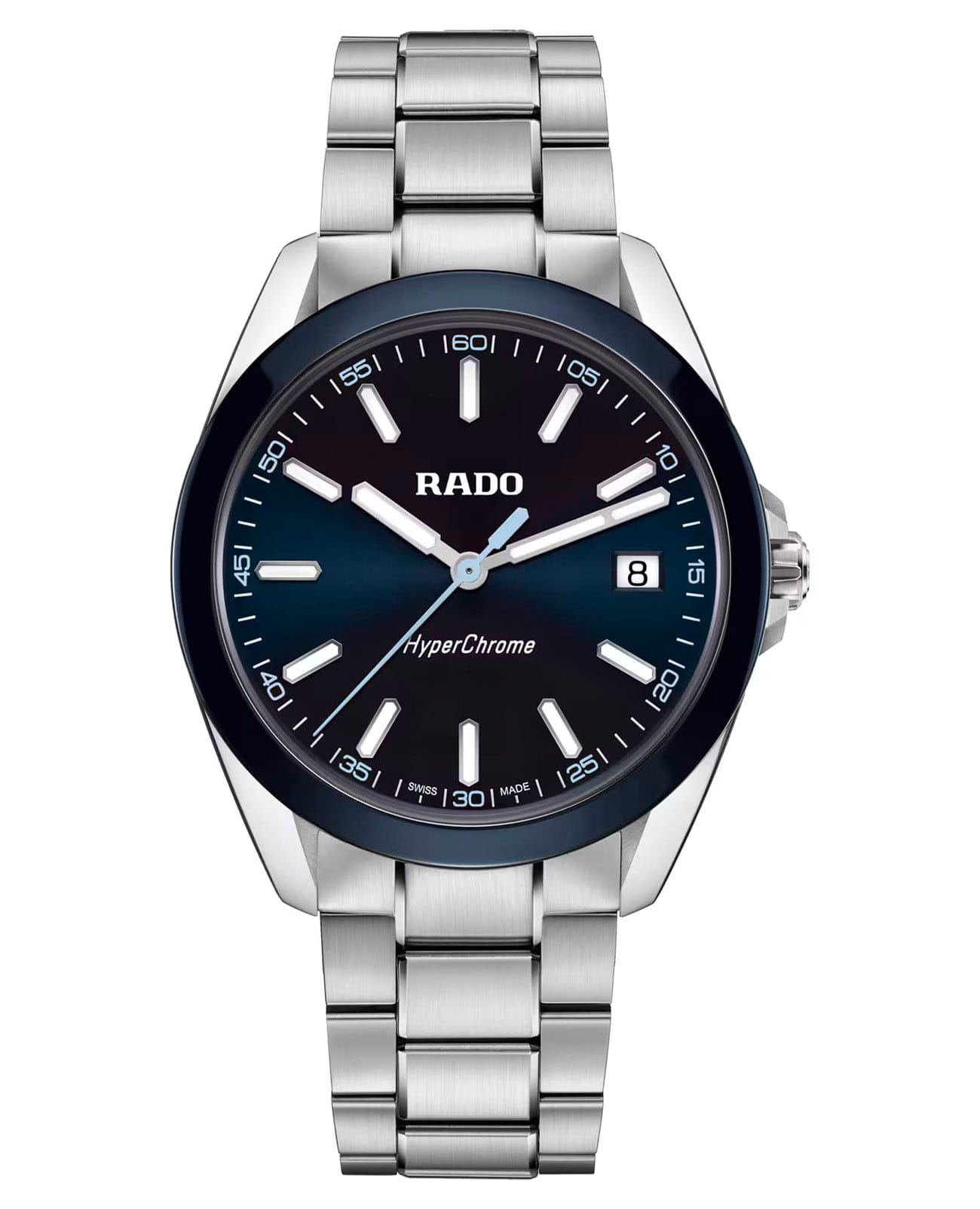 Мужские кварцевые часы Rado HyperChrome — это современное воплощение точности и мастерства материалов. Корпус диаметром 41,5 мм и толщиной 11,7 мм выполнен из полированной и матовой нержавеющей стали. БезельБезельВнешний ободок, закрепляющий стекло. В спортивных часах так называется поворотное кольцо с делениями на циферблате, выполняет роль таймера – замеряет отрезки времени на шкале. Неподвижный безель – элемент декора. Однонаправленно вращающийся безель на дайверских часах позволяет фиксировать моменты погружения и выныривания на поверхность. изготовлен из высокотехнологичной керамикиВысокотехнологичная керамикаИнновационный запатентованный Rado материал с гладкой или матовой поверхностью. Керамика за счёт кристаллической структуры обладает повышенной устойчивостью от возникновения царапин. Материал способен принимать температуру тела человека, обеспечивая невероятный комфорт при ношении. синего цвета, придающей часам прочность и изысканность. Циферблат синего цвета с лакированным покрытием оформлен индексами и стрелками с люминесцентным покрытиемЛюминесцентное покрытиеПозволяет считывать показания времени в темноте. Производители наносят на стрелки, часовые индексы, безель или поверхность циферблата светонакопительный состав, дающий холодное свечение. Super-Luminova®. Особенность подсветки — зелёное свечение метки 12 часов и минутной стрелки, и синее — остальных индексов и часовой стрелки, что обеспечивает интуитивное считывание времени в темноте. Циферблат защищён выпуклым сапфировым стекломСапфировое стеклоПрочный и надёжный материал из кристалла сапфира синтетического происхождения, характеризующийся особой твёрдостью и устойчивостью к царапинам и повреждениям. с антибликовым покрытиемАнтибликовое покрытиеСлой оксида металла в 0,13-0,3 микрон, благодаря которому стекло часов не бликует и не отражает свет. Антибликовое покрытие уменьшает отражение света в 10 раз, обеспечивая отличную читаемость показателей циферблата. на внутренней стороне. Механизм — кварцевый. Окошко даты расположено в положении 3 часов. Часы оснащены трёхрядным стальным браслетом с центральными звеньями и трёхсекционной застёжкой с системой быстрой регулировки. Водонепроницаемость 150 м позволяет использовать часы для плавания и повседневного ношения. Идеальный выбор для тех, кто ценит инновации, точность и смелый дизайн.