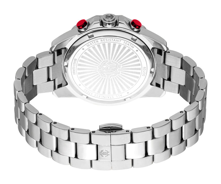 ROBERTO CAVALLI Uomo Sport III RC5G109M0055 — стильные итальянские часы-хронографХронографФункция позволяет измерять отрезки времени с особой точностью: часы, минуты, секунды. Верным признаком хронографа является наличие на циферблате 3 дополнительных окошек-счётчиков. сочетающие в себе элегантность и современный функционал. Корпус диаметром 42 мм выполнен из нержавеющей стали, толщина корпуса составляет 9 мм, что придает модели выразительный внешний вид и надежную защиту от внешних воздействий. Циферблат, искусно оформленный фирменными элементами Roberto Cavalli, притягивает взгляд и подчеркивает ваш безупречный вкус. Часы оснащены кварцевым механизмом, также обладают функцией отображения даты, что делает их удобными для ежедневного использования. Минеральное стеклоМинеральное стеклоМинеральное стекло представляет собой искусственно выращенный минерал кварца. Такое стекло отличается особой устойчивостью к повреждениям и царапинам. Уступает по некоторым качествам сапфировому стеклу. защищает часы от царапин. Водозащита 100 метров позволит плавать, нырять и заниматься другими водными видами спорта. Стальной браслет на застёжке-бабочке с кнопкамиЗастёжка "бабочка"Такой вид застёжки дополняется предохранителями, помогающими избежать случайного раскрытия браслета. Обладают изящным исполнением. обеспечивает комфортное ношение. Стрелки и метки с люминесцентным покрытиемЛюминесцентное покрытиеПозволяет считывать показания времени в темноте. Производители наносят на стрелки, часовые индексы, безель или поверхность циферблата светонакопительный состав, дающий холодное свечение. обеспечивают отличную читаемость в любое время суток.