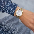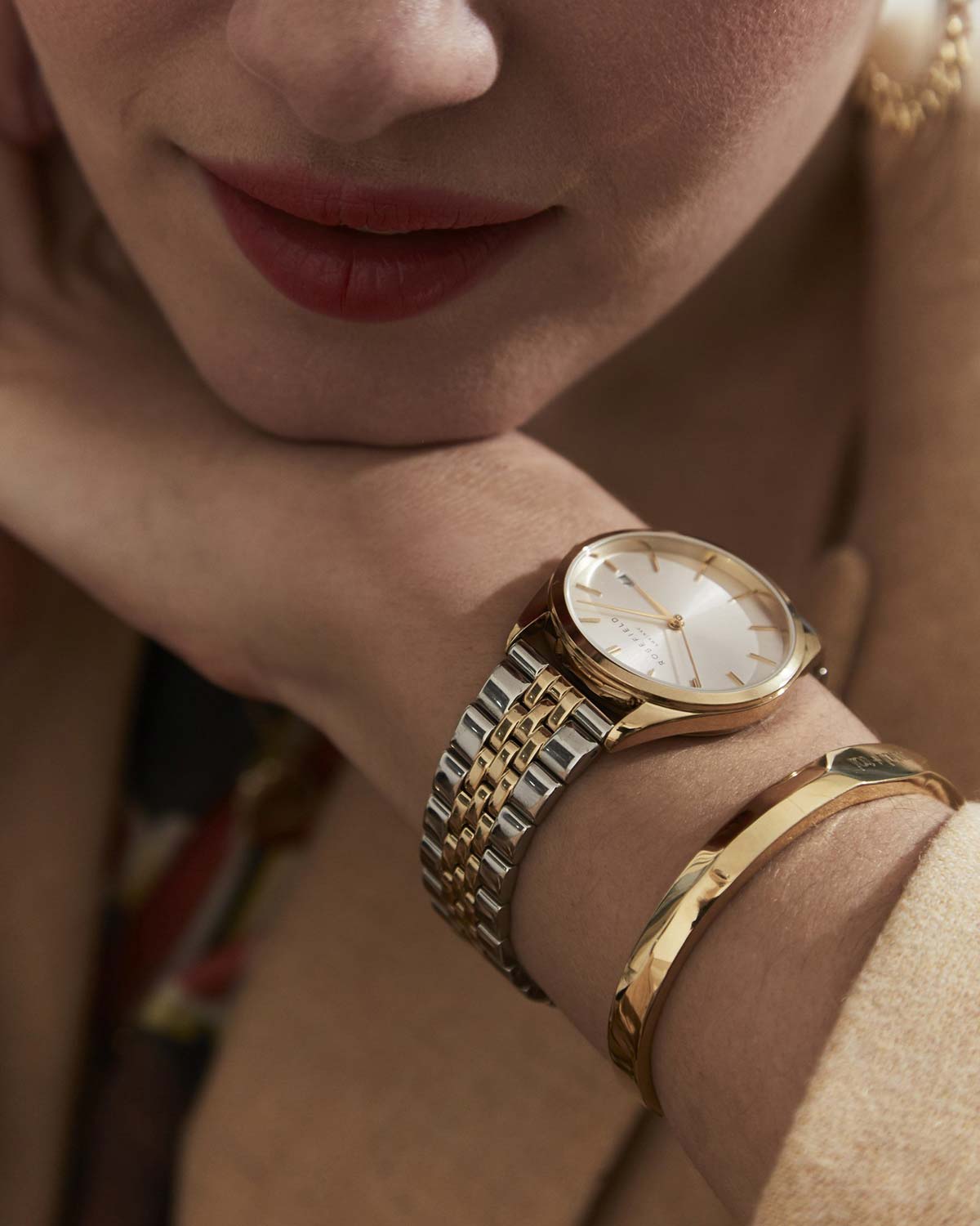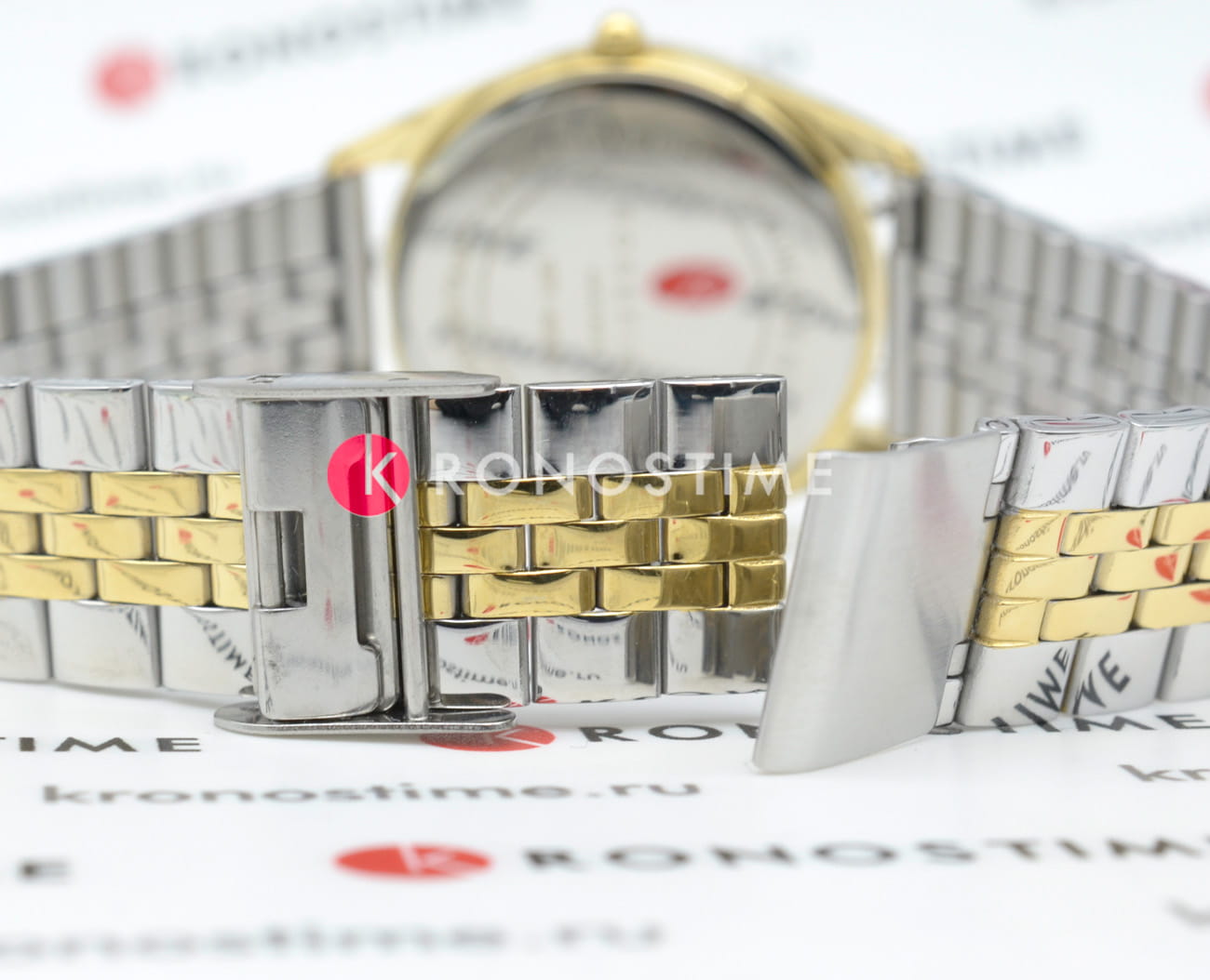 Класс водозащиты 30 метров обеспечивает защиту корпуса от случайных брызг воды или капель дождя, что делает эти часы отличным выбором для активного образа жизни. Стальной браслет с частичным PVD-покрытиемPVDУльтратонкое покрытие наносится в технике вакуумного напыления, сочетает в себе нитрид титана особой прочности со слоем золота или оксида хрома. Несёт в себе декоративную или защитную функцию. и ювелирной застежкой обеспечивает комфортное и безопасное ношение, дополняя общий дизайн часов.