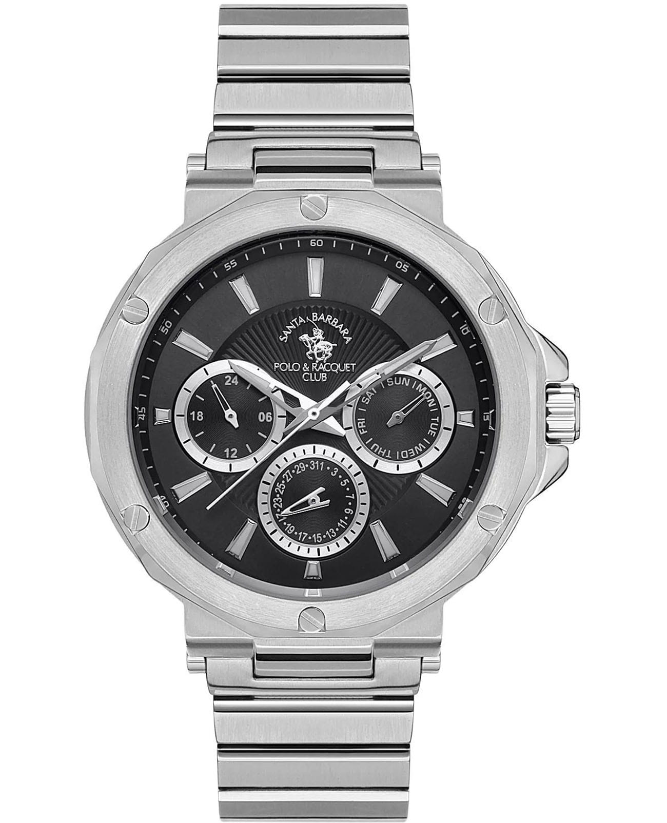 Мужские кварцевые часы Santa Barbara Polo & Racquet Club — это удобный и функциональный аксессуар на каждый день. Корпус диаметром 45 мм выполнен из стали 316L. Циферблат чёрного цвета двухуровневой конструкции оформлен штрихами и скелетонизированными стрелками. Присутствуют отдельные индикаторы дня недели и даты, а также 24-часовой формат времени. Стрелки и метки с люминесцентным покрытиемЛюминесцентное покрытиеПозволяет считывать показания времени в темноте. Производители наносят на стрелки, часовые индексы, безель или поверхность циферблата светонакопительный состав, дающий холодное свечение., обеспечивающим хорошую читаемость в темноте. Циферблат защищён минеральным стекломМинеральное стеклоМинеральное стекло представляет собой искусственно выращенный минерал кварца. Такое стекло отличается особой устойчивостью к повреждениям и царапинам. Уступает по некоторым качествам сапфировому стеклу.. Часы оснащены стальным браслетом на застёжке «бабочка» с кнопкамиЗастёжка "бабочка"Такой вид застёжки дополняется предохранителями, помогающими избежать случайного раскрытия браслета. Обладают изящным исполнением. . Водонепроницаемость 30 м позволяет использовать часы в повседневных условиях. Идеальный выбор для тех, кто ценит американское качество и универсальный дизайн.