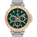 Мужские кварцевые часы Santa Barbara Polo & Racquet Club — это удобный и функциональный аксессуар на каждый день. Корпус диаметром 45 мм выполнен из стали 316L. БезельБезельВнешний ободок, закрепляющий стекло. В спортивных часах так называется поворотное кольцо с делениями на циферблате, выполняет роль таймера – замеряет отрезки времени на шкале. Неподвижный безель – элемент декора. Однонаправленно вращающийся безель на дайверских часах позволяет фиксировать моменты погружения и выныривания на поверхность. с  IP-покрытиемIP-покрытиеМетод ионного напыления. Демонстрирует повышенную устойчивость к истиранию, окислению и химическим веществам. Под воздействием высокого давления и температуры около 1500°C молекулы металла надёжно соединяются с частицами корпуса часов.. Циферблат зелёного цвета двухуровневой конструкции оформлен штрихами и скелетонизированными стрелками. Присутствуют отдельные индикаторы дня недели и даты, а также 24-часовой формат времени. Стрелки и метки с люминесцентным покрытиемЛюминесцентное покрытиеПозволяет считывать показания времени в темноте. Производители наносят на стрелки, часовые индексы, безель или поверхность циферблата светонакопительный состав, дающий холодное свечение., обеспечивающим хорошую читаемость в темноте. Циферблат защищён минеральным стекломМинеральное стеклоМинеральное стекло представляет собой искусственно выращенный минерал кварца. Такое стекло отличается особой устойчивостью к повреждениям и царапинам. Уступает по некоторым качествам сапфировому стеклу.. Часы оснащены стальным браслетом на застёжке «бабочка» с кнопкамиЗастёжка "бабочка"Такой вид застёжки дополняется предохранителями, помогающими избежать случайного раскрытия браслета. Обладают изящным исполнением. . Водонепроницаемость 30 м позволяет использовать часы в повседневных условиях. Идеальный выбор для тех, кто ценит американское качество и универсальный дизайн.