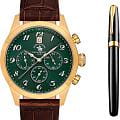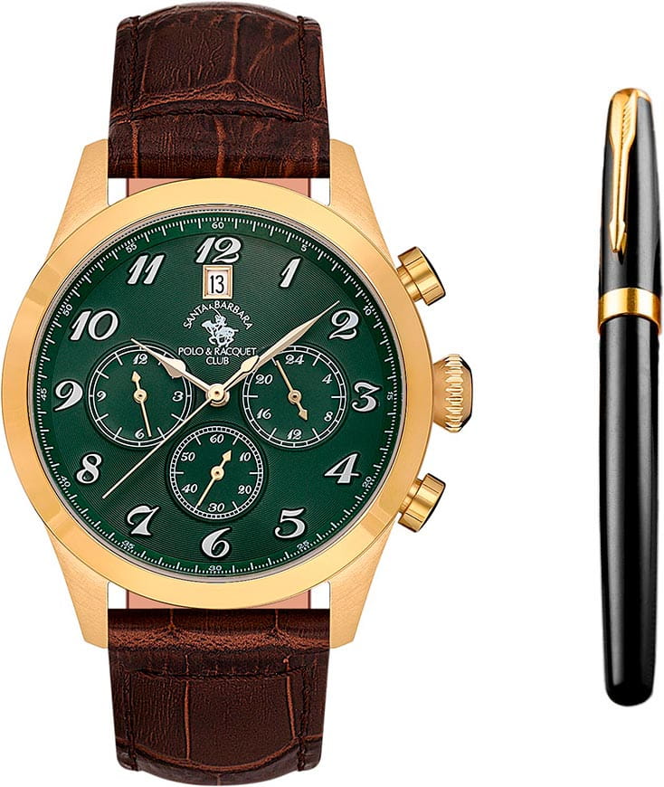 Мужские кварцевые Santa Barbara Polo & Racquet Club SB.1.10551-5 — воплощение элегантности и технического совершенства. Корпус из нержавеющей стали с IP-покрытиемIP-покрытиеМетод ионного напыления. Демонстрирует повышенную устойчивость к истиранию, окислению и химическим веществам. Под воздействием высокого давления и температуры около 1500°C молекулы металла надёжно соединяются с частицами корпуса часов. золотистого цвета, диаметром 43 мм, что делает их устойчивыми к внешним воздействиям и придает благородный вид. Циферблат украшен фирменным логотипом и защищён минеральным стекломМинеральное стеклоМинеральное стекло представляет собой искусственно выращенный минерал кварца. Такое стекло отличается особой устойчивостью к повреждениям и царапинам. Уступает по некоторым качествам сапфировому стеклу., устойчивое к царапинам и механическим повреждениям. Кожаный ремешок на стандартной застежке обеспечивает комфортное и безопасное ношение. Рифленая заводная головка. 12-ти и 24-х часовой формат. Окошко даты находится в положении 12 часов. Водонепроницаемость 50 метров позволит защитить корпус от случайных брызг или капель дождя. Идеальный выбор для тех, кто ценит элегантный дизайн и качество. Подарочный набор - функциональные мужские часы и ручка.