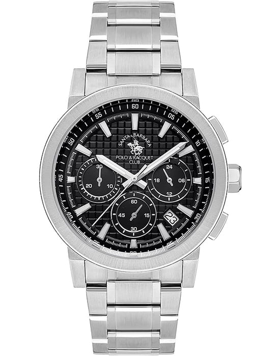 Santa Barbara Polo & Racquet Club — стильный мужской хронограф, сочетающий спортивную динамику и функциональность. Крупный корпус выполнен из нержавеющей стали и гармонично дополнен браслетом на застёжке-бабочке с кнопкамиЗастёжка "бабочка"Такой вид застёжки дополняется предохранителями, помогающими избежать случайного раскрытия браслета. Обладают изящным исполнением. .