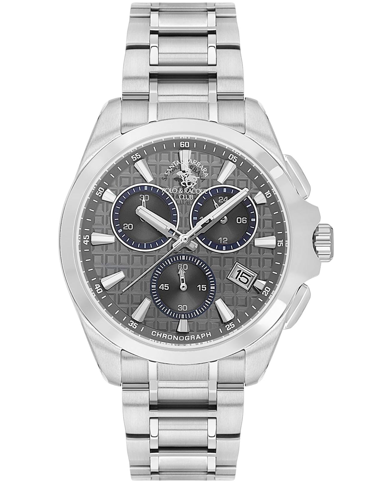 Мужские кварцевые часы-хронографХронографФункция позволяет измерять отрезки времени с особой точностью: часы, минуты, секунды. Верным признаком хронографа является наличие на циферблате 3 дополнительных окошек-счётчиков. с секундомеромСекундомерСекундоме́р — прибор, способный измерять интервалы времени с точностью до долей секунды. Santa Barbara Polo & Racquet Club SB.1.10591-4 — воплощение элегантности и технического совершенства. Корпус из нержавеющей стали серебристого цвета, диаметром 43 мм, что делает их устойчивыми к внешним воздействиям и придает благородный вид. Стрелки и метки с люминесцентным покрытиемЛюминесцентное покрытиеПозволяет считывать показания времени в темноте. Производители наносят на стрелки, часовые индексы, безель или поверхность циферблата светонакопительный состав, дающий холодное свечение., обеспечивающим хорошую читаемость в темноте. Циферблат защищён минеральным стекломМинеральное стеклоМинеральное стекло представляет собой искусственно выращенный минерал кварца. Такое стекло отличается особой устойчивостью к повреждениям и царапинам. Уступает по некоторым качествам сапфировому стеклу. устойчивое к царапинам и механическим повреждениям. 12-ти и 24-х часовой формат времени. Окошко даты находится в положении 4 часа. Фактурный циферблат с квадратными ячейками, украшен фирменным логотипом. Накладные метки в виде штрихов. Стальной браслет на раскладной застёжке с фиксаторомРаскладная застёжкаТакой тип застёжки используется только на браслетах из металла. Она никогда не раскрывается полностью, происходит разделение на 2 и более частей. Раскладывающая застёжка снизит вероятность потери часов к минимуму. обеспечивает комфортное и безопасное ношение. Водонепроницаемость 50 метров позволит защитить корпус от случайных брызг или капель дождя. Идеальный выбор для тех, кто ценит элегантный дизайн и качество.