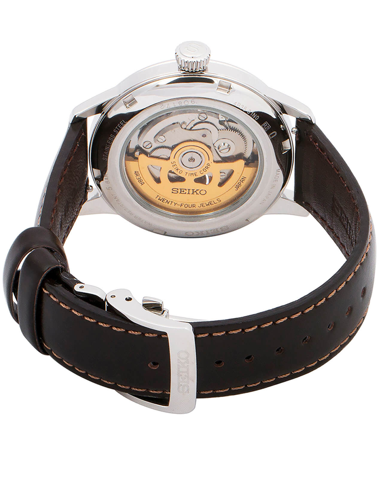 Модель – парный вариант мужских часов Seiko SSA407J1. Аксессуар наделён стильным циферблатом с элегантным узором. Скелетонизированная модель дополнена круглым окошком на метке 9 часов, что позволяет наблюдать за перемещением деталей. Этому способствует и прозрачная задняя крышка, выставляя напоказ работу японского автоматического механизма Seiko 4R38 с запасом хода 40 часов. Функция «stop-second» предоставляет возможность остановить часовой механизм для регулировки времени с точностью до секунды. Ремешок изготовлен из натуральной кожи. Циферблат защищён прочным минеральным стеклом Hardlex, устойчивым к царапинам. Диаметр корпуса: 33,8 мм.