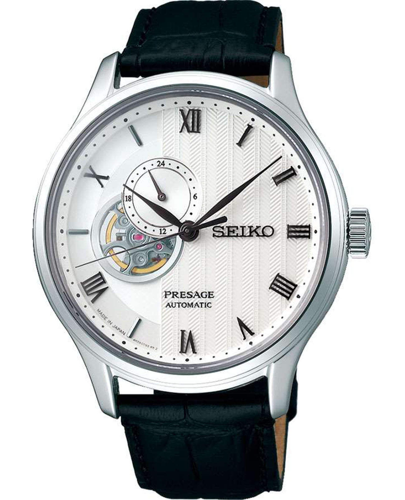 Мужские механические часы с автоподзаводом Seiko SARY095 — элегантное сочетание японской инженерии и классического дизайна. Круглый корпус размером 41 мм из нержавеющей стали, белый циферблат с римскими цифрами и частично скелетонизированным циферблатом, а также 24-часовой стрелкой. Стекло — сапфировоеСапфировое стеклоПрочный и надёжный материал из кристалла сапфира синтетического происхождения, характеризующийся особой твёрдостью и устойчивостью к царапинам и повреждениям.. Механизм японский калибр 4R39 (24 камня, запас хода 41 час), с функцией stop-second и возможностью ручного завода. Водонепроницаемость 30 м. Ремешок чёрный кожаный на раскладной застёжкеРаскладная застёжкаТакой тип застёжки используется только на браслетах из металла. Она никогда не раскрывается полностью, происходит разделение на 2 и более частей. Раскладывающая застёжка снизит вероятность потери часов к минимуму.. Задняя крышка — прозрачная и завинчивающаяся. Идеальный выбор для тех, кто ценит японское качество и классический стиль.