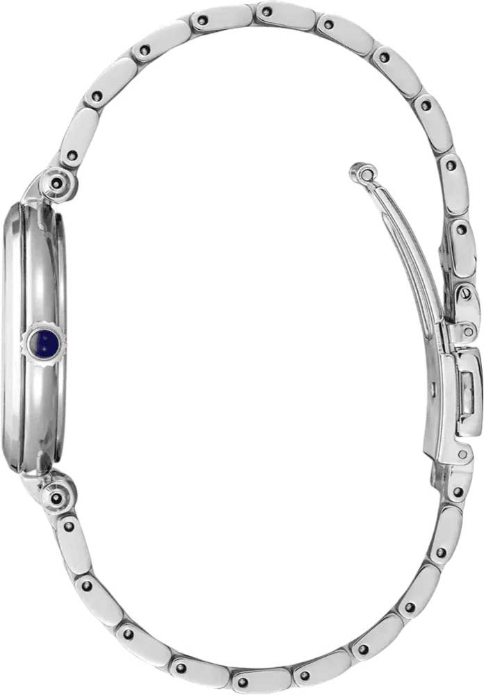 Женские японские часы Seiko Discover More SRZ553 c кварцевым механизмом с высокой точностью. Минеральное стеклоМинеральное стеклоМинеральное стекло представляет собой искусственно выращенный минерал кварца. Такое стекло отличается особой устойчивостью к повреждениям и царапинам. Уступает по некоторым качествам сапфировому стеклу., устойчивое к появлению царапин, обладающее высокой прозрачностью. Класс водозащиты: 50 метров, позволит плавать, нырять и заниматься другими водными видами спорта. Серебристый корпус и браслет часов изготовлен из нержавеющей стали. Заводная головка украшена камнем в форме кабошона. Браслет с тройной раскладной застёжкойРаскладная застёжкаТакой тип застёжки используется только на браслетах из металла. Она никогда не раскрывается полностью, происходит разделение на 2 и более частей. Раскладывающая застёжка снизит вероятность потери часов к минимуму.. Seiko — это гармония изящного дизайна и технологичной надёжности, компактный и стильный выбор для повседневной классики.