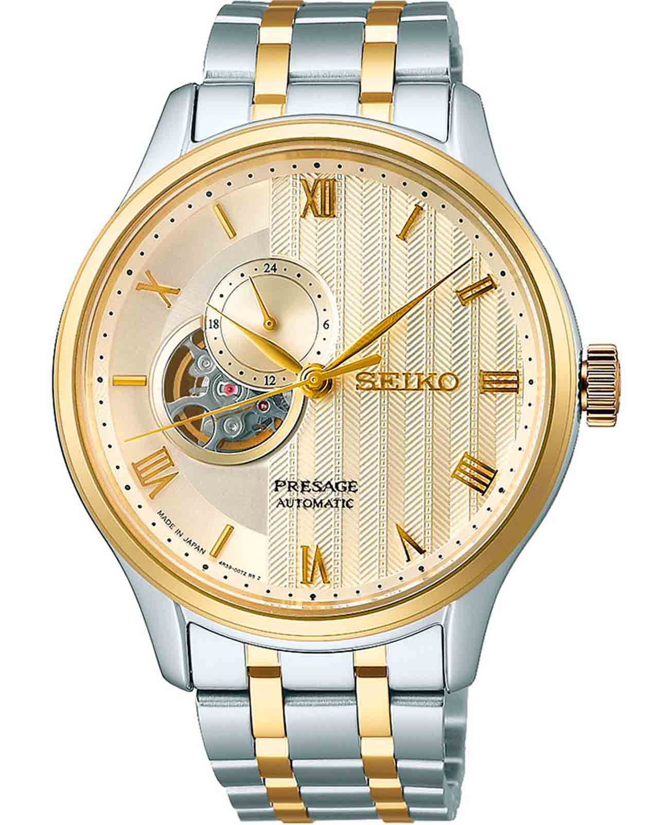 Модель Seiko SSA464J1 из коллекции Presage Japanese Garden — это элегантные автоматические часы, вдохновлённые эстетикой японских садов и философией дзен. Корпус диаметром 41,8 мм выполнен из нержавеющей стали с комбинированной полировкой и прозрачной задней крышкой. Водозащита составляет 30 метров — оптимально для повседневной носки. Фиксированный стальной безельБезельВнешний ободок, закрепляющий стекло. В спортивных часах так называется поворотное кольцо с делениями на циферблате, выполняет роль таймера – замеряет отрезки времени на шкале. Неподвижный безель – элемент декора. Однонаправленно вращающийся безель на дайверских часах позволяет фиксировать моменты погружения и выныривания на поверхность. с PVD-покрытиемPVDУльтратонкое покрытие наносится в технике вакуумного напыления, сочетает в себе нитрид титана особой прочности со слоем золота или оксида хрома. Несёт в себе декоративную или защитную функцию. подчёркивает гармоничные формы корпуса. Циферблат насыщенного цвета с тонкой текстурой напоминает волны гравия в японском саду. Открытое окно «open heart» на 9 часах позволяет наблюдать за работой механизма. В верхней части расположен индикатор запаса ходаШагомерШагоме́р или педо́метр — измерительный прибор для подсчёта количества сделанных шагов (или пар шагов) при ходьбе или беге.. Циферблат защищён двойным выпуклым сапфировым стекломСапфировое стеклоПрочный и надёжный материал из кристалла сапфира синтетического происхождения, характеризующийся особой твёрдостью и устойчивостью к царапинам и повреждениям. с внутренним антибликовым покрытиемАнтибликовое покрытиеСлой оксида металла в 0,13-0,3 микрон, благодаря которому стекло часов не бликует и не отражает свет. Антибликовое покрытие уменьшает отражение света в 10 раз, обеспечивая отличную читаемость показателей циферблата., устойчивым к царапинам и бликам. Внутри установлен автоматический калибр Seiko 4R39 с ручным подзаводом, функцией остановки секундной стрелки и запасом хода до 41 часа. Браслет выполнен из нержавеющей стали и оснащён удобной застёжкой «бабочка» с кнопкамиЗастёжка "бабочка"Такой вид застёжки дополняется предохранителями, помогающими избежать случайного раскрытия браслета. Обладают изящным исполнением. . Seiko — это стильное и сбалансированное решение для ценителей классики с японским характером, где сочетаются глубокий дизайн и надёжная механика.