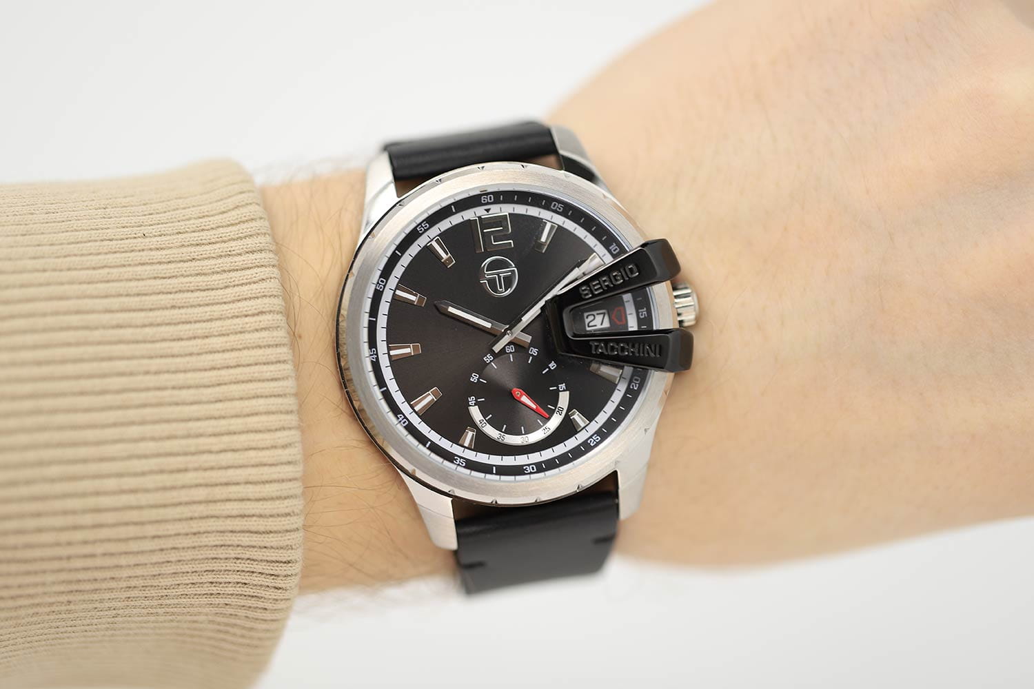 Мужские кварцевые часы Sergio Tacchini из коллекции Archivio — это стильный аксессуар для активного образа жизни. Корпус диаметром 45 мм выполнен из нержавеющей стали 316L. Циферблат чёрного цвета оформлен по технологии Sunray («солнечные лучи»), дополнен индексами и стрелками. Окошко даты расположено в положении 3 часов, секундная стрелка вынесена на отдельный субциферблат. Циферблат защищён минеральным стекломМинеральное стеклоМинеральное стекло представляет собой искусственно выращенный минерал кварца. Такое стекло отличается особой устойчивостью к повреждениям и царапинам. Уступает по некоторым качествам сапфировому стеклу.. Часы оснащены кожаным ремешком чёрного цвета с раскладной застёжкойРаскладная застёжкаТакой тип застёжки используется только на браслетах из металла. Она никогда не раскрывается полностью, происходит разделение на 2 и более частей. Раскладывающая застёжка снизит вероятность потери часов к минимуму.. Водонепроницаемость 50 м позволяет использовать часы в повседневных условиях. Надёжный выбор для тех, кто ценит качество и современный дизайн.