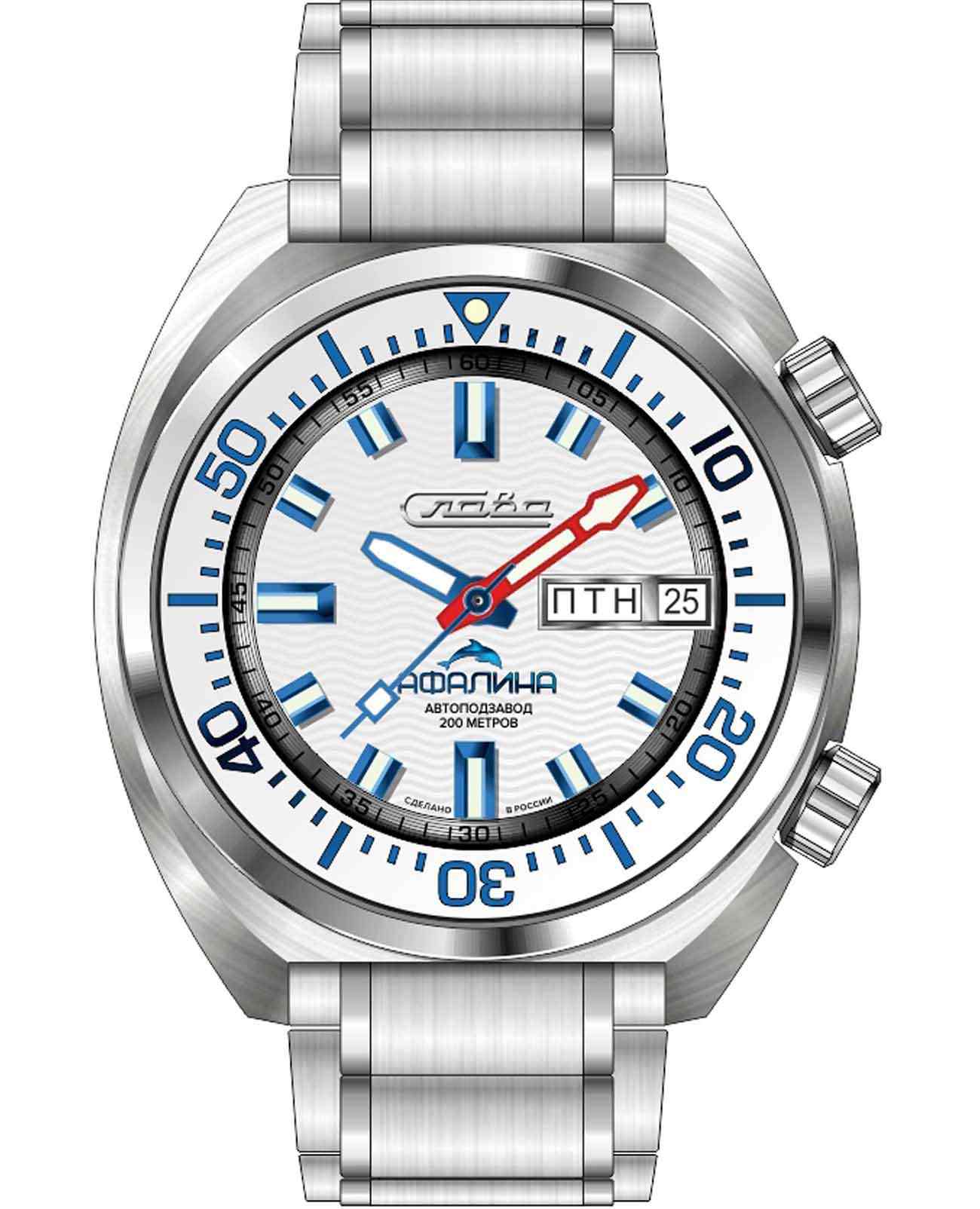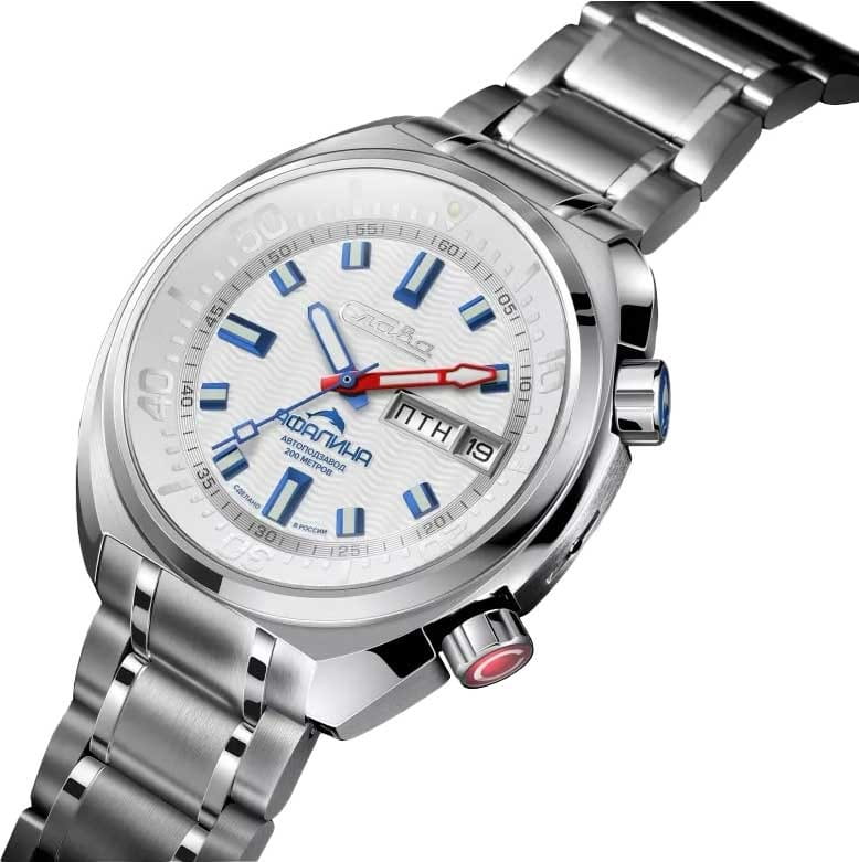 Коллекционные часы Слава Афалина 2430582/100-2427 — это превосходный выбор для тех, кто ценит стиль и функциональность. Модель из лимитированной серии, состоящей всего из 500 экземпляров, отличается прочным стальным корпусом и предназначена для любителей дайвинга. Часы оснащены надежным механическим механизмом с автоподзаводом и водозащитой до 200 метров, что делает их идеальными для подводных приключений. Белый циферблат дополняется стрелками с люминесцентным покрытиемЛюминесцентное покрытиеПозволяет считывать показания времени в темноте. Производители наносят на стрелки, часовые индексы, безель или поверхность циферблата светонакопительный состав, дающий холодное свечение. для отличной видимости в условиях низкой освещенности, а сапфировое стеклоСапфировое стеклоПрочный и надёжный материал из кристалла сапфира синтетического происхождения, характеризующийся особой твёрдостью и устойчивостью к царапинам и повреждениям. с антибликовым покрытиемАнтибликовое покрытиеСлой оксида металла в 0,13-0,3 микрон, благодаря которому стекло часов не бликует и не отражает свет. Антибликовое покрытие уменьшает отражение света в 10 раз, обеспечивая отличную читаемость показателей циферблата. защищает от царапин и бликов. Основная заводная головка расположена на корпусе ближе к отметке ''4 часа'', она позволяет настраивать время и заводить часы перед погружением. С помощью второй головки, расположенной у отметки ''2 часа'', можно управлять вращающимся внутренним кольцом безеляБезельВнешний ободок, закрепляющий стекло. В спортивных часах так называется поворотное кольцо с делениями на циферблате, выполняет роль таймера – замеряет отрезки времени на шкале. Неподвижный безель – элемент декора. Однонаправленно вращающийся безель на дайверских часах позволяет фиксировать моменты погружения и выныривания на поверхность. с PVDPVDУльтратонкое покрытие наносится в технике вакуумного напыления, сочетает в себе нитрид титана особой прочности со слоем золота или оксида хрома. Несёт в себе декоративную или защитную функцию. покрытием белого цвета и фиксировать его в нужном положении. Окошко даты и дня недели удобно расположено на отметке "3 часа", а профессиональная "дайвинг-застежка" стального браслета имеет удлинение для гидрокостюма. Особая забота о природе: часть средств от продажи данной модели перечисляется в центр спасения дельфинов "Дельфа". Часы серии "Афалина" — это не только функциональный аксессуар, но и символ вашей поддержки благородного дела.