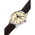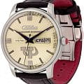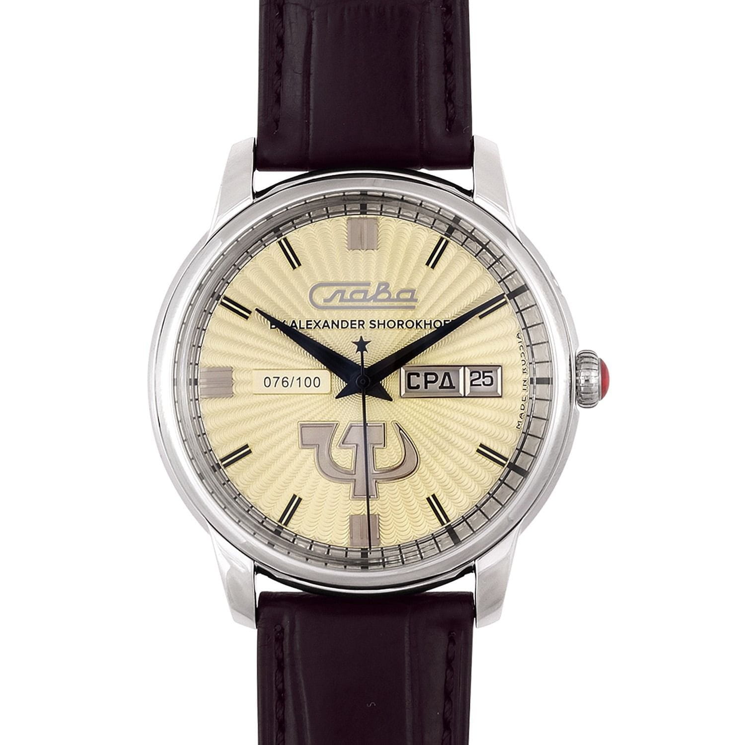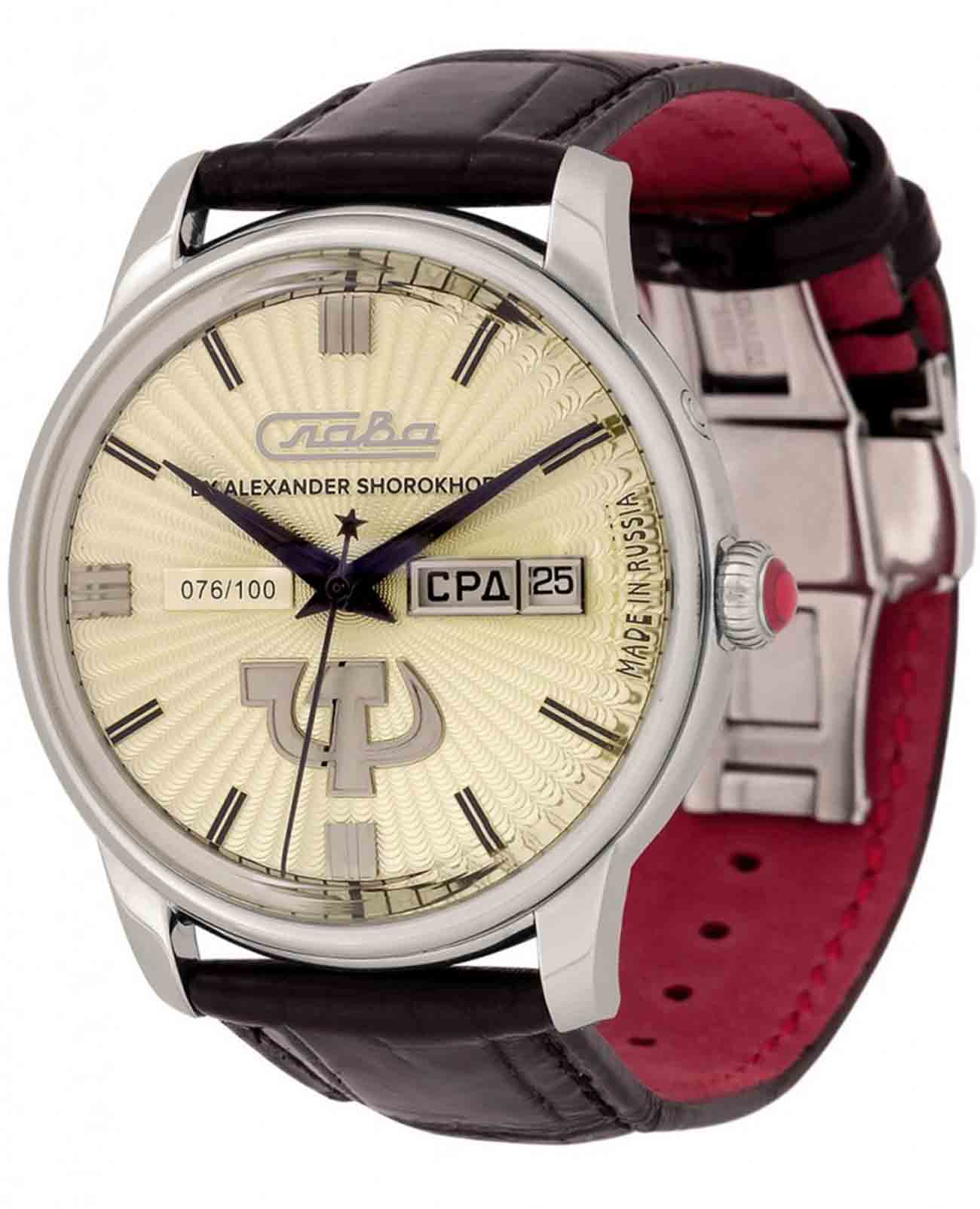 Российские механические часы с автоподзаводом Слава Революция 2600270/300-2427 созданы для тех, кто ценит стиль и надежность. Эта модель является плодом сотрудничества Часовой компании «Слава» и знаменитого мастера Александра Шорохова, который известен своим вкладом в возрождение российского часового мастерства и продвижение культуры в мире. Эти часы выполнены в соответствии с эскизами мастера, с использованием революционных символов — серпа и молота. Часы Слава «Революция» обладают механизмом с автоподзаводом «Слава 2427», украшенным ручной гравировкой, который можно наблюдать через прозрачную заднюю крышку. Этот механизм обеспечивает надежность и точность, а также добавляет элемент эксклюзивности. Корпус часов выполнен из стали и имеет серебристый оттенок, который гармонично сочетается с бежевым циферблатом. Диаметр корпуса составляет 44 мм, а толщина — 14,5 мм, что делает часы выразительными и комфортными для носки.  Сапфировое стеклоСапфировое стеклоПрочный и надёжный материал из кристалла сапфира синтетического происхождения, характеризующийся особой твёрдостью и устойчивостью к царапинам и повреждениям. защищает циферблат от царапин и обеспечивает долгий срок службы. Часы оснащены функцией двойного календаря, который отображает дату, что добавляет практичности в повседневной носке. Натуральный кожаный ремешок с застежкой «бабочка»Застёжка "бабочка"Такой вид застёжки дополняется предохранителями, помогающими избежать случайного раскрытия браслета. Обладают изящным исполнением. завершают образ, обеспечивая удобство и стиль. С водонепроницаемостью до 100 метров эти часы подходят для активного образа жизни, позволяя не беспокоиться о случайных контактах с водой, таких как плавание или дождь. Слава «Революция» выпускаются ограниченной серией — в трех видах по 100 штук.