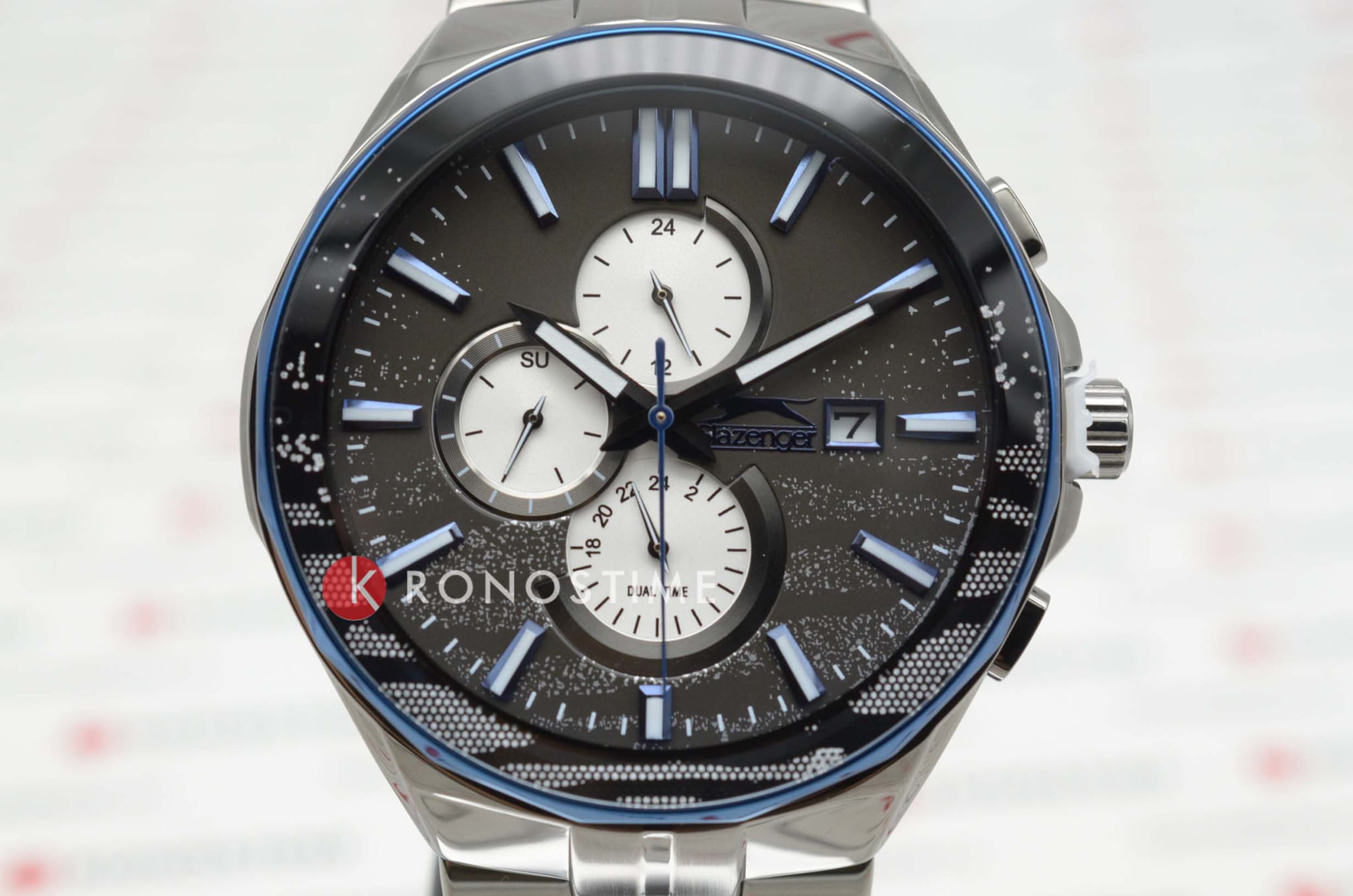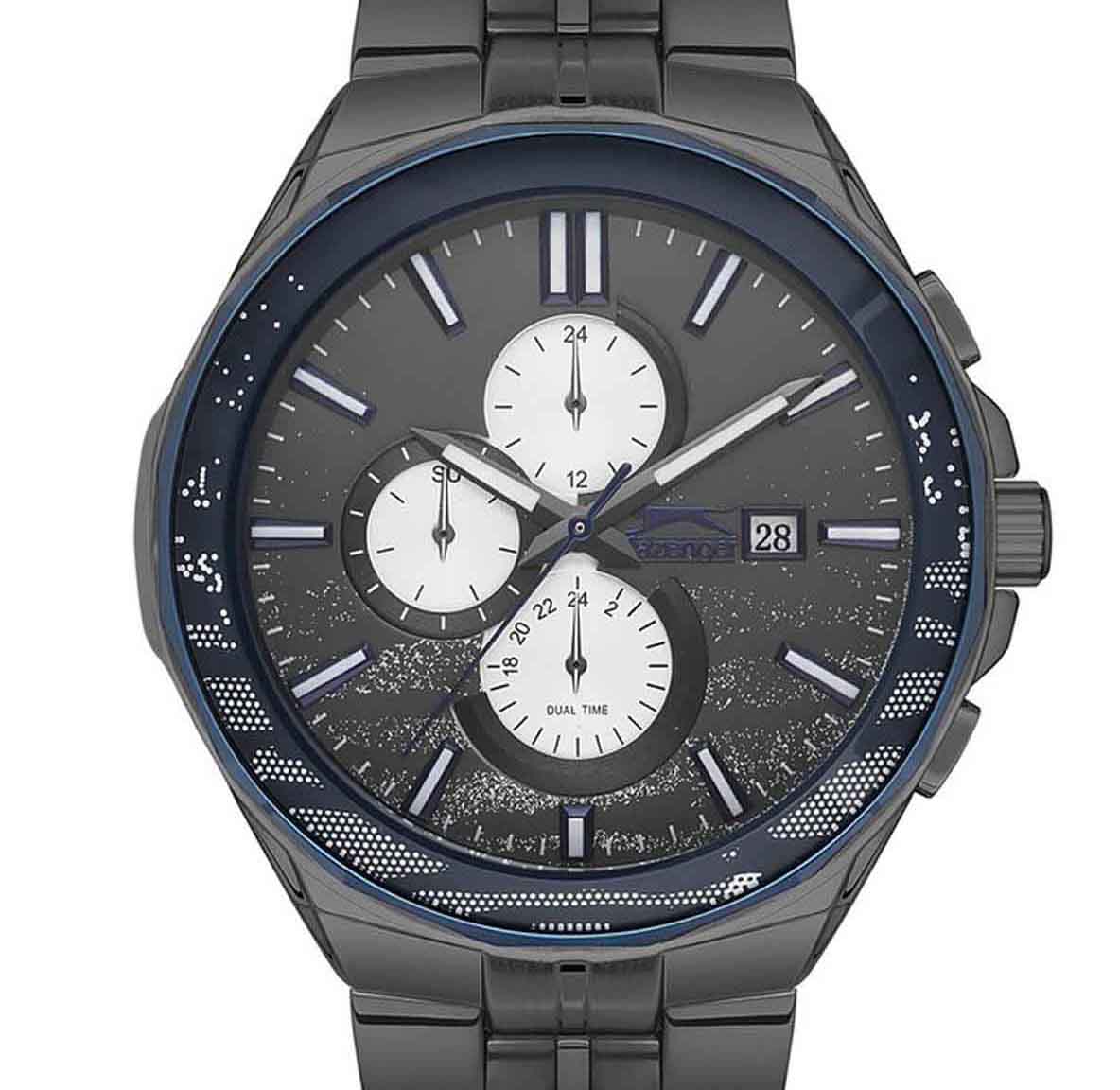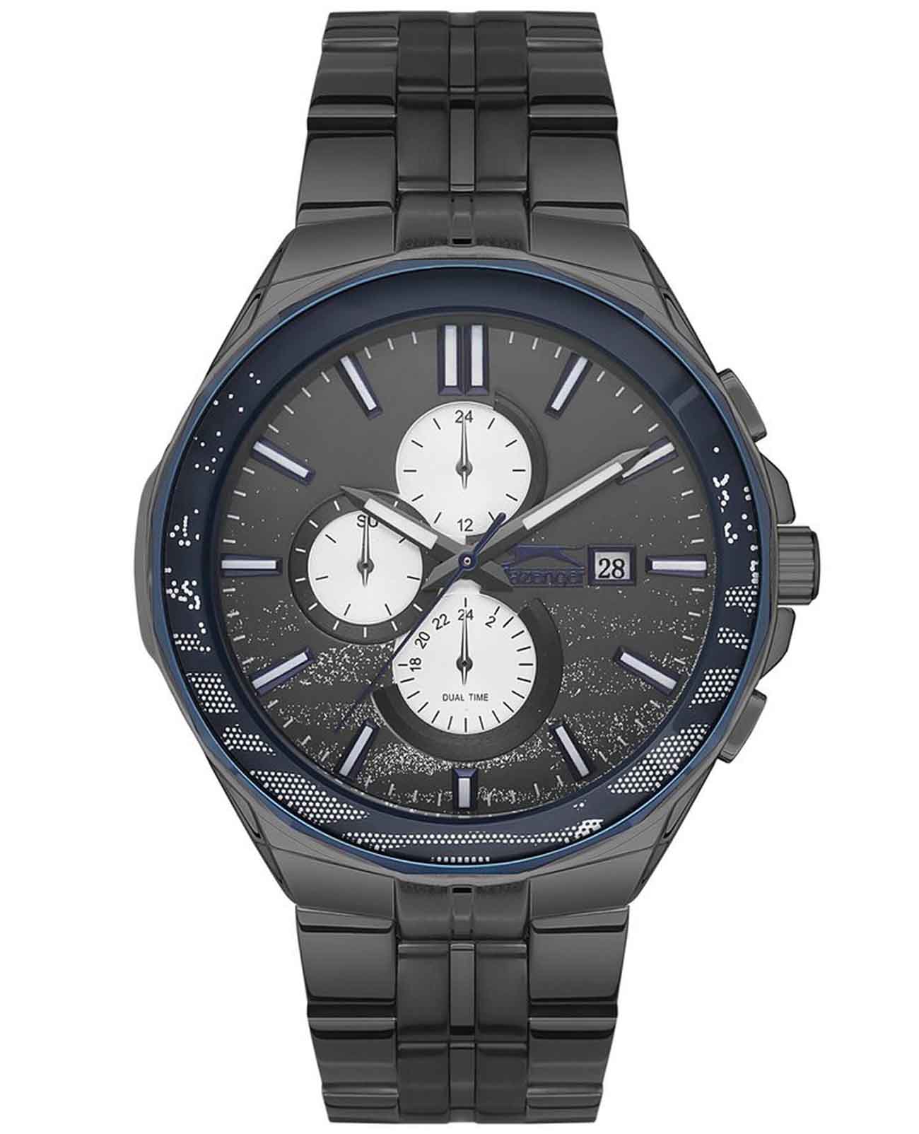 Часы Slazenger SL.09.2129.2.02 воплощают в себе элегантность и практичность, идеально подходящие для современных мужчин. Их черный циферблат, защищенный минеральным стекломМинеральное стеклоМинеральное стекло представляет собой искусственно выращенный минерал кварца. Такое стекло отличается особой устойчивостью к повреждениям и царапинам. Уступает по некоторым качествам сапфировому стеклу., заключен в такой же черный корпус диаметром 47 мм и темно-синий безельБезельВнешний ободок, закрепляющий стекло. В спортивных часах так называется поворотное кольцо с делениями на циферблате, выполняет роль таймера – замеряет отрезки времени на шкале. Неподвижный безель – элемент декора. Однонаправленно вращающийся безель на дайверских часах позволяет фиксировать моменты погружения и выныривания на поверхность., которые изготовлены из прочного суперметалла с IP-покрытиемIP-покрытиеМетод ионного напыления. Демонстрирует повышенную устойчивость к истиранию, окислению и химическим веществам. Под воздействием высокого давления и температуры около 1500°C молекулы металла надёжно соединяются с частицами корпуса часов.. Часы оснащены двойным форматом времени (12 и 24 часа), вторым часовым поясом и удобным окошком даты. Надежный кварцевый механизм обеспечивает точность, а водозащита 5 ATM делает их устойчивыми к воздействию воды. Стальной браслет из суперметалла с IP-покрытиемIP-покрытиеМетод ионного напыления. Демонстрирует повышенную устойчивость к истиранию, окислению и химическим веществам. Под воздействием высокого давления и температуры около 1500°C молекулы металла надёжно соединяются с частицами корпуса часов. с раскладной застёжкойРаскладная застёжкаТакой тип застёжки используется только на браслетах из металла. Она никогда не раскрывается полностью, происходит разделение на 2 и более частей. Раскладывающая застёжка снизит вероятность потери часов к минимуму. подчеркивает современный стиль и комфортно сидит на запястье. Часы оснащены 24-часовым указателем времени, а также функциями отображения даты и дня недели. Люминесцентное покрытиеЛюминесцентное покрытиеПозволяет считывать показания времени в темноте. Производители наносят на стрелки, часовые индексы, безель или поверхность циферблата светонакопительный состав, дающий холодное свечение. на стрелках и метках обеспечивает отличную видимость в темноте.