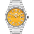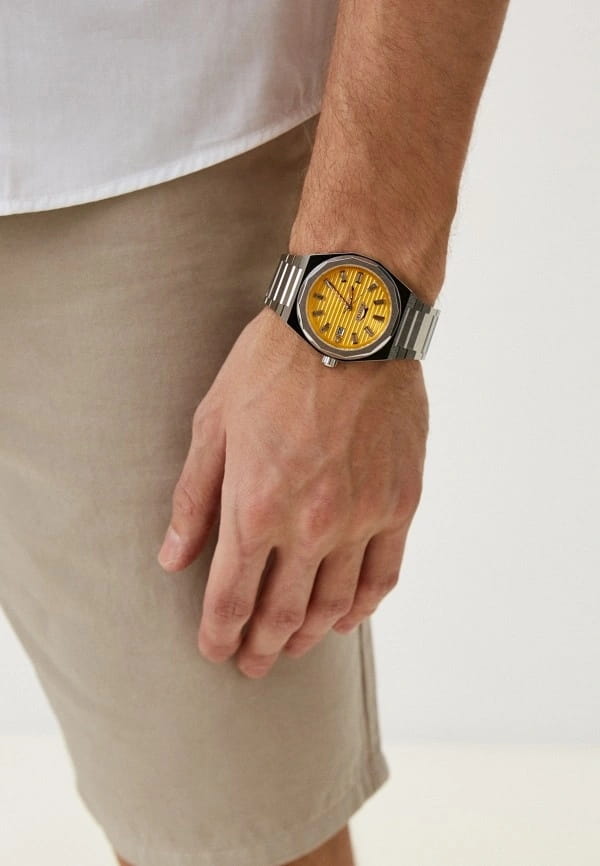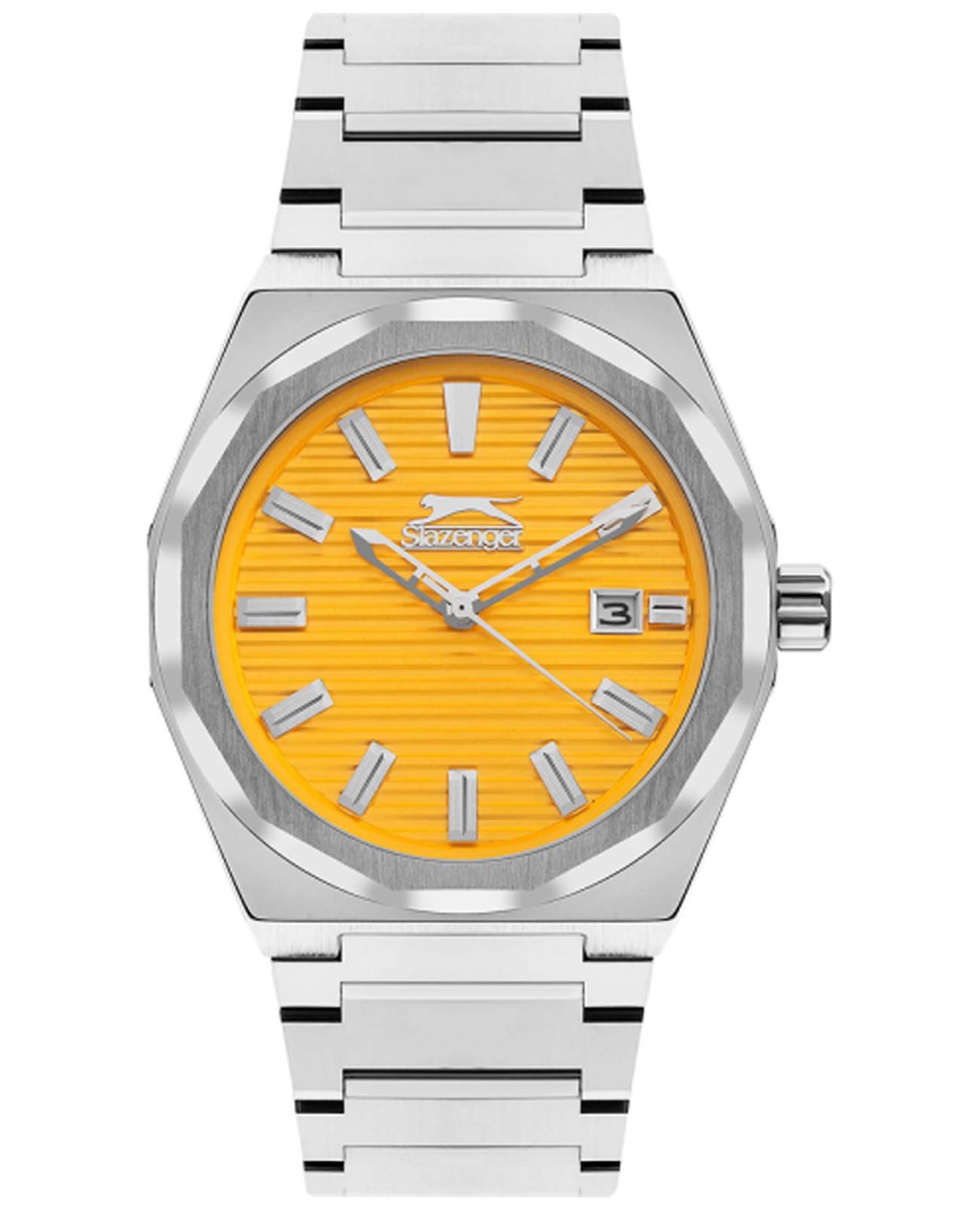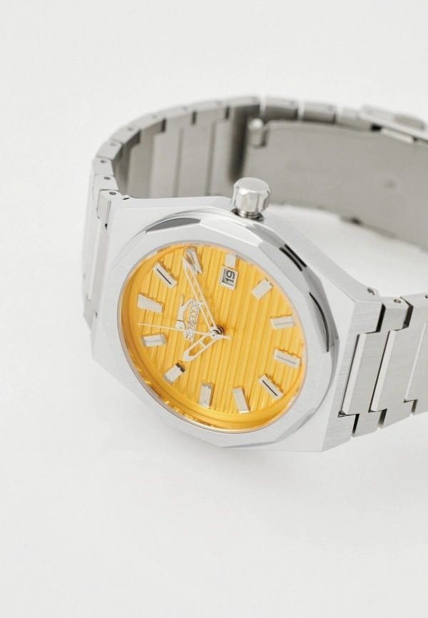 Часы Slazenger SL.09.2143.1.06  воплощают в себе элегантность и практичность, идеально подходящие для современных мужчин. Их желтый циферблат защищен минеральным стекломМинеральное стеклоМинеральное стекло представляет собой искусственно выращенный минерал кварца. Такое стекло отличается особой устойчивостью к повреждениям и царапинам. Уступает по некоторым качествам сапфировому стеклу. и заключен в серебристый корпус диаметром 41,5 мм, который изготовлен из прочного суперметалла. Окошко даты расположено в положении 3 часов. Надежный кварцевый механизм обеспечивает точность, а водозащита 5 ATM делает их устойчивыми к воздействию воды. Браслет из суперметалла имеет раскладную застёжкуРаскладная застёжкаТакой тип застёжки используется только на браслетах из металла. Она никогда не раскрывается полностью, происходит разделение на 2 и более частей. Раскладывающая застёжка снизит вероятность потери часов к минимуму., что подчеркивает современный стиль и позволяет легко снимать часы. Ширина браслета 22-26 мм.
