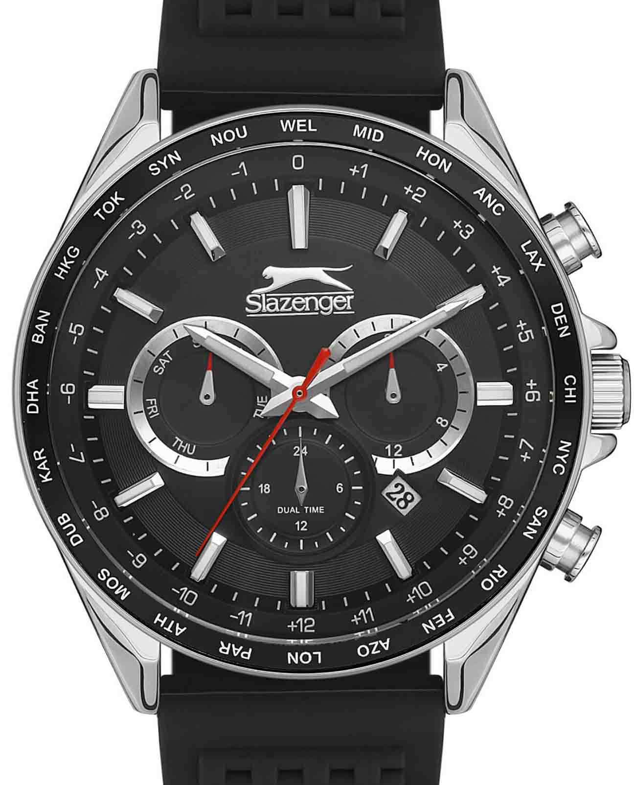 Мужские наручные часы Slazenger SL.09.2179.2.01 — стильный аксессуар с ярко выраженными спортивными чертами, который станет надежным спутником в повседневной жизни. Эти часы оснащены кварцевым механизмом, обеспечивающим высокую точность хода. Металлический корпус в сочетании с черным силиконовый ремешком на классической застежке шириной 22 мм создает гармоничный и современный образ. Диаметр корпуса составляет 45 мм, а толщина — 11 мм, что придает часам стильный и выразительный вид. БезельБезельВнешний ободок, закрепляющий стекло. В спортивных часах так называется поворотное кольцо с делениями на циферблате, выполняет роль таймера – замеряет отрезки времени на шкале. Неподвижный безель – элемент декора. Однонаправленно вращающийся безель на дайверских часах позволяет фиксировать моменты погружения и выныривания на поверхность. с черным IP-покрытиемIP-покрытиеМетод ионного напыления. Демонстрирует повышенную устойчивость к истиранию, окислению и химическим веществам. Под воздействием высокого давления и температуры около 1500°C молекулы металла надёжно соединяются с частицами корпуса часов., что придает ему дополнительную прочность и устойчивость к износу. Минеральное стеклоМинеральное стеклоМинеральное стекло представляет собой искусственно выращенный минерал кварца. Такое стекло отличается особой устойчивостью к повреждениям и царапинам. Уступает по некоторым качествам сапфировому стеклу. защищает циферблат от царапин и внешних воздействий, а водозащита уровня WR 50 позволяет не беспокоиться о случайных контактах с водой, будь то дождь или мытье рук. Особенностью данной модели является наличие календаря, отображающего дату и день недели, а также возможность следить за временем во втором часовом поясе. Люминесцентное покрытиеЛюминесцентное покрытиеПозволяет считывать показания времени в темноте. Производители наносят на стрелки, часовые индексы, безель или поверхность циферблата светонакопительный состав, дающий холодное свечение. на стрелках и метках обеспечивает отличную видимость в темноте.