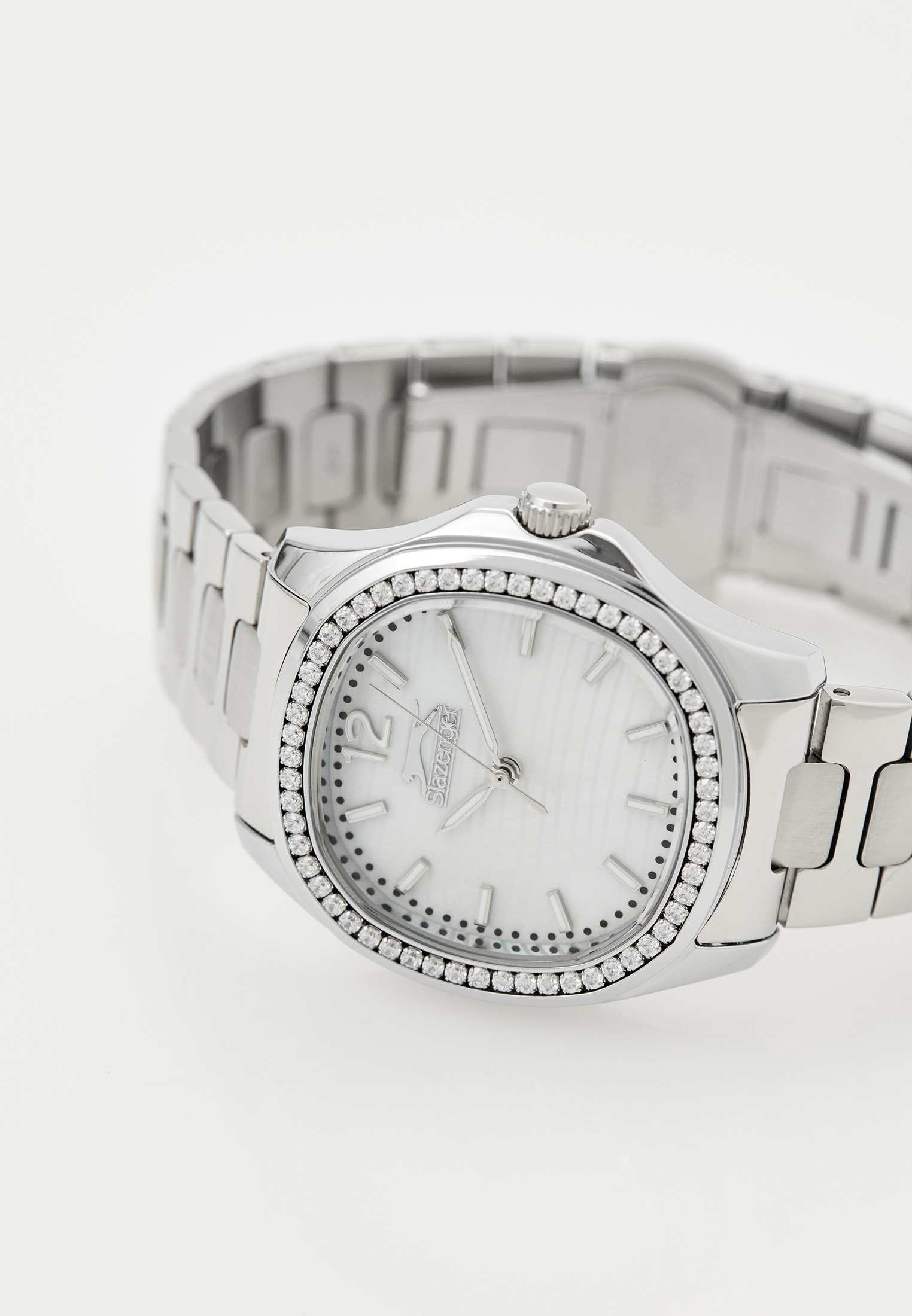 Часы Slazenger SL.09.2238.3.01 – это изысканный аксессуар, который станет стильным акцентом любого образа. Модель оснащена надежным кварцевым механизмом. Корпус из прочного металла размером 34х34 мм украшен россыпью сверкающих фианитов по безелюБезельВнешний ободок, закрепляющий стекло. В спортивных часах так называется поворотное кольцо с делениями на циферблате, выполняет роль таймера – замеряет отрезки времени на шкале. Неподвижный безель – элемент декора. Однонаправленно вращающийся безель на дайверских часах позволяет фиксировать моменты погружения и выныривания на поверхность., что придает часам особое сияние и элегантность. Белый перламутровый циферблат с логотипом бренда защищен стойким к царапинам минеральным стекломМинеральное стеклоМинеральное стекло представляет собой искусственно выращенный минерал кварца. Такое стекло отличается особой устойчивостью к повреждениям и царапинам. Уступает по некоторым качествам сапфировому стеклу.. Четкие часовые метки в виде лаконичных штрихов и крупная арабская цифра 12 обеспечивают удобство чтения времени. Заводная головка с рифлением дополнена защитой для повышения долговечности. Металлический браслет шириной 18 мм надежно фиксируется на запястье с помощью застежки «бабочка»Застёжка "бабочка"Такой вид застёжки дополняется предохранителями, помогающими избежать случайного раскрытия браслета. Обладают изящным исполнением. . Для удобства использования в темное время суток предусмотрено люминесцентное покрытиеЛюминесцентное покрытиеПозволяет считывать показания времени в темноте. Производители наносят на стрелки, часовые индексы, безель или поверхность циферблата светонакопительный состав, дающий холодное свечение. стрелок. Водозащита 30WR позволяет не беспокоиться о случайных брызгах. Вес изделия составляет 92 грамма, что делает часы комфортными для ежедневного ношения. Эти часы идеально подойдут для тех, кто ценит гармонию стиля, качества и функциональности.