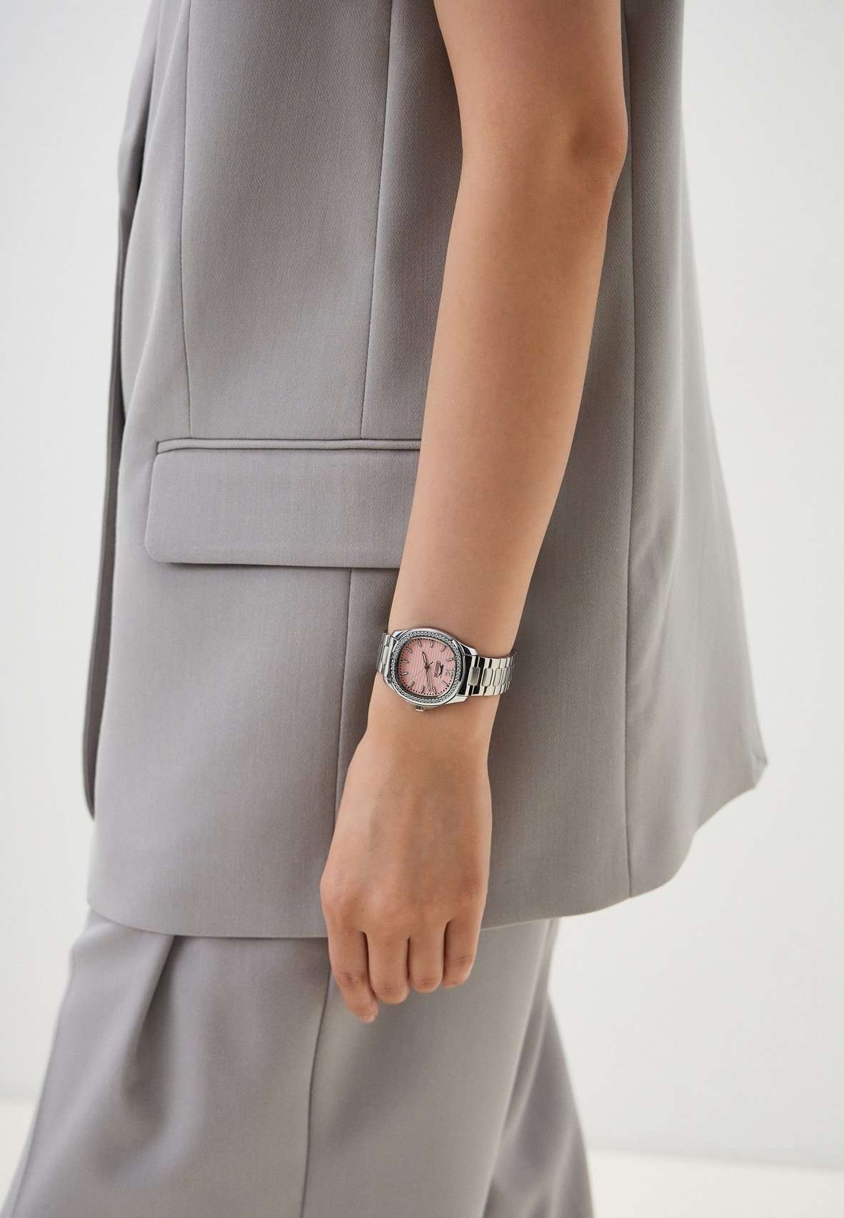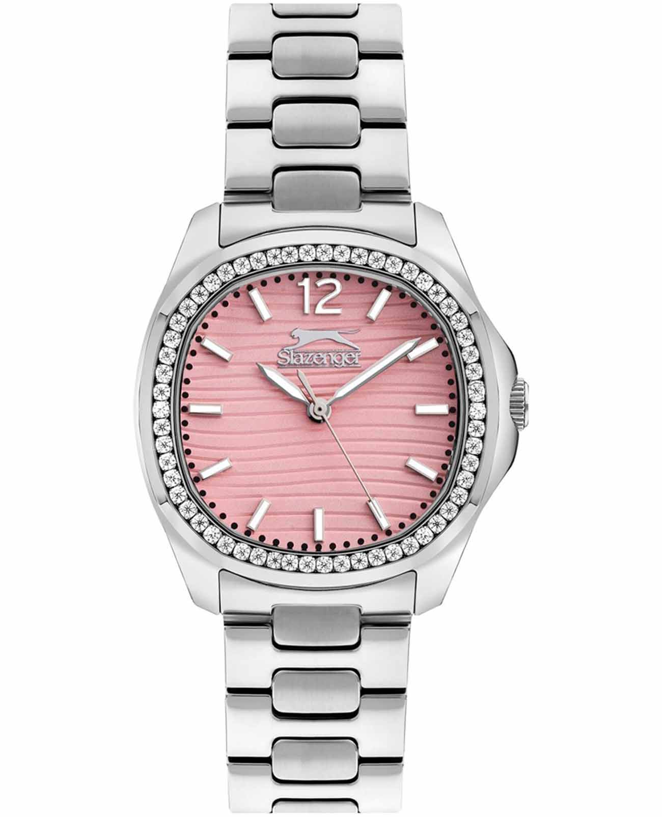 Часы Slazenger SL.09.2238.3.09 – это изысканный аксессуар, который станет стильным акцентом любого образа. Модель оснащена надежным кварцевым механизмом. Корпус из прочного металла размером 34х34 мм украшен россыпью сверкающих фианитов по безелюБезельВнешний ободок, закрепляющий стекло. В спортивных часах так называется поворотное кольцо с делениями на циферблате, выполняет роль таймера – замеряет отрезки времени на шкале. Неподвижный безель – элемент декора. Однонаправленно вращающийся безель на дайверских часах позволяет фиксировать моменты погружения и выныривания на поверхность., что придает часам особое сияние и элегантность. Розовый циферблат с логотипом бренда защищен стойким к царапинам минеральным стекломМинеральное стеклоМинеральное стекло представляет собой искусственно выращенный минерал кварца. Такое стекло отличается особой устойчивостью к повреждениям и царапинам. Уступает по некоторым качествам сапфировому стеклу.. Четкие часовые метки в виде лаконичных штрихов и крупная арабская цифра 12 обеспечивают удобство чтения времени. Заводная головка с рифлением дополнена защитой для повышения долговечности. Металлический браслет шириной 18 мм надежно фиксируется на запястье с помощью застежки «бабочка»Застёжка "бабочка"Такой вид застёжки дополняется предохранителями, помогающими избежать случайного раскрытия браслета. Обладают изящным исполнением. . Для удобства использования в темное время суток предусмотрено люминесцентное покрытиеЛюминесцентное покрытиеПозволяет считывать показания времени в темноте. Производители наносят на стрелки, часовые индексы, безель или поверхность циферблата светонакопительный состав, дающий холодное свечение. стрелок. Водозащита 30WR позволяет не беспокоиться о случайных брызгах. Вес изделия составляет 92 грамма, что делает часы комфортными для ежедневного ношения. Эти часы идеально подойдут для тех, кто ценит гармонию стиля, качества и функциональности.