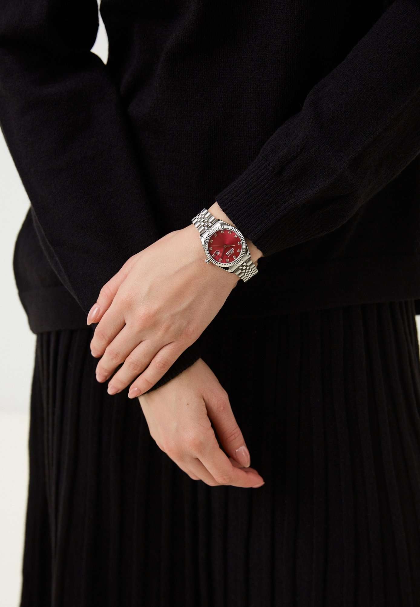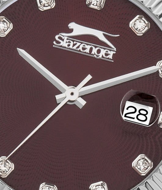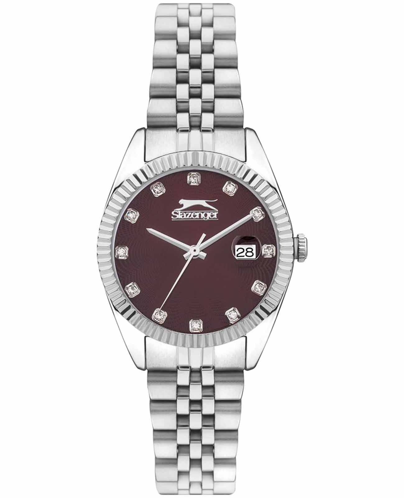 Эти женские часы Slazenger SL.09.2240.3.04 сочетают стильный дизайн и практичность. Корпус, браслет и рифленый безельБезельВнешний ободок, закрепляющий стекло. В спортивных часах так называется поворотное кольцо с делениями на циферблате, выполняет роль таймера – замеряет отрезки времени на шкале. Неподвижный безель – элемент декора. Однонаправленно вращающийся безель на дайверских часах позволяет фиксировать моменты погружения и выныривания на поверхность. выполнены из прочного металла серебристого цвета, что придает аксессуару элегантный и современный вид. Бордовый циферблат украшен кристаллами, что добавляет часам изысканности и утонченности, также он дополнен функцией календаря, отображающей число месяца. Модель оснащена кварцевым механизмом, который обеспечивает точность хода, а также функцией отображения даты с увеличительным стеклом для удобства просмотра. Минеральное стеклоМинеральное стеклоМинеральное стекло представляет собой искусственно выращенный минерал кварца. Такое стекло отличается особой устойчивостью к повреждениям и царапинам. Уступает по некоторым качествам сапфировому стеклу. защищает циферблат от царапин, водозащита уровня WR 30 позволяет выдерживать случайные брызги воды. Удобная раскладная застёжкаРаскладная застёжкаТакой тип застёжки используется только на браслетах из металла. Она никогда не раскрывается полностью, происходит разделение на 2 и более частей. Раскладывающая застёжка снизит вероятность потери часов к минимуму. обеспечивает надежную фиксацию на запястье. Диаметр корпуса составляет 32 мм, ширина браслета — 16 мм, толщина корпуса — 9 мм, вес часов — 80 граммов. В комплект входит фирменная упаковка, инструкция на русском языке и гарантийный талон. Гарантия на изделие составляет 1 год.
