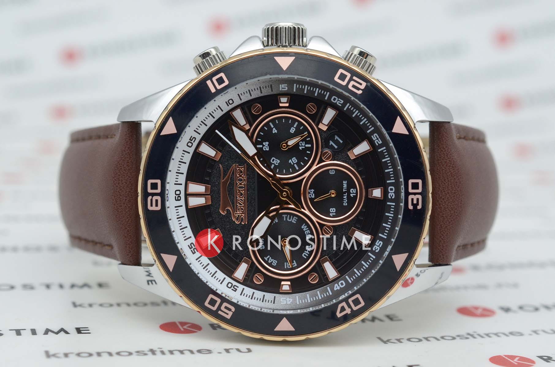 Часы Slazenger SL.09.2251.2.04 — это стильная и практичная модель, выполненная в элегантном серебристом цвете. Корпус изготовлен из металла, что обеспечивает прочность и долговечность. На розово-золотистый безельБезельВнешний ободок, закрепляющий стекло. В спортивных часах так называется поворотное кольцо с делениями на циферблате, выполняет роль таймера – замеряет отрезки времени на шкале. Неподвижный безель – элемент декора. Однонаправленно вращающийся безель на дайверских часах позволяет фиксировать моменты погружения и выныривания на поверхность. нанесено черное IP-покрытиеIP-покрытиеМетод ионного напыления. Демонстрирует повышенную устойчивость к истиранию, окислению и химическим веществам. Под воздействием высокого давления и температуры около 1500°C молекулы металла надёжно соединяются с частицами корпуса часов.. Минеральное стеклоМинеральное стеклоМинеральное стекло представляет собой искусственно выращенный минерал кварца. Такое стекло отличается особой устойчивостью к повреждениям и царапинам. Уступает по некоторым качествам сапфировому стеклу. надежно защищает черный циферблат от царапин и повреждений. Классический кожаный ремешок коричневого цвета шириной 22 мм удобно фиксируется на запястье с помощью классической застежки. Диаметр корпуса составляет 44 мм, а толщина — 12 мм, благодаря чему часы смотрятся солидно и современно. Модель оснащена кварцевым механизмом, отличающимся точностью и надежностью. На циферблате представлены дополнительные малые циферблаты для отображения второго часового поясаВторой часовой поясФункция, позволяющая отображать время двух часовых поясов одновременно., дня недели и времени в 24-часовом формате, а также имеется отдельное окошко даты. Для удобства использования в темное время суток предусмотрено люминесцентное покрытиеЛюминесцентное покрытиеПозволяет считывать показания времени в темноте. Производители наносят на стрелки, часовые индексы, безель или поверхность циферблата светонакопительный состав, дающий холодное свечение. стрелок и меток. Заводная головка оснащена защитой. Водозащита уровня WR 50 позволяет не снимать часы при мытье рук или попадании под дождь. Вес модели составляет 70 грамм.