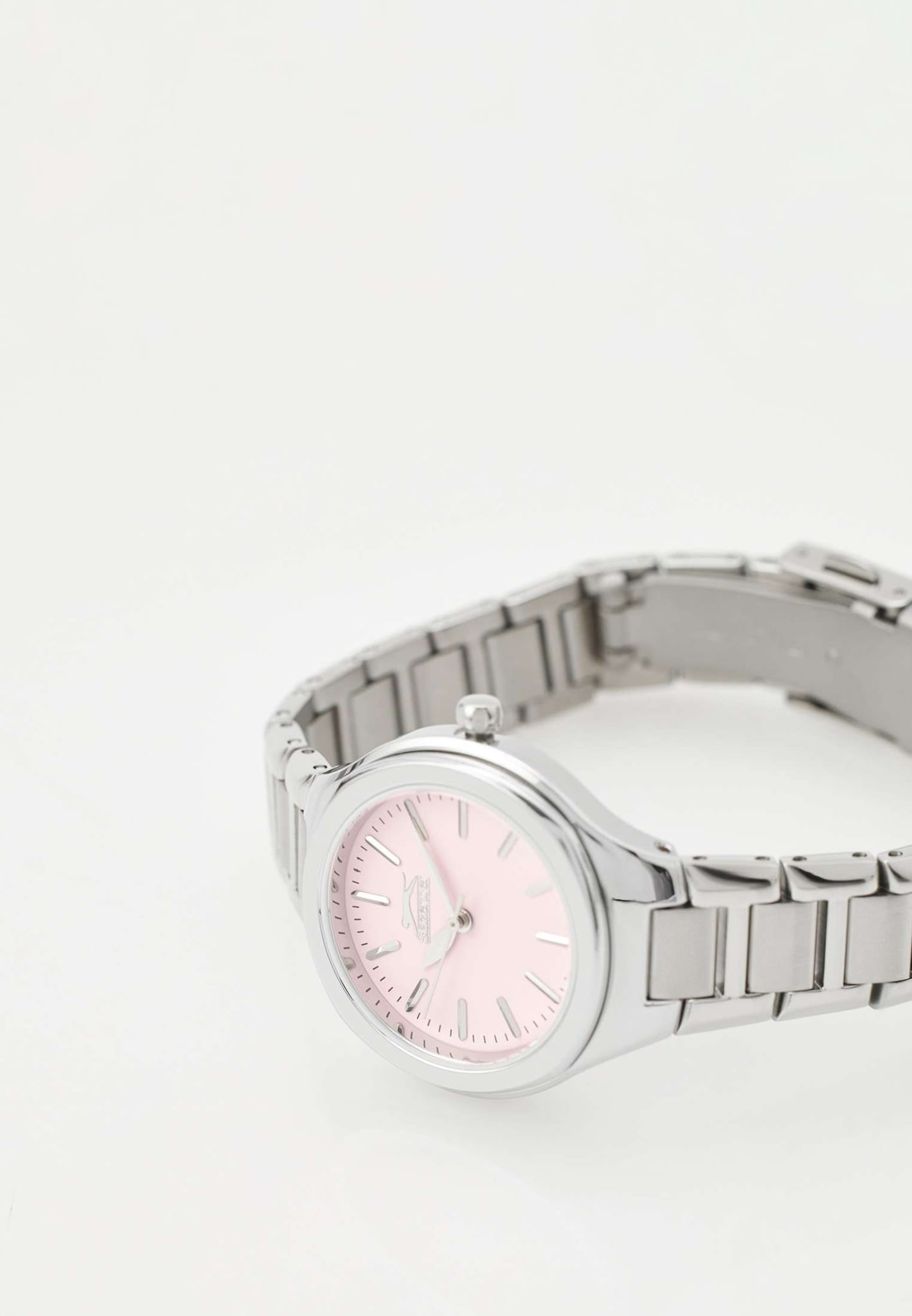 Часы Slazenger SL.09.2254.3.06 — это стильный и надежный аксессуар, который подчеркнет ваш индивидуальный образ. Корпус и браслет выполнены из инновационного суперметалла — сплава на основе меди с пониженным содержанием цинка и никеля, обладающего особой прочностью и долговечностью благодаря специальной технологии покрытия. Модель оснащена точным кварцевым механизмом, который обеспечивает стабильную работу и не требует ежедневного завода. Под прочным минеральным стекломМинеральное стеклоМинеральное стекло представляет собой искусственно выращенный минерал кварца. Такое стекло отличается особой устойчивостью к повреждениям и царапинам. Уступает по некоторым качествам сапфировому стеклу. расположен лаконичный розовый циферблат, придающий часам элегантный и современный вид. Стальной браслет с раскладной застёжкойРаскладная застёжкаТакой тип застёжки используется только на браслетах из металла. Она никогда не раскрывается полностью, происходит разделение на 2 и более частей. Раскладывающая застёжка снизит вероятность потери часов к минимуму. обеспечивает комфортную посадку. Диаметр корпуса составляет 32 мм, толщина — 8 мм, что делает часы аккуратными и удобными для повседневного ношения. Класс водозащиты 3 атмосферы защищает механизм от случайных брызг и капель дождя.