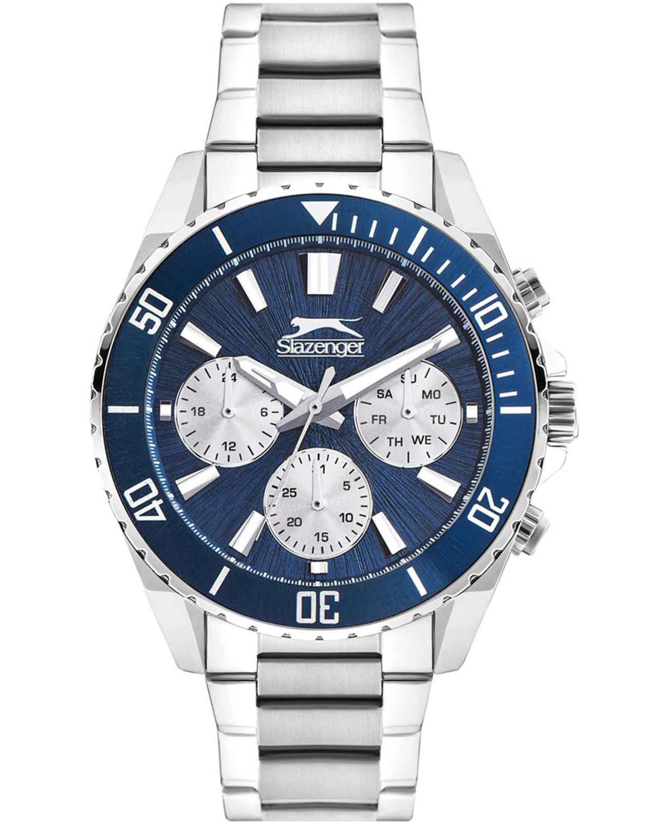 Часы Slazenger SL.09.2273.2.02 – стильный и функциональный аксессуар, который станет достойным дополнением к вашему образу. Модель оснащена надежным кварцевым механизмом, заключенным в корпус из инновационного суперметалла – прочного сплава на основе меди с пониженным содержанием цинка и никеля и специальным покрытием, устойчивым к износу. На безельБезельВнешний ободок, закрепляющий стекло. В спортивных часах так называется поворотное кольцо с делениями на циферблате, выполняет роль таймера – замеряет отрезки времени на шкале. Неподвижный безель – элемент декора. Однонаправленно вращающийся безель на дайверских часах позволяет фиксировать моменты погружения и выныривания на поверхность. нанесено синее IP-покрытиеIP-покрытиеМетод ионного напыления. Демонстрирует повышенную устойчивость к истиранию, окислению и химическим веществам. Под воздействием высокого давления и температуры около 1500°C молекулы металла надёжно соединяются с частицами корпуса часов., что придает аксессуару утончённый и универсальный внешний вид. Синий циферблат под минеральным стекломМинеральное стеклоМинеральное стекло представляет собой искусственно выращенный минерал кварца. Такое стекло отличается особой устойчивостью к повреждениям и царапинам. Уступает по некоторым качествам сапфировому стеклу. дополнен отдельными счетчиками: 24-часовой указатель времени, индикаторы даты и дня недели. Диаметр корпуса составляет 44 мм, а толщина – 12 мм, что обеспечивает комфортную посадку на запястье и подчёркивает современный стиль часов.Браслет из суперметалла и с раскладной застёжкойРаскладная застёжкаТакой тип застёжки используется только на браслетах из металла. Она никогда не раскрывается полностью, происходит разделение на 2 и более частей. Раскладывающая застёжка снизит вероятность потери часов к минимуму. обеспечивает комфортную посадку. Стрелки и метки с люминесцентным покрытиемЛюминесцентное покрытиеПозволяет считывать показания времени в темноте. Производители наносят на стрелки, часовые индексы, безель или поверхность циферблата светонакопительный состав, дающий холодное свечение. удобно подсвечиваются в темноте после зарядки на свету. Водонепроницаемость 5 АТМ защищает механизм от брызг и дождя, позволяя не беспокоиться о сохранности аксессуара в повседневной жизни. Эта модель станет отличным выбором для ежедневного ношения или особых случаев и прекрасным подарком для мужчины к любому празднику.