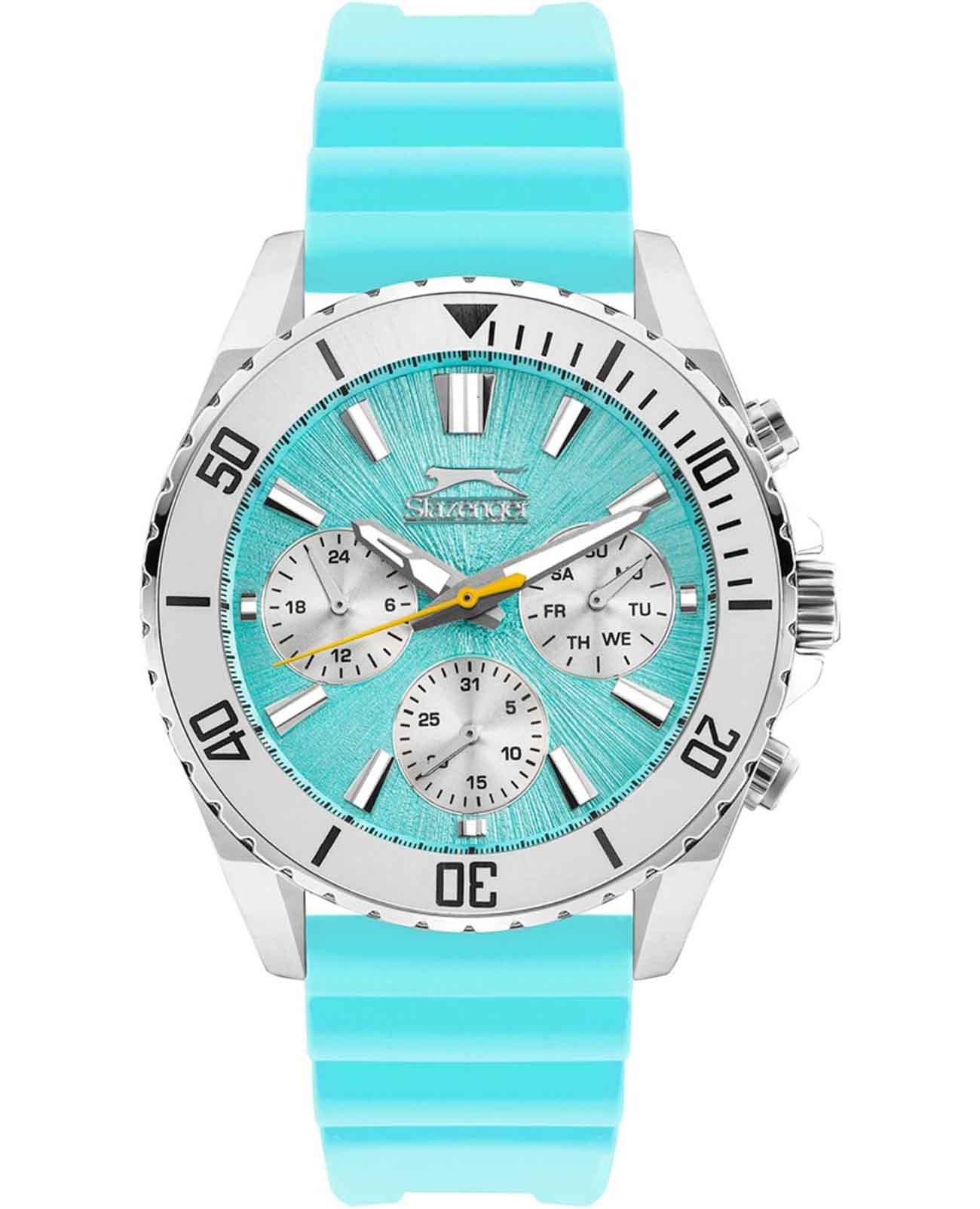 Часы Slazenger SL.09.2274.2.06 сочетают в себе современный стиль и надежность. Круглый корпус диаметром 44 мм выполнен из суперметалла, что придает модели выразительный и элегантный вид. Голубой циферблат с логотипом бренда защищен прочным минеральным стекломМинеральное стеклоМинеральное стекло представляет собой искусственно выращенный минерал кварца. Такое стекло отличается особой устойчивостью к повреждениям и царапинам. Уступает по некоторым качествам сапфировому стеклу., рифленый сатинированный безельБезельВнешний ободок, закрепляющий стекло. В спортивных часах так называется поворотное кольцо с делениями на циферблате, выполняет роль таймера – замеряет отрезки времени на шкале. Неподвижный безель – элемент декора. Однонаправленно вращающийся безель на дайверских часах позволяет фиксировать моменты погружения и выныривания на поверхность. украшен минутными отметками. На дополнительных циферблатах отображаются дата, день недели и время в 12- и 24-часовом формате. Надежный кварцевый механизм обеспечивает точность хода. Силиконовый голубой ремешок шириной 22 мм удобно фиксируется на запястье с помощью классической застежки. Стрелки и метки с люминесцентным покрытиемЛюминесцентное покрытиеПозволяет считывать показания времени в темноте. Производители наносят на стрелки, часовые индексы, безель или поверхность циферблата светонакопительный состав, дающий холодное свечение. удобно подсвечиваются в темноте после зарядки на свету. Водозащита 50WR позволяет использовать часы в повседневной жизни, а вес 90 г и толщина корпуса 12 мм делают их комфортными для ежедневного ношения.