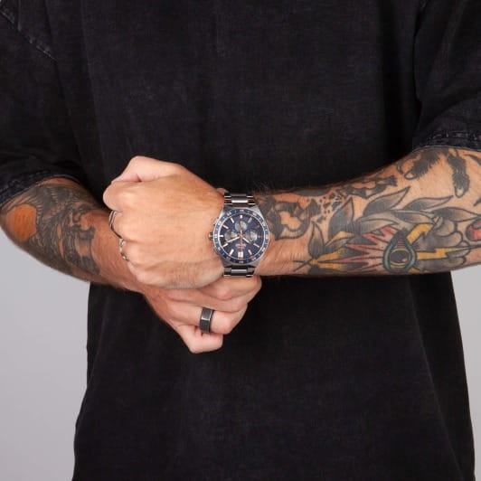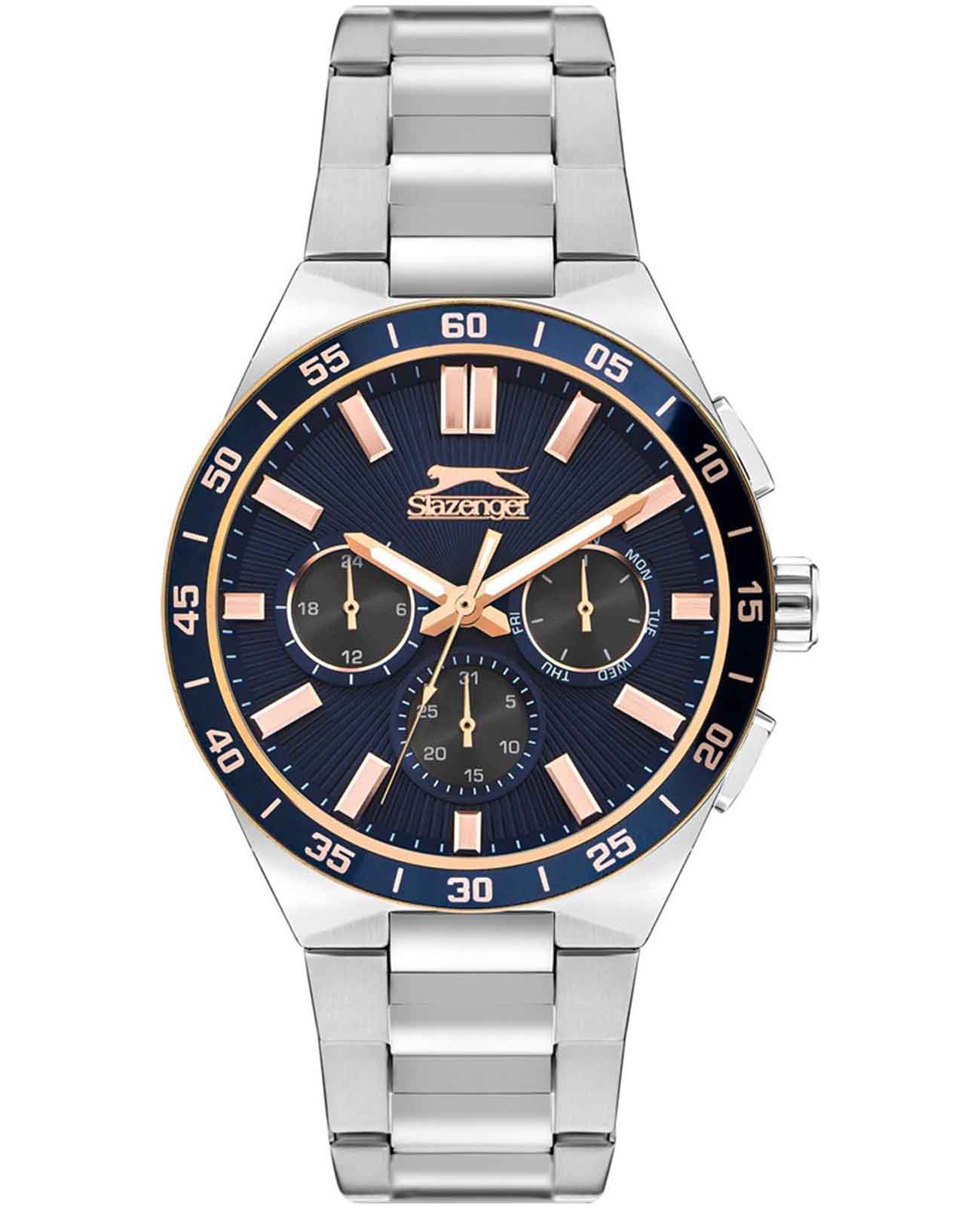 Часы Slazenger SL.09.2285.2.03 — это стильное решение для тех, кто ценит сочетание выразительного дизайна и функциональности. Модель оснащена надежным кварцевым механизмом, который заключен в прочный корпус диаметром 45 мм и толщиной 13 мм, выполненный из суперметалла — современного сплава на основе меди с пониженным содержанием цинка и никеля, обладающего высокой прочностью и устойчивостью к износу, а на золотистый безельБезельВнешний ободок, закрепляющий стекло. В спортивных часах так называется поворотное кольцо с делениями на циферблате, выполняет роль таймера – замеряет отрезки времени на шкале. Неподвижный безель – элемент декора. Однонаправленно вращающийся безель на дайверских часах позволяет фиксировать моменты погружения и выныривания на поверхность. нанесено синее IP-покрытиеIP-покрытиеМетод ионного напыления. Демонстрирует повышенную устойчивость к истиранию, окислению и химическим веществам. Под воздействием высокого давления и температуры около 1500°C молекулы металла надёжно соединяются с частицами корпуса часов. и секундная шкала. Минеральное стеклоМинеральное стеклоМинеральное стекло представляет собой искусственно выращенный минерал кварца. Такое стекло отличается особой устойчивостью к повреждениям и царапинам. Уступает по некоторым качествам сапфировому стеклу. защищает синий циферблат от царапин и повреждений. Часы оснащены дополнительными циферблатами для отображения 24-часового времени, даты и дня недели, что делает использование еще более удобным. Браслет также выполнен из суперметалла с раскладной застёжкойРаскладная застёжкаТакой тип застёжки используется только на браслетах из металла. Она никогда не раскрывается полностью, происходит разделение на 2 и более частей. Раскладывающая застёжка снизит вероятность потери часов к минимуму. и гармонично дополняет общий облик аксессуара. Циферблат оснащён люминесцентным покрытиемЛюминесцентное покрытиеПозволяет считывать показания времени в темноте. Производители наносят на стрелки, часовые индексы, безель или поверхность циферблата светонакопительный состав, дающий холодное свечение. стрелок и меток, что позволяет легко определять время даже в условиях плохой освещенности. Класс водозащиты 5 АТМ позволяет не бояться случайных брызг и дождя, а гарантия 12 месяцев подтверждает высокое качество изделия.