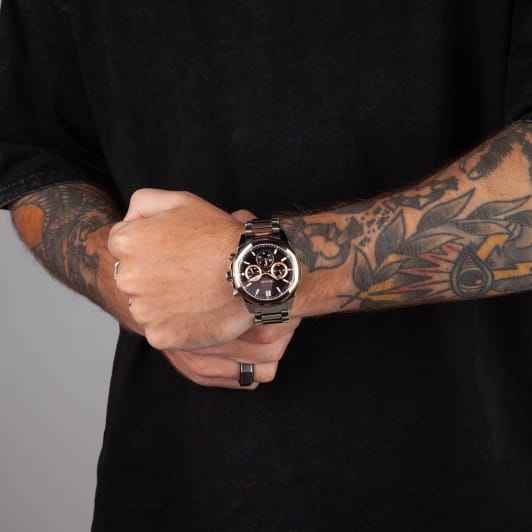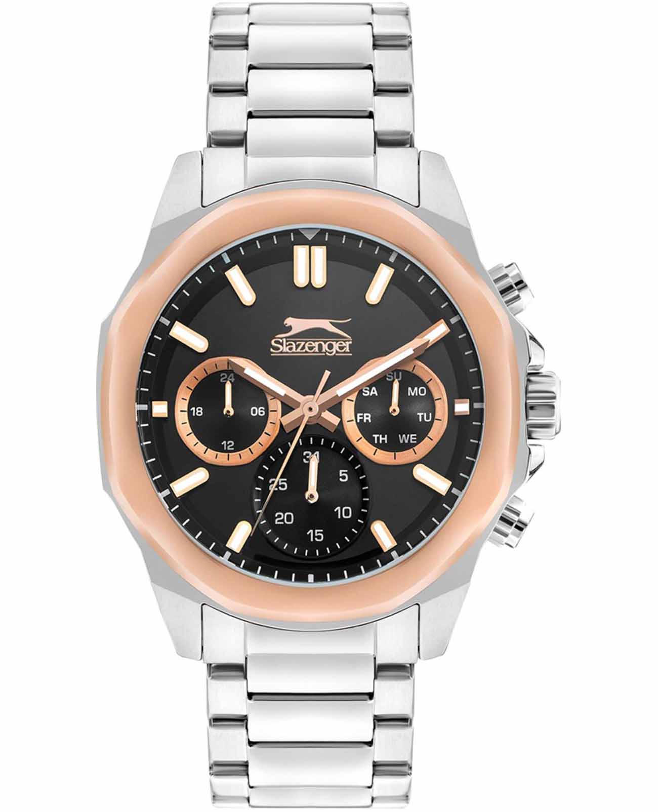 Часы Slazenger SL.09.2289.2.03 — это сочетание современного дизайна и функциональности, идеально подходящее для тех, кто ценит стиль и надежность. Корпус и браслет выполнены из прочного суперметалла, что придаёт модели солидный и эффектный вид. Черный циферблат с лаконичными отметками и фирменным логотипом защищён устойчивым к царапинам минеральным стекломМинеральное стеклоМинеральное стекло представляет собой искусственно выращенный минерал кварца. Такое стекло отличается особой устойчивостью к повреждениям и царапинам. Уступает по некоторым качествам сапфировому стеклу.. Дополнительные функции включают отображение даты и дня недели, а также 12- и 24-часовой формат времени на отдельных мини-циферблатах, что делает использование часов максимально удобным. Заводная головка оснащена защитой, а надёжная раскладная застёжкаРаскладная застёжкаТакой тип застёжки используется только на браслетах из металла. Она никогда не раскрывается полностью, происходит разделение на 2 и более частей. Раскладывающая застёжка снизит вероятность потери часов к минимуму. обеспечивает комфортную посадку на запястье. Особое внимание привлекает восьмигранный безельБезельВнешний ободок, закрепляющий стекло. В спортивных часах так называется поворотное кольцо с делениями на циферблате, выполняет роль таймера – замеряет отрезки времени на шкале. Неподвижный безель – элемент декора. Однонаправленно вращающийся безель на дайверских часах позволяет фиксировать моменты погружения и выныривания на поверхность. с розово-золотистым IP-покрытиемIP-покрытиеМетод ионного напыления. Демонстрирует повышенную устойчивость к истиранию, окислению и химическим веществам. Под воздействием высокого давления и температуры около 1500°C молекулы металла надёжно соединяются с частицами корпуса часов.. Циферблат оснащён люминесцентным покрытиемЛюминесцентное покрытиеПозволяет считывать показания времени в темноте. Производители наносят на стрелки, часовые индексы, безель или поверхность циферблата светонакопительный состав, дающий холодное свечение. стрелок и меток, что позволяет легко определять время даже в условиях плохой освещенности. Водозащита 50WR позволяет не беспокоиться о случайных брызгах и дождевых каплях. Диаметр корпуса составляет 46 мм, толщина — 14 мм, вес — 165 г, благодаря чему часы выглядят внушительно и подчёркивают индивидуальный стиль владельца. Эта модель станет отличным акцентом в вашем образе и подчеркнёт вашу уверенность в любой ситуации.