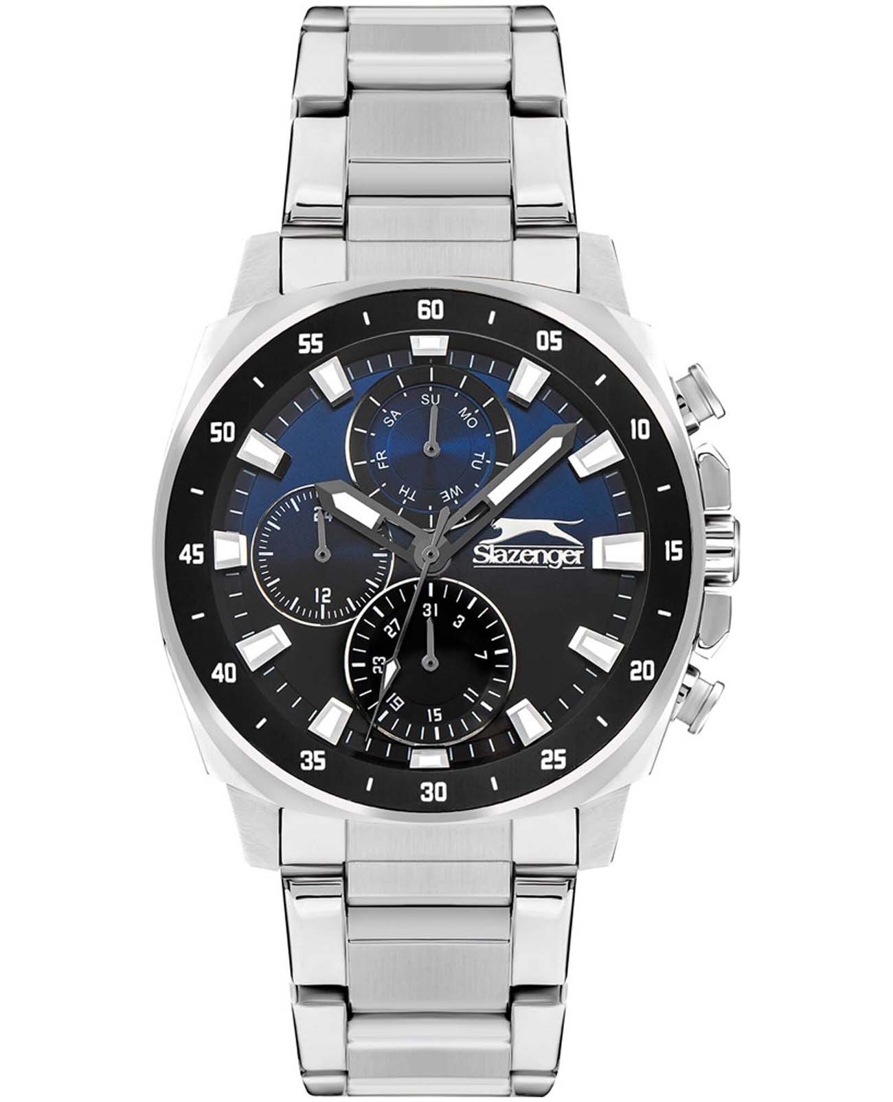 Slazenger SL.09.2292.2.01 — это стильные наручные часы, выполненные в современном дизайне и отлично подходящие для повседневного использования. Корпус диаметром 45 мм изготовлен из прочного металла и дополнен минеральным стекломМинеральное стеклоМинеральное стекло представляет собой искусственно выращенный минерал кварца. Такое стекло отличается особой устойчивостью к повреждениям и царапинам. Уступает по некоторым качествам сапфировому стеклу., которое защищает сине-черный циферблат. Серебристый металлический браслет шириной 24 мм оснащён надежной раскладной застёжкойРаскладная застёжкаТакой тип застёжки используется только на браслетах из металла. Она никогда не раскрывается полностью, происходит разделение на 2 и более частей. Раскладывающая застёжка снизит вероятность потери часов к минимуму., которая обеспечивает комфортную посадку на руке. Кварцевый механизм гарантирует точный ход, а водозащита уровня WR 50 позволяет не снимать часы во время мытья рук или под дождём. Модель оснащена люминесцентным покрытиемЛюминесцентное покрытиеПозволяет считывать показания времени в темноте. Производители наносят на стрелки, часовые индексы, безель или поверхность циферблата светонакопительный состав, дающий холодное свечение. стрелок и меток, что облегчает считывание времени в темноте. Дополнительные малые циферблаты отображают дату, день недели и текущее время в 24-часовом формате. Часы также оснащены заводной головкой с защитой и безелемБезельВнешний ободок, закрепляющий стекло. В спортивных часах так называется поворотное кольцо с делениями на циферблате, выполняет роль таймера – замеряет отрезки времени на шкале. Неподвижный безель – элемент декора. Однонаправленно вращающийся безель на дайверских часах позволяет фиксировать моменты погружения и выныривания на поверхность. с черным IP-покрытиемIP-покрытиеМетод ионного напыления. Демонстрирует повышенную устойчивость к истиранию, окислению и химическим веществам. Под воздействием высокого давления и температуры около 1500°C молекулы металла надёжно соединяются с частицами корпуса часов. и секундной разметкой. Вес изделия составляет 173 грамма.