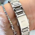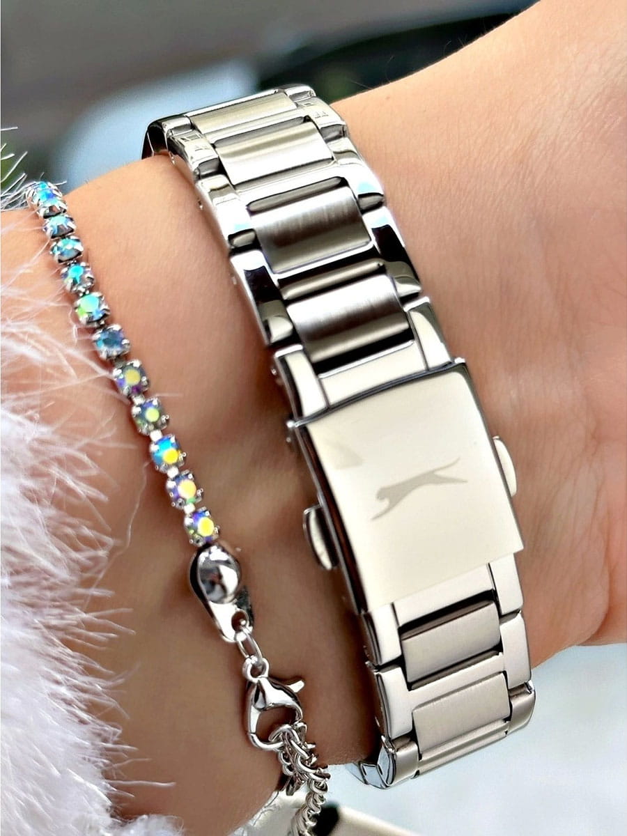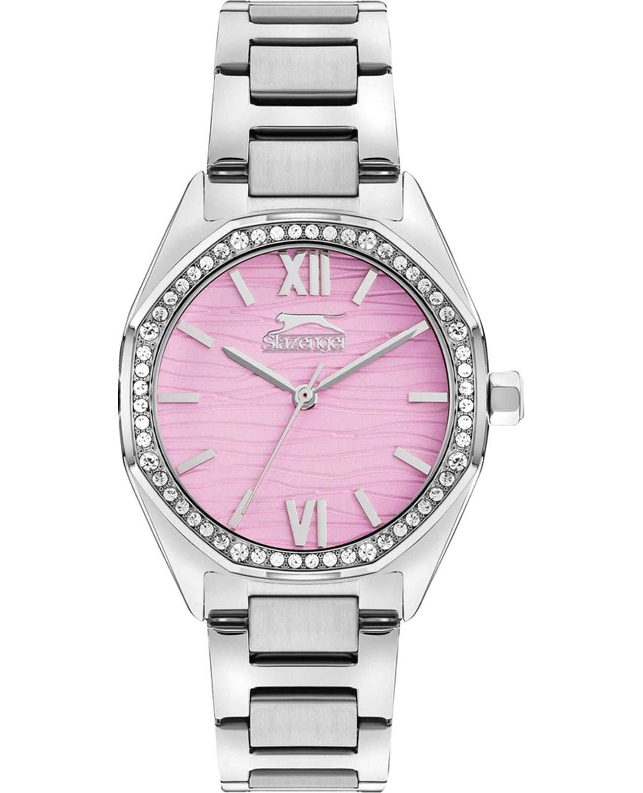 Женские кварцевые часы Slazenger SL.09.2301.3.09 — это элегантный и изысканный аксессуар, подчеркивающий стиль и утончённость. Корпус и браслет выполнены из суперметалла, защищён минеральным стекломМинеральное стеклоМинеральное стекло представляет собой искусственно выращенный минерал кварца. Такое стекло отличается особой устойчивостью к повреждениям и царапинам. Уступает по некоторым качествам сапфировому стеклу.. Циферблат розового цвета с волнистым рельефным рисунком оформлен штриховыми метками и римскими цифрами VI и XII, дополнен логотипом бренда. Безель гранёный, украшен паве из фианитов, придающих модели изысканное сияние. Заводная головка — граненая, добавляющая детали дизайна. Браслет из суперметалла фиксируется на раскладной застёжкеРаскладная застёжкаТакой тип застёжки используется только на браслетах из металла. Она никогда не раскрывается полностью, происходит разделение на 2 и более частей. Раскладывающая застёжка снизит вероятность потери часов к минимуму., обеспечивая надёжность и комфорт ношения. Водонепроницаемость 30 м позволяет использовать часы в повседневных условиях, защищая от случайных брызг и капель дождя. Модель идеально подходит как для повседневного, так и для торжественного образа.