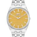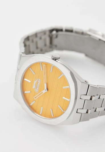 Мужские кварцевые часы Slazenger SL.09.2310.1.02 — это элегантный и стильный аксессуар, идеально дополняющий любой образ. Корпус и браслет выполнены из суперметалла, защищён минеральным стекломМинеральное стеклоМинеральное стекло представляет собой искусственно выращенный минерал кварца. Такое стекло отличается особой устойчивостью к повреждениям и царапинам. Уступает по некоторым качествам сапфировому стеклу.. Циферблат жёлтого цвета оформлен в классическом стиле. Браслет из суперметалла фиксируется на раскладной застёжкеРаскладная застёжкаТакой тип застёжки используется только на браслетах из металла. Она никогда не раскрывается полностью, происходит разделение на 2 и более частей. Раскладывающая застёжка снизит вероятность потери часов к минимуму., обеспечивая удобство и надёжность ношения. Водонепроницаемость 50 м позволяет использовать часы в повседневных условиях, защищая от случайных брызг и капель дождя. Модель сочетает в себе лёгкость, прочность и изысканный внешний вид.