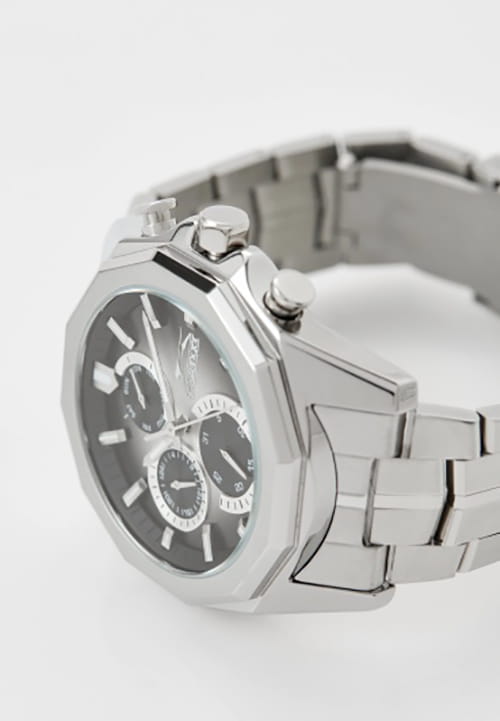 Мужские кварцевые часы Slazenger SL.09.2312.2.01 — это выразительный и функциональный аксессуар, сочетающий прочность, стиль и насыщенную комплектацию. Корпус выполнен из суперметалла, защищён минеральным стекломМинеральное стеклоМинеральное стекло представляет собой искусственно выращенный минерал кварца. Такое стекло отличается особой устойчивостью к повреждениям и царапинам. Уступает по некоторым качествам сапфировому стеклу.. Циферблат оформлен с вынесенными малыми циферблатами для индикации дня недели, даты и времени в 24-часовом формате. Стрелки и метки оснащены люминесцентным покрытиемЛюминесцентное покрытиеПозволяет считывать показания времени в темноте. Производители наносят на стрелки, часовые индексы, безель или поверхность циферблата светонакопительный состав, дающий холодное свечение., обеспечивающим хорошую читаемость в темноте. Заводная головка снабжена защитой, а задняя крышка — завинчивающаяся, что повышает надёжность конструкции. Часы оснащены браслетом из суперметалла серебристого цвета с раскладной застёжкойРаскладная застёжкаТакой тип застёжки используется только на браслетах из металла. Она никогда не раскрывается полностью, происходит разделение на 2 и более частей. Раскладывающая застёжка снизит вероятность потери часов к минимуму., обеспечивающей удобство и надёжность ношения. Водонепроницаемость 50 м позволяет использовать часы в повседневных условиях, защищая от случайных брызг и капель дождя. Модель подчёркивает индивидуальность владельца и идеально подходит как для повседневного, так и для спортивного образа.