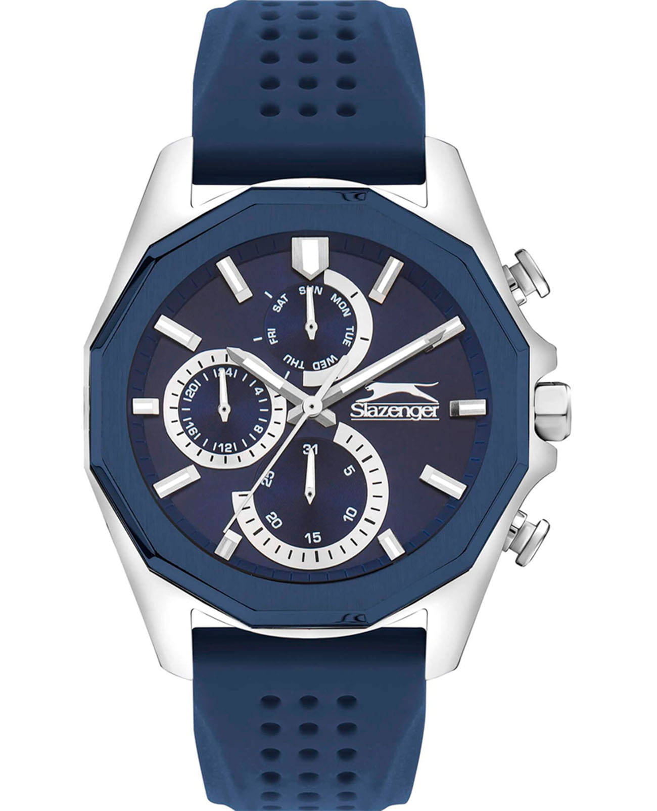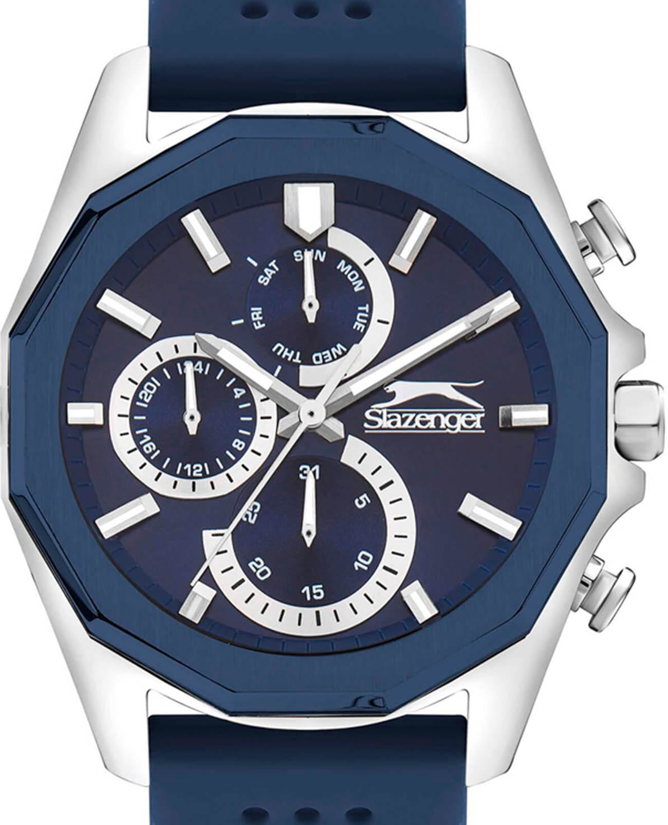 Мужские кварцевые часы Slazenger SL.09.2313.2.02 — это стильный и функциональный аксессуар, идеально дополняющий современный образ. Корпус выполнен из суперметалла с частичным IP-покрытиемIP-покрытиеМетод ионного напыления. Демонстрирует повышенную устойчивость к истиранию, окислению и химическим веществам. Под воздействием высокого давления и температуры около 1500°C молекулы металла надёжно соединяются с частицами корпуса часов. синего цвета. Оснащён минеральным стекломМинеральное стеклоМинеральное стекло представляет собой искусственно выращенный минерал кварца. Такое стекло отличается особой устойчивостью к повреждениям и царапинам. Уступает по некоторым качествам сапфировому стеклу.. Циферблат синего цвета оформлен с вынесенными малыми циферблатами для индикации дня недели, даты и времени в 24-часовом формате. Стрелки и метки оснащены люминесцентным покрытиемЛюминесцентное покрытиеПозволяет считывать показания времени в темноте. Производители наносят на стрелки, часовые индексы, безель или поверхность циферблата светонакопительный состав, дающий холодное свечение., обеспечивающим хорошую читаемость в темноте. Сатинированный безель и гранёная заводная головка с защитой придают модели выразительный внешний вид. Часы оснащены перфорированным силиконовым ремешком синего цвета, фиксирующимся на классической пряжке. Водонепроницаемость 50 м позволяет использовать часы для плавания и повседневного ношения. Модель сочетает в себе прочность, комфорт и спортивный стиль.