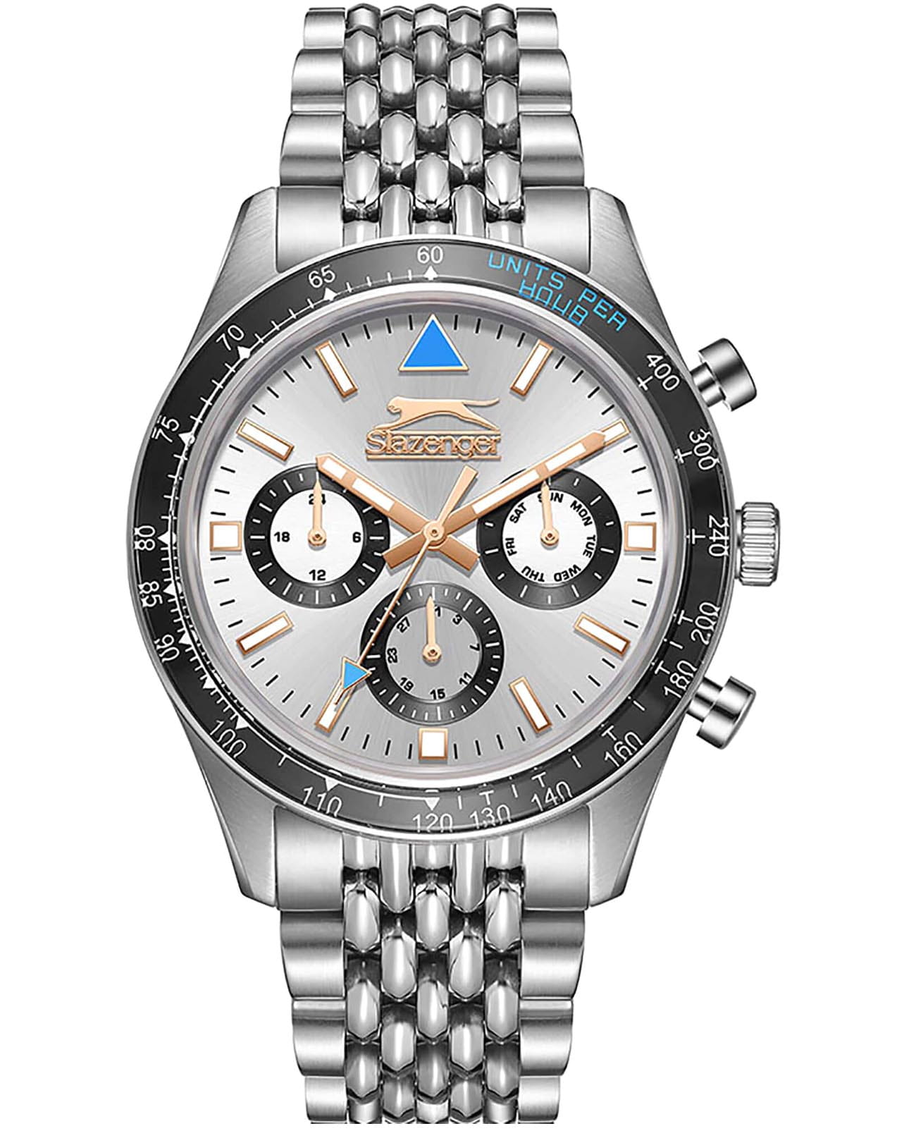 Мужские кварцевые часы Slazenger SL.09.2360.2.05 – идеальное сочетание классического дизайна и современных технологий, созданное для уверенных в себе мужчин. Корпус выполнен из суперметалла серебристого цвета, диаметром 43 мм и толщиной 12 мм, подчёркивает надежность модели и делает их идеальным аксессуаром для любой ситуации – будь то деловая встреча или повседневные выходы. Циферблат надёжно защищён минеральным стекломМинеральное стеклоМинеральное стекло представляет собой искусственно выращенный минерал кварца. Такое стекло отличается особой устойчивостью к повреждениям и царапинам. Уступает по некоторым качествам сапфировому стеклу., которое устойчиво к механическим повреждениям и сохраняет кристальную прозрачность. Неподвижный безельБезельВнешний ободок, закрепляющий стекло. В спортивных часах так называется поворотное кольцо с делениями на циферблате, выполняет роль таймера – замеряет отрезки времени на шкале. Неподвижный безель – элемент декора. Однонаправленно вращающийся безель на дайверских часах позволяет фиксировать моменты погружения и выныривания на поверхность. с IP-покрытиемIP-покрытиеМетод ионного напыления. Демонстрирует повышенную устойчивость к истиранию, окислению и химическим веществам. Под воздействием высокого давления и температуры около 1500°C молекулы металла надёжно соединяются с частицами корпуса часов. черного цвета. Стальной браслет на раскладной застёжкеРаскладная застёжкаТакой тип застёжки используется только на браслетах из металла. Она никогда не раскрывается полностью, происходит разделение на 2 и более частей. Раскладывающая застёжка снизит вероятность потери часов к минимуму. удобно облегает запястье, обеспечивая надёжность и комфорт в повседневном ношении. Стрелки и метки покрыты люминесцентным покрытиемЛюминесцентное покрытиеПозволяет считывать показания времени в темноте. Производители наносят на стрелки, часовые индексы, безель или поверхность циферблата светонакопительный состав, дающий холодное свечение., обеспечивающим отличную читаемость в темноте. Эти часы станут не просто аксессуаром, а надежным спутником в любой ситуации, подчеркивая ваш безупречный вкус и деловой стиль. Вынесенный циферблат с 24-х часовым указателем времени и функция тахиметраТахиметрРазмеченная шкала, располагается на ободке или безеле часов. Тахиметр позволяет рассчитать скорость на определённом участке пути, расстояние измеряется в километрах или милях.. Водозащита 50 метров позволит защитить корпус от случайных брызг или капель дождя.