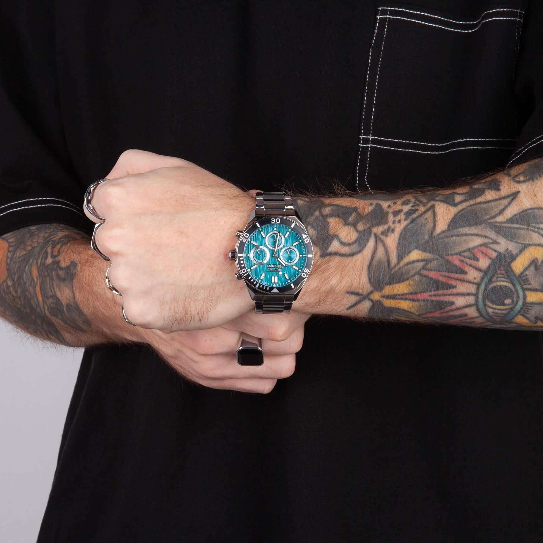 Мужские кварцевые часы Slazenger SL.09.2370.2.03 – идеальное сочетание классического дизайна и современных технологий, созданное для уверенных в себе мужчин. Корпус выполнен из суперметалла серебристого цвета, диаметром 44.5 мм и толщиной 13 мм, подчёркивает надежность модели и делает их идеальным аксессуаром для любой ситуации – будь то деловая встреча или повседневные выходы. Циферблат надёжно защищён минеральным стекломМинеральное стеклоМинеральное стекло представляет собой искусственно выращенный минерал кварца. Такое стекло отличается особой устойчивостью к повреждениям и царапинам. Уступает по некоторым качествам сапфировому стеклу., которое устойчиво к механическим повреждениям и сохраняет кристальную прозрачность. БезельБезельВнешний ободок, закрепляющий стекло. В спортивных часах так называется поворотное кольцо с делениями на циферблате, выполняет роль таймера – замеряет отрезки времени на шкале. Неподвижный безель – элемент декора. Однонаправленно вращающийся безель на дайверских часах позволяет фиксировать моменты погружения и выныривания на поверхность. с IP-покрытиемIP-покрытиеМетод ионного напыления. Демонстрирует повышенную устойчивость к истиранию, окислению и химическим веществам. Под воздействием высокого давления и температуры около 1500°C молекулы металла надёжно соединяются с частицами корпуса часов. черного цвета. Стальной браслет удобно облегает запястье и фиксируется с помощью раскладной застёжкиРаскладная застёжкаТакой тип застёжки используется только на браслетах из металла. Она никогда не раскрывается полностью, происходит разделение на 2 и более частей. Раскладывающая застёжка снизит вероятность потери часов к минимуму., обеспечивая надёжность и комфорт в повседневном ношении. Стрелки и метки покрыты люминесцентным покрытиемЛюминесцентное покрытиеПозволяет считывать показания времени в темноте. Производители наносят на стрелки, часовые индексы, безель или поверхность циферблата светонакопительный состав, дающий холодное свечение., обеспечивающим отличную читаемость в темноте. Эти часы станут не просто аксессуаром, а надежным спутником в любой ситуации, подчеркивая ваш безупречный вкус и деловой стиль. Вынесенный циферблат с 24-х часовым указателем времени. Водозащита 50 метров позволит защитить корпус от случайных брызг или капель дождя.