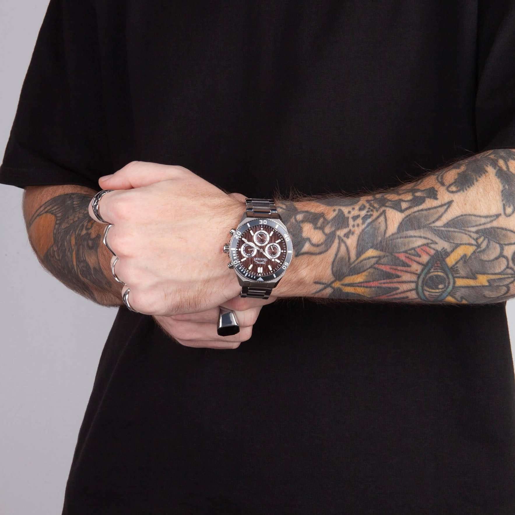 Мужские кварцевые часы Slazenger SL.09.2370.2.06 – идеальное сочетание классического дизайна и современных технологий, созданное для уверенных в себе мужчин. Корпус выполнен из суперметалла серебристого цвета, диаметром 44.5 мм и толщиной 13 мм, подчёркивает надежность модели и делает их идеальным аксессуаром для любой ситуации – будь то деловая встреча или повседневные выходы. Циферблат надёжно защищён минеральным стекломМинеральное стеклоМинеральное стекло представляет собой искусственно выращенный минерал кварца. Такое стекло отличается особой устойчивостью к повреждениям и царапинам. Уступает по некоторым качествам сапфировому стеклу., которое устойчиво к механическим повреждениям и сохраняет кристальную прозрачность. БезельБезельВнешний ободок, закрепляющий стекло. В спортивных часах так называется поворотное кольцо с делениями на циферблате, выполняет роль таймера – замеряет отрезки времени на шкале. Неподвижный безель – элемент декора. Однонаправленно вращающийся безель на дайверских часах позволяет фиксировать моменты погружения и выныривания на поверхность. с IP-покрытиемIP-покрытиеМетод ионного напыления. Демонстрирует повышенную устойчивость к истиранию, окислению и химическим веществам. Под воздействием высокого давления и температуры около 1500°C молекулы металла надёжно соединяются с частицами корпуса часов. черного цвета. Стальной браслет удобно облегает запястье и фиксируется с помощью раскладной застёжкиРаскладная застёжкаТакой тип застёжки используется только на браслетах из металла. Она никогда не раскрывается полностью, происходит разделение на 2 и более частей. Раскладывающая застёжка снизит вероятность потери часов к минимуму., обеспечивая надёжность и комфорт в повседневном ношении. Стрелки и метки покрыты люминесцентным покрытиемЛюминесцентное покрытиеПозволяет считывать показания времени в темноте. Производители наносят на стрелки, часовые индексы, безель или поверхность циферблата светонакопительный состав, дающий холодное свечение., обеспечивающим отличную читаемость в темноте. Эти часы станут не просто аксессуаром, а надежным спутником в любой ситуации, подчеркивая ваш безупречный вкус и деловой стиль. Вынесенный циферблат с 24-х часовым указателем времени. Водозащита 50 метров позволит защитить корпус от случайных брызг или капель дождя.