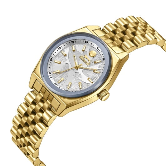 Женские кварцевые часы Slazenger SL.09.2376.3.05 – это сочетание элегантности, современного стиля и надёжности. Изящный корпус из суперметалла с IP-покрытиемIP-покрытиеМетод ионного напыления. Демонстрирует повышенную устойчивость к истиранию, окислению и химическим веществам. Под воздействием высокого давления и температуры около 1500°C молекулы металла надёжно соединяются с частицами корпуса часов. золотистого цвета, диаметром 32 мм и толщиной 9 мм, подчёркивает утончённость модели и делает их идеальным аксессуаром для любой ситуации – будь то деловая встреча, романтический вечер или повседневные выходы. Циферблат надёжно защищён минеральным стекломМинеральное стеклоМинеральное стекло представляет собой искусственно выращенный минерал кварца. Такое стекло отличается особой устойчивостью к повреждениям и царапинам. Уступает по некоторым качествам сапфировому стеклу., которое устойчиво к механическим повреждениям и сохраняет кристальную прозрачность. Неподвижный безельБезельВнешний ободок, закрепляющий стекло. В спортивных часах так называется поворотное кольцо с делениями на циферблате, выполняет роль таймера – замеряет отрезки времени на шкале. Неподвижный безель – элемент декора. Однонаправленно вращающийся безель на дайверских часах позволяет фиксировать моменты погружения и выныривания на поверхность. с IP-покрытиемIP-покрытиеМетод ионного напыления. Демонстрирует повышенную устойчивость к истиранию, окислению и химическим веществам. Под воздействием высокого давления и температуры около 1500°C молекулы металла надёжно соединяются с частицами корпуса часов. серого цвета. Браслет из суперметалла удобно облегает запястье и фиксируется с помощью раскладной застёжкиРаскладная застёжкаТакой тип застёжки используется только на браслетах из металла. Она никогда не раскрывается полностью, происходит разделение на 2 и более частей. Раскладывающая застёжка снизит вероятность потери часов к минимуму., обеспечивая надёжность и комфорт в повседневном ношении. Утончённый стиль, внимание к деталям и практичность делают эту модель идеальным выбором для современных женщин, ценящих эстетику и функциональность. Метки покрыты люминесцентным покрытиемЛюминесцентное покрытиеПозволяет считывать показания времени в темноте. Производители наносят на стрелки, часовые индексы, безель или поверхность циферблата светонакопительный состав, дающий холодное свечение., обеспечивающим отличную читаемость в темноте. Водозащита до 30 метров позволит защитить корпус от случайных брызг или капель дождя.
