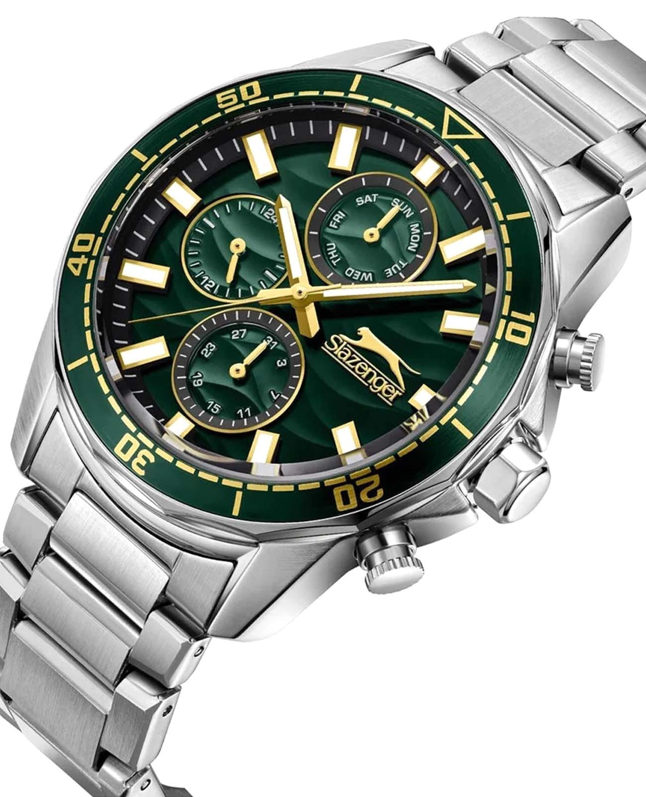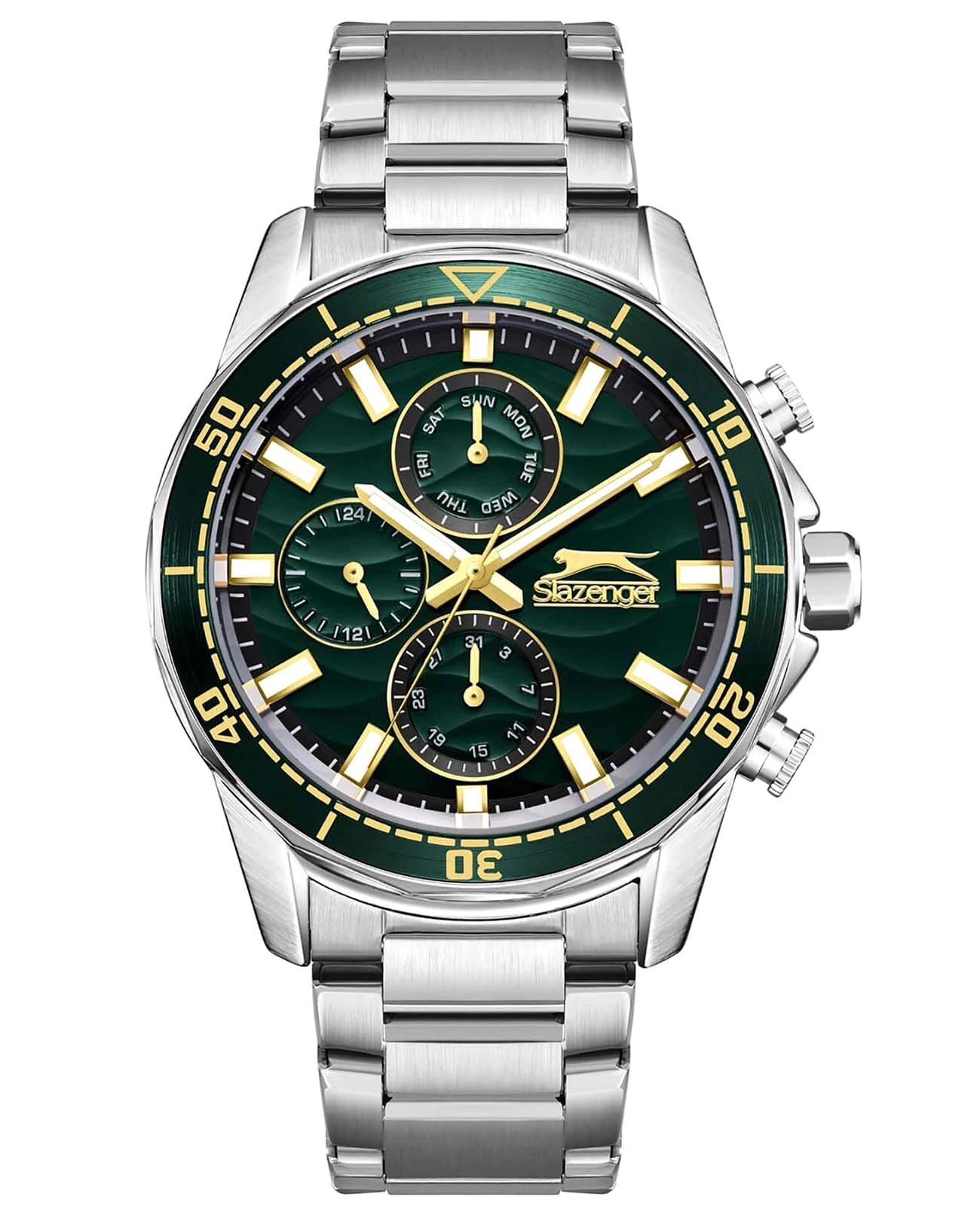 Мужские кварцевые часы Slazenger — это выразительный и функциональный аксессуар. Корпус диаметром 41,5 мм и толщиной 13 мм выполнен из суперметалла. Циферблат зелёного цвета оформлен индексами и стрелками. Циферблат защищён минеральным стекломМинеральное стеклоМинеральное стекло представляет собой искусственно выращенный минерал кварца. Такое стекло отличается особой устойчивостью к повреждениям и царапинам. Уступает по некоторым качествам сапфировому стеклу.. Механизм — кварцевый. Часы оснащены индикацией дня недели, даты и 12/24-часового формата времени. Стрелки и метки с люминесцентным покрытиемЛюминесцентное покрытиеПозволяет считывать показания времени в темноте. Производители наносят на стрелки, часовые индексы, безель или поверхность циферблата светонакопительный состав, дающий холодное свечение., обеспечивающим хорошую читаемость в темноте. Часы оснащены браслетом из суперметалла с раскладной застёжкойРаскладная застёжкаТакой тип застёжки используется только на браслетах из металла. Она никогда не раскрывается полностью, происходит разделение на 2 и более частей. Раскладывающая застёжка снизит вероятность потери часов к минимуму.. Водонепроницаемость 100 м позволяет использовать часы для плавания и повседневного ношения. Гарантия — 12 месяцев. Идеальный выбор для тех, кто ценит стиль, функциональность и качество.