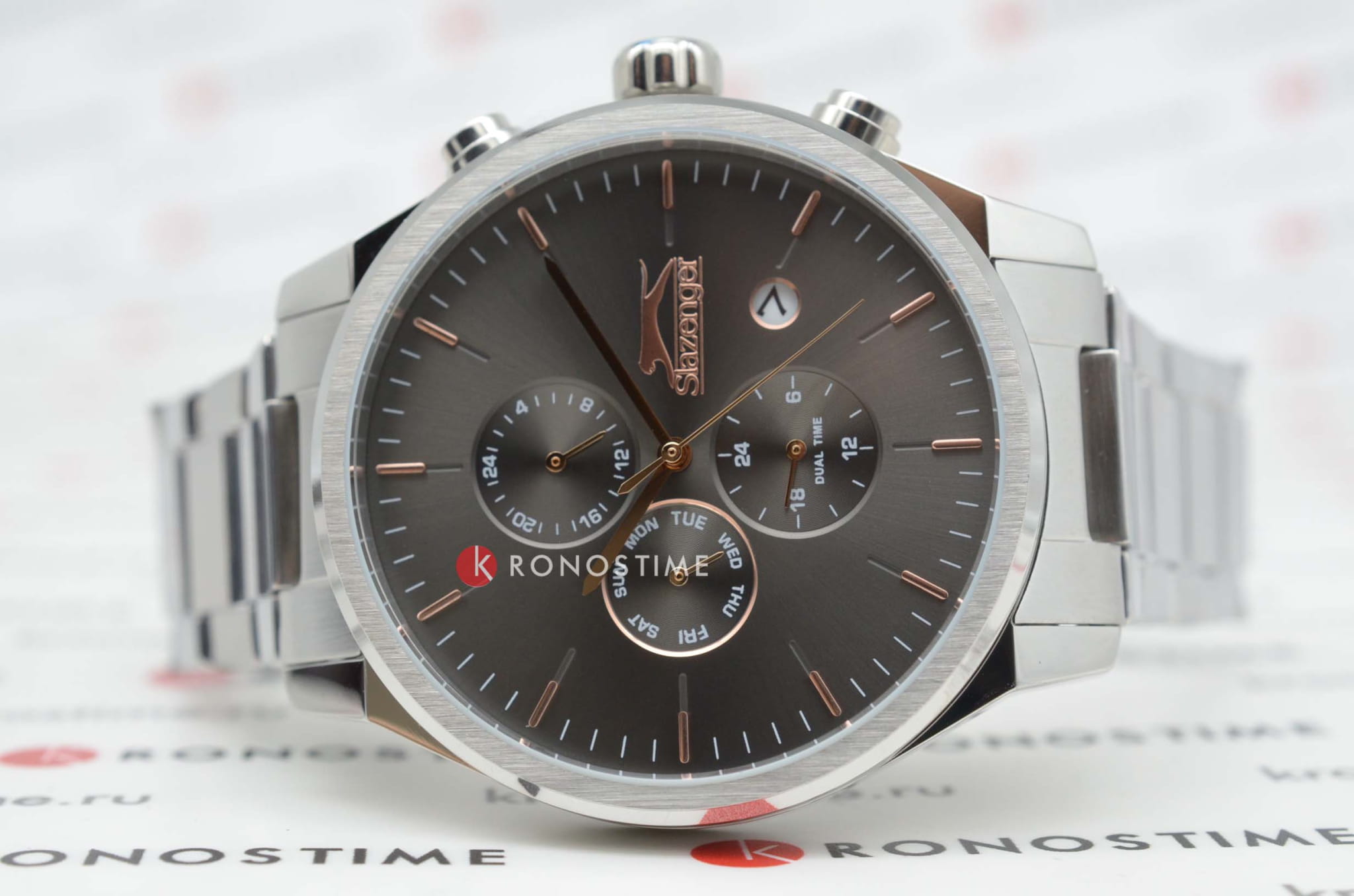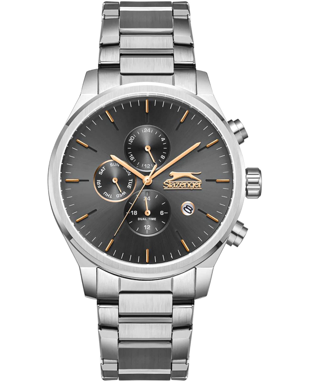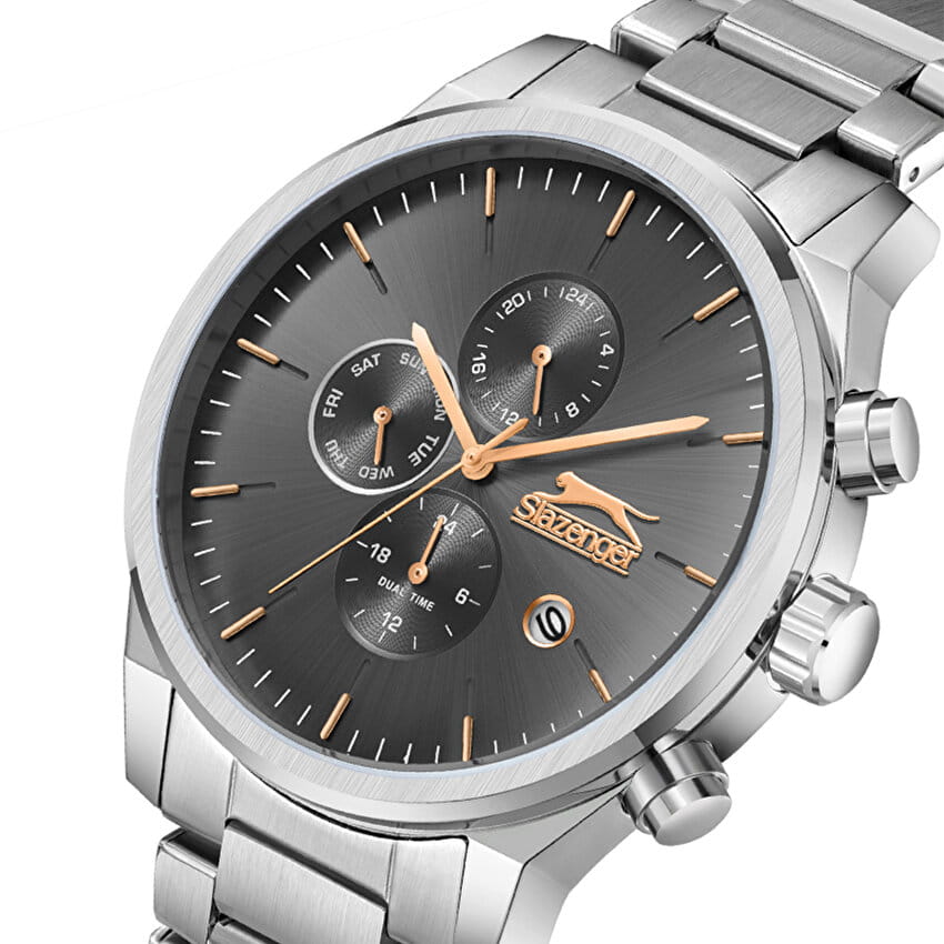 Мужские кварцевые часы Slazenger — это выразительный и функциональный аксессуар. Корпус диаметром 44 мм и толщиной 11 мм выполнен из нержавеющей стали 316L. Циферблат чёрного цвета оформлен индексами и стрелками. Циферблат защищён минеральным стекломМинеральное стеклоМинеральное стекло представляет собой искусственно выращенный минерал кварца. Такое стекло отличается особой устойчивостью к повреждениям и царапинам. Уступает по некоторым качествам сапфировому стеклу.. Механизм — кварцевый. Часы оснащены индикацией дня недели, даты, 12/24-часового формата времени и функцией второго часового пояса (GMT)Второй часовой поясФункция, позволяющая отображать время двух часовых поясов одновременно.. Окошко даты расположено между 4 и 5 часами. Часы оснащены стальным браслетом с раскладной застёжкойРаскладная застёжкаТакой тип застёжки используется только на браслетах из металла. Она никогда не раскрывается полностью, происходит разделение на 2 и более частей. Раскладывающая застёжка снизит вероятность потери часов к минимуму.. Водонепроницаемость 100 м позволяет использовать часы для плавания и повседневного ношения. Гарантия — 12 месяцев. Идеальный выбор для тех, кто ценит стиль, функциональность и качество.