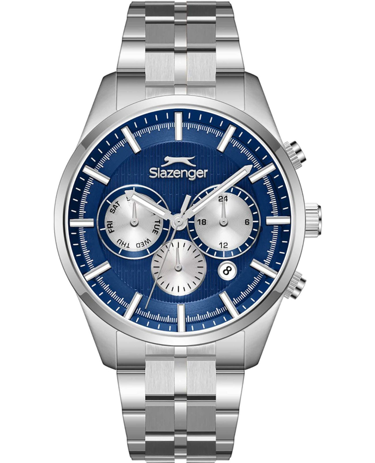 Мужские кварцевые часы Slazenger — это выразительный и функциональный аксессуар. Корпус диаметром 43 мм и толщиной 13 мм выполнен из нержавеющей стали 316L. Циферблат синего цвета оформлен индексами и стрелками. Циферблат защищён минеральным стекломМинеральное стеклоМинеральное стекло представляет собой искусственно выращенный минерал кварца. Такое стекло отличается особой устойчивостью к повреждениям и царапинам. Уступает по некоторым качествам сапфировому стеклу.. Механизм — кварцевый. Часы оснащены индикацией дня недели, даты, 12/24-часового формата времени и функцией второго часового пояса (GMT)Второй часовой поясФункция, позволяющая отображать время двух часовых поясов одновременно.. Окошко даты расположено между 4 и 5 часами. Стрелки и метки с люминесцентным покрытиемЛюминесцентное покрытиеПозволяет считывать показания времени в темноте. Производители наносят на стрелки, часовые индексы, безель или поверхность циферблата светонакопительный состав, дающий холодное свечение., обеспечивающим хорошую читаемость в темноте. Часы оснащены стальным браслетом с раскладной застёжкойРаскладная застёжкаТакой тип застёжки используется только на браслетах из металла. Она никогда не раскрывается полностью, происходит разделение на 2 и более частей. Раскладывающая застёжка снизит вероятность потери часов к минимуму.. Водонепроницаемость 100 м позволяет использовать часы для плавания и повседневного ношения. Гарантия — 12 месяцев. Идеальный выбор для тех, кто ценит стиль, функциональность и качество.