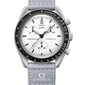 Часы Swatch Bioceramic Moonswatch 1965 SO33M106 — это стильный и современный аксессуар для тех, кто ценит лёгкость и комфорт. Часы идеально подойдут как для мужчин, так и для женщин. Корпус диаметром 42 мм и пряжка этих уникальных часов изготовлены из биокерамикиБиокерамикаБиокерамика — это материал, который на две трети состоит из керамики, на одну треть — из биопластика. Он сочетает в себе лучшие качества обоих материалов и обладает прочностью и шелковистой на ощупь текстурой. серой расцветки, напоминающей нержавеющую сталь. Модель оснащена белым циферблатом и черным биокерамическим безелемБезельВнешний ободок, закрепляющий стекло. В спортивных часах так называется поворотное кольцо с делениями на циферблате, выполняет роль таймера – замеряет отрезки времени на шкале. Неподвижный безель – элемент декора. Однонаправленно вращающийся безель на дайверских часах позволяет фиксировать моменты погружения и выныривания на поверхность. с нанесенной на него шкалой тахиметраТахиметрРазмеченная шкала, располагается на ободке или безеле часов. Тахиметр позволяет рассчитать скорость на определённом участке пути, расстояние измеряется в километрах или милях., а также ремешком с липучкой VELCRO®. Часовые отметки, часовая и минутная стрелки, а также кончик секундной стрелки хронографаХронографФункция позволяет измерять отрезки времени с особой точностью: часы, минуты, секунды. Верным признаком хронографа является наличие на циферблате 3 дополнительных окошек-счётчиков. покрыты люминесцентным покрытиемЛюминесцентное покрытиеПозволяет считывать показания времени в темноте. Производители наносят на стрелки, часовые индексы, безель или поверхность циферблата светонакопительный состав, дающий холодное свечение. Super-LumiNova® класса А, благодаря чему они прекрасно светятся в темноте (зеленым свечением). Циферблаты каждых часов в данной коллекции украшены фирменным знаком OMEGA X Swatch, культовым логотипом Speedmaster и логотипом MoonSwatch.