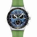 Часы Swatch YVS531 — это стильный и современный аксессуар для тех, кто ценит лёгкость и комфорт. Этот стальной хронографХронографФункция позволяет измерять отрезки времени с особой точностью: часы, минуты, секунды. Верным признаком хронографа является наличие на циферблате 3 дополнительных окошек-счётчиков. оснащен синим циферблатом с радиальной полировкой, черными дополнительными циферблатами, белыми цифрами, светящимися в темноте часовыми индексами из-за люминесцентного покрытияЛюминесцентное покрытиеПозволяет считывать показания времени в темноте. Производители наносят на стрелки, часовые индексы, безель или поверхность циферблата светонакопительный состав, дающий холодное свечение., а также белым окошком календаря с черным принтом в районе отметки 3 часа. Отсчет времени ведут остроконечные часовая и минутная стрелки серебристой расцветки, светящиеся в темноте из-за люминесцентного покрытияЛюминесцентное покрытиеПозволяет считывать показания времени в темноте. Производители наносят на стрелки, часовые индексы, безель или поверхность циферблата светонакопительный состав, дающий холодное свечение., а также зеленая секундная стрелка хронографаХронографФункция позволяет измерять отрезки времени с особой точностью: часы, минуты, секунды. Верным признаком хронографа является наличие на циферблате 3 дополнительных окошек-счётчиков.. Часы заключены в матовый стальной корпус, на безельБезельВнешний ободок, закрепляющий стекло. В спортивных часах так называется поворотное кольцо с делениями на циферблате, выполняет роль таймера – замеряет отрезки времени на шкале. Неподвижный безель – элемент декора. Однонаправленно вращающийся безель на дайверских часах позволяет фиксировать моменты погружения и выныривания на поверхность. с черным PVDPVDУльтратонкое покрытие наносится в технике вакуумного напыления, сочетает в себе нитрид титана особой прочности со слоем золота или оксида хрома. Несёт в себе декоративную или защитную функцию. покрытием нанесена белая шкала тахиметраТахиметрРазмеченная шкала, располагается на ободке или безеле часов. Тахиметр позволяет рассчитать скорость на определённом участке пути, расстояние измеряется в километрах или милях.. Модель дополнена структурированным матово-зеленым ремешком с тренчиками в тон и матовой полупряжкой из стали. Водозащита 30 метров делает часы практичными для повседневного использования. Эти часы подойдут для повседневного ношения и станут ярким акцентом в вашем наряде.