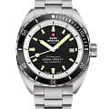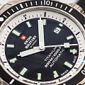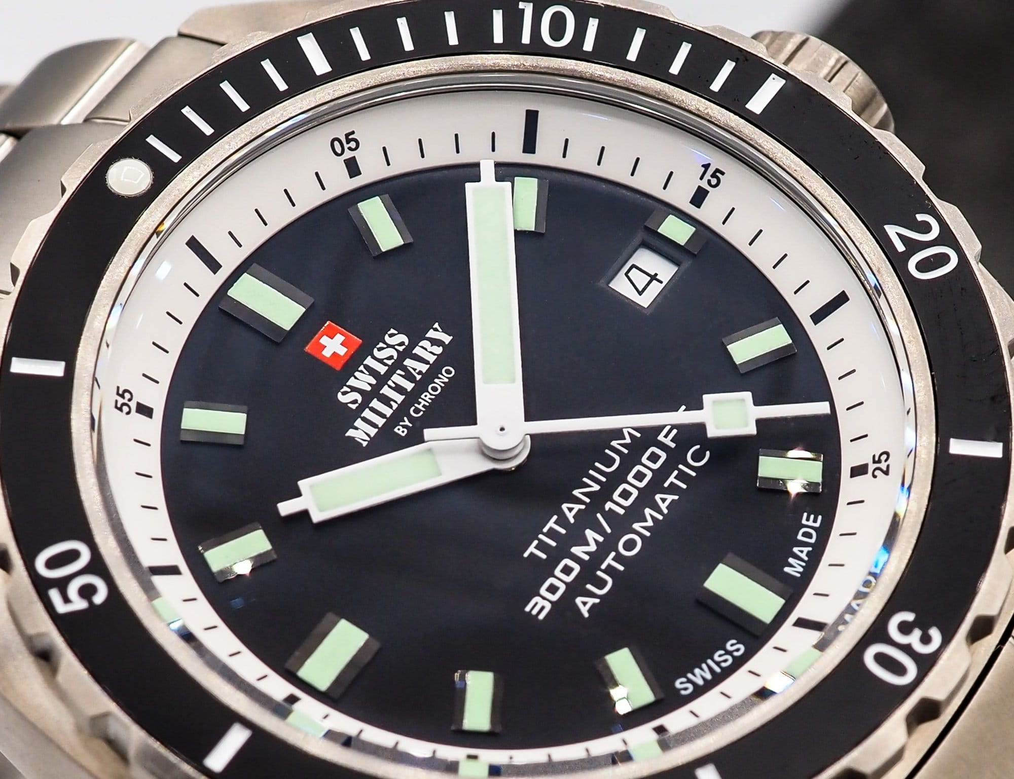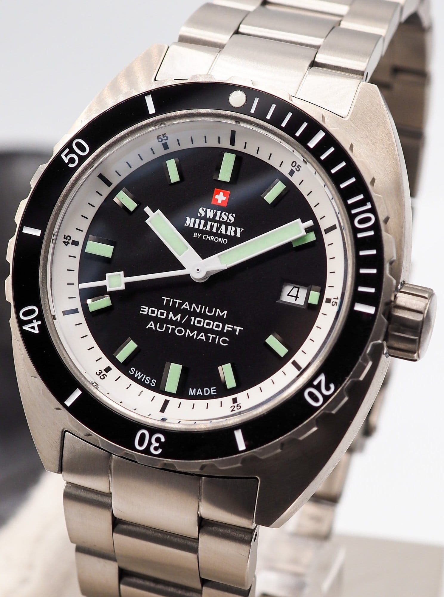 Мужские швейцарские механические часы с автоподзаводом Swiss Military by Chrono Titanium 300 SMA34100.02. Сапфировое стеклоСапфировое стеклоПрочный и надёжный материал из кристалла сапфира синтетического происхождения, характеризующийся особой твёрдостью и устойчивостью к царапинам и повреждениям. устойчивое к появлению царапин, обладающее высокой прозрачностью. Корпус часов изготовлен из титана. Вращающийся безельБезельВнешний ободок, закрепляющий стекло. В спортивных часах так называется поворотное кольцо с делениями на циферблате, выполняет роль таймера – замеряет отрезки времени на шкале. Неподвижный безель – элемент декора. Однонаправленно вращающийся безель на дайверских часах позволяет фиксировать моменты погружения и выныривания на поверхность. из высокотехнологичной керамикиВысокотехнологичная керамикаИнновационный запатентованный Rado материал с гладкой или матовой поверхностью. Керамика за счёт кристаллической структуры обладает повышенной устойчивостью от возникновения царапин. Материал способен принимать температуру тела человека, обеспечивая невероятный комфорт при ношении.. Индикация даты на позиции трех часов. Стрелки и метки с люминесцентной подсветкойЛюминесцентное покрытиеПозволяет считывать показания времени в темноте. Производители наносят на стрелки, часовые индексы, безель или поверхность циферблата светонакопительный состав, дающий холодное свечение.. Класс водозащиты: 300 метров, позволит плавать, нырять и заниматься другими водными видами спорта. Титановый браслет на раскладной застёжкеРаскладная застёжкаТакой тип застёжки используется только на браслетах из металла. Она никогда не раскрывается полностью, происходит разделение на 2 и более частей. Раскладывающая застёжка снизит вероятность потери часов к минимуму..