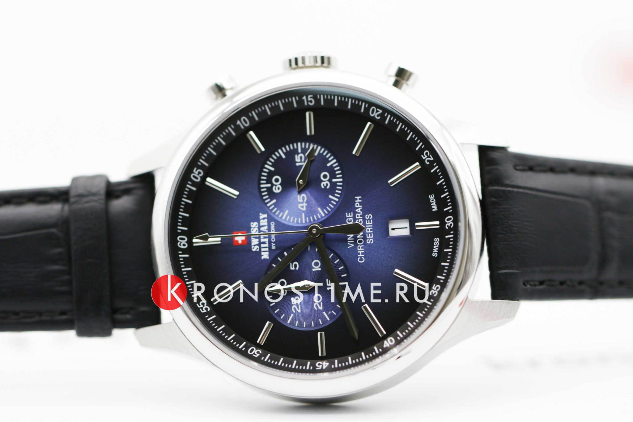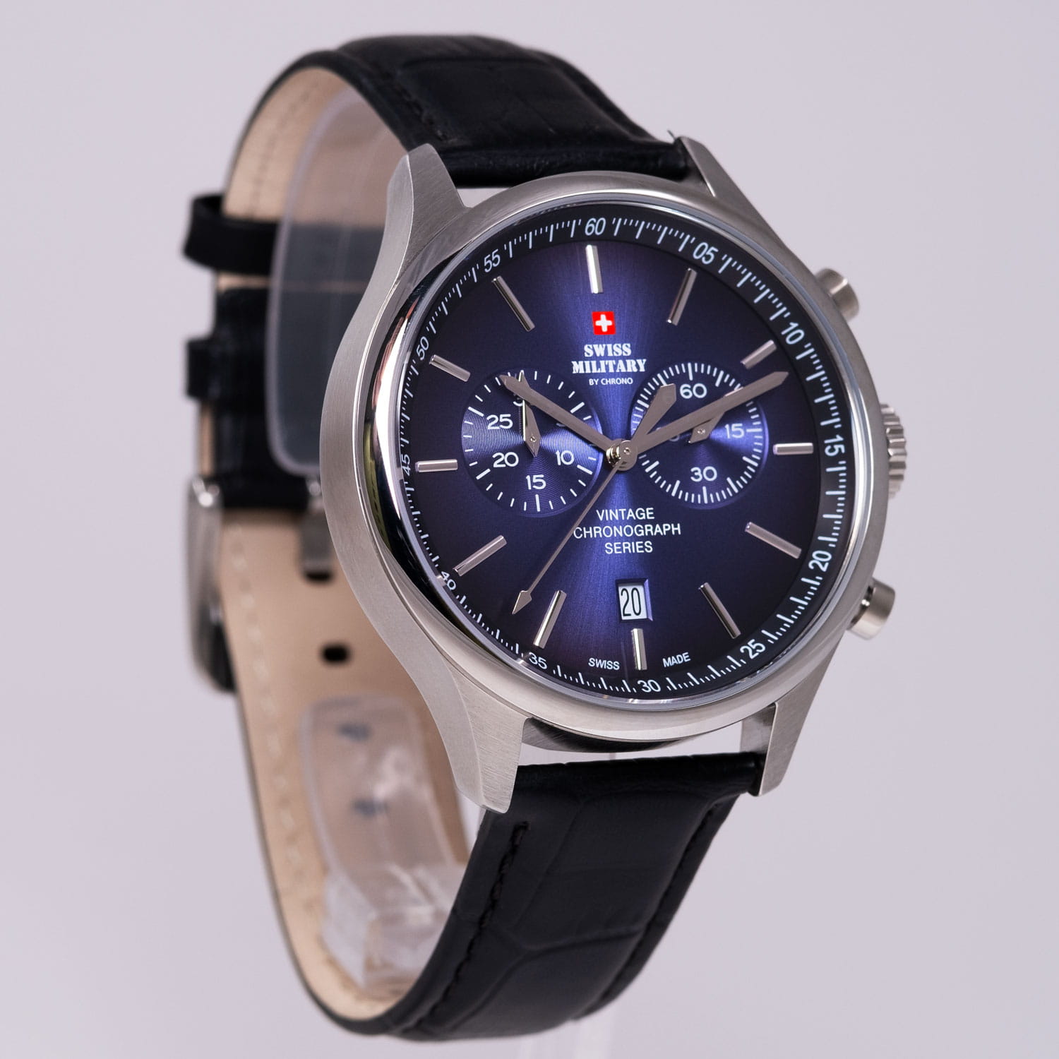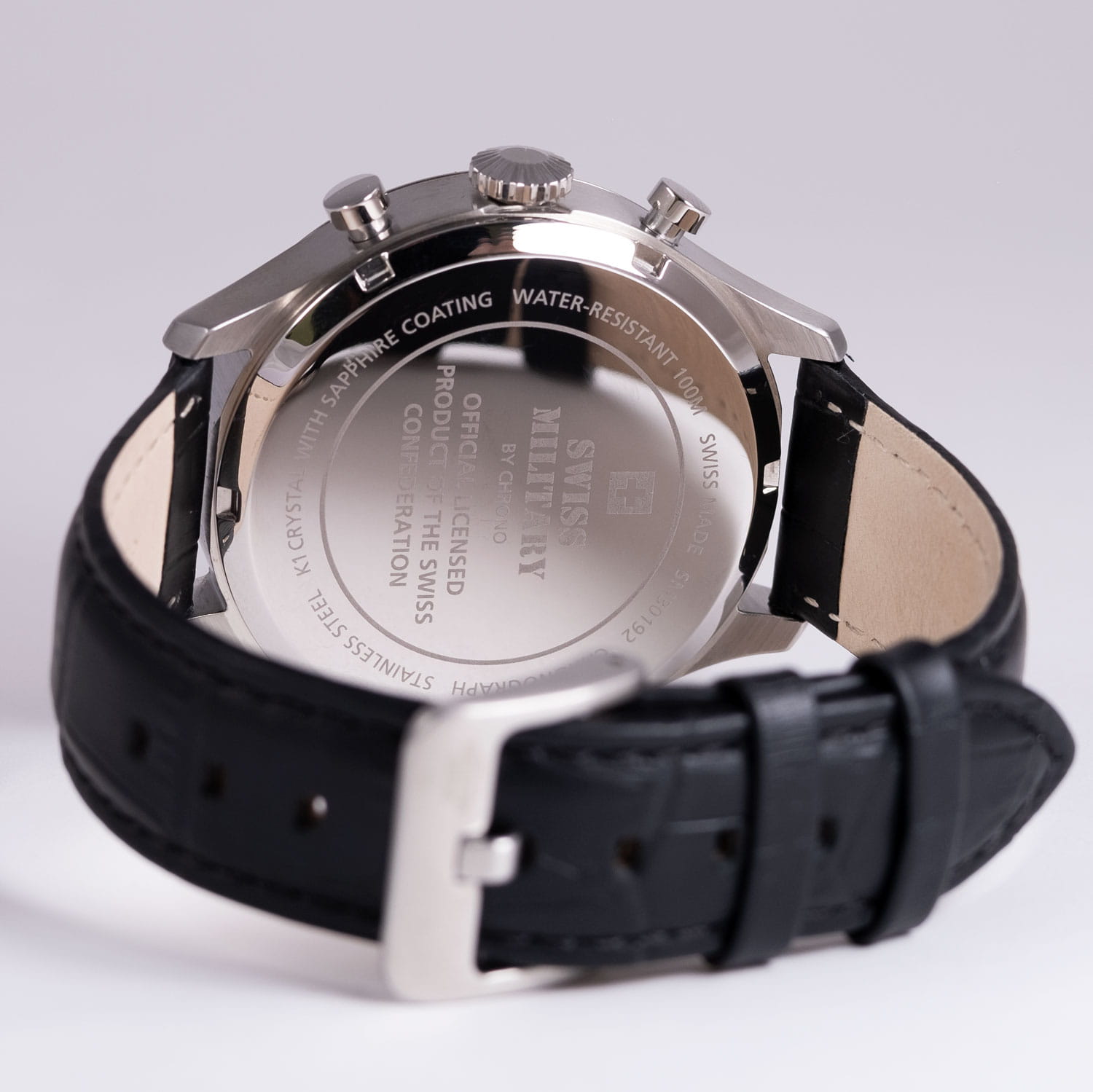 Мужские швейцарские наручные часы-хронографХронографФункция позволяет измерять отрезки времени с особой точностью: часы, минуты, секунды. Верным признаком хронографа является наличие на циферблате 3 дополнительных окошек-счётчиков. Swiss Military by Chrono SM30192.08, кварцевый механизм с высокой точностью. Класс водозащиты: 100 метров, позволит плавать, нырять и заниматься другими водными видами спорта. Корпус часов изготовлен из стали серебристого цвета. Апертура даты в позиции 6 часов. Черный кожаный ремешок с классической пряжкой. Модель оснащена секундомеромСекундомерСекундоме́р — прибор, способный измерять интервалы времени с точностью до долей секунды.. Стрелки и метки с люминесцентной подсветкойЛюминесцентное покрытиеПозволяет считывать показания времени в темноте. Производители наносят на стрелки, часовые индексы, безель или поверхность циферблата светонакопительный состав, дающий холодное свечение..