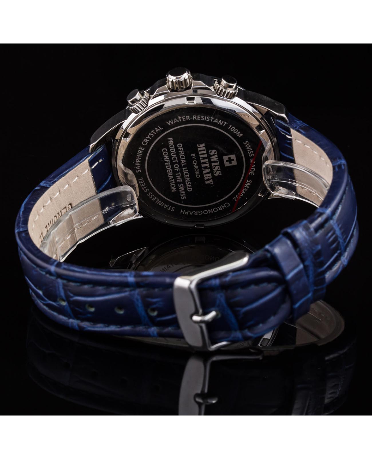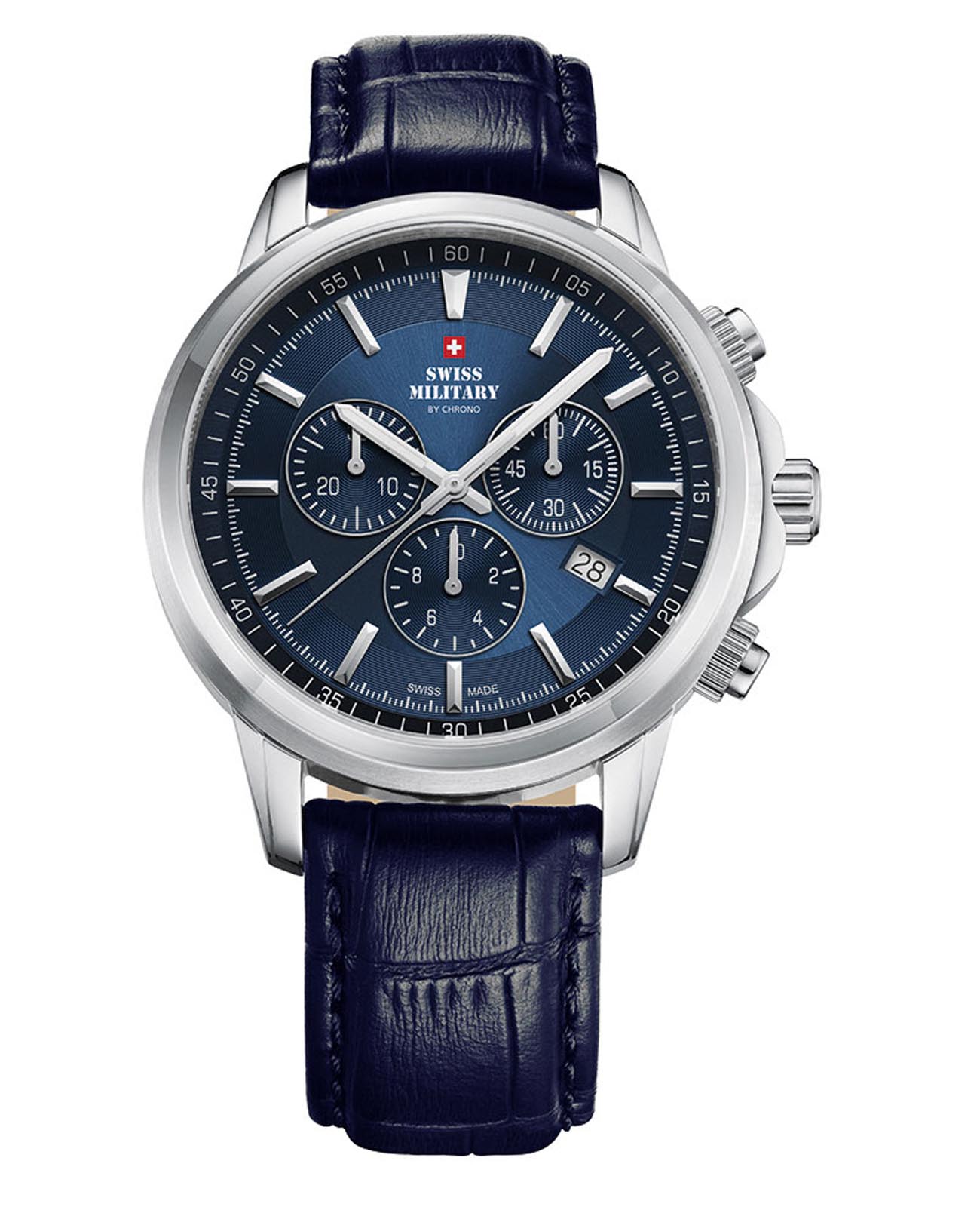 Мужские швейцарские часы-хронографХронографФункция позволяет измерять отрезки времени с особой точностью: часы, минуты, секунды. Верным признаком хронографа является наличие на циферблате 3 дополнительных окошек-счётчиков. с секундомеромСекундомерСекундоме́р — прибор, способный измерять интервалы времени с точностью до долей секунды. Swiss Military by Chrono SM34052.13, кварцевый механизм с высокой точностью. Сапфировое стеклоСапфировое стеклоПрочный и надёжный материал из кристалла сапфира синтетического происхождения, характеризующийся особой твёрдостью и устойчивостью к царапинам и повреждениям. устойчивое к мелким механическим повреждениям. Корпус часов изготовлен из нержавеющей стали. На циферблате расположены два дополнительных индикатора и окошко даты. Окошко даты находится в положении 4 часов. Стрелки с люминесцентным покрытиемЛюминесцентное покрытиеПозволяет считывать показания времени в темноте. Производители наносят на стрелки, часовые индексы, безель или поверхность циферблата светонакопительный состав, дающий холодное свечение.. Класс водозащиты: 100 метров, позволит плавать, нырять и заниматься другими водными видами спорта. Кожаный ремешок на стандартной застёжке.