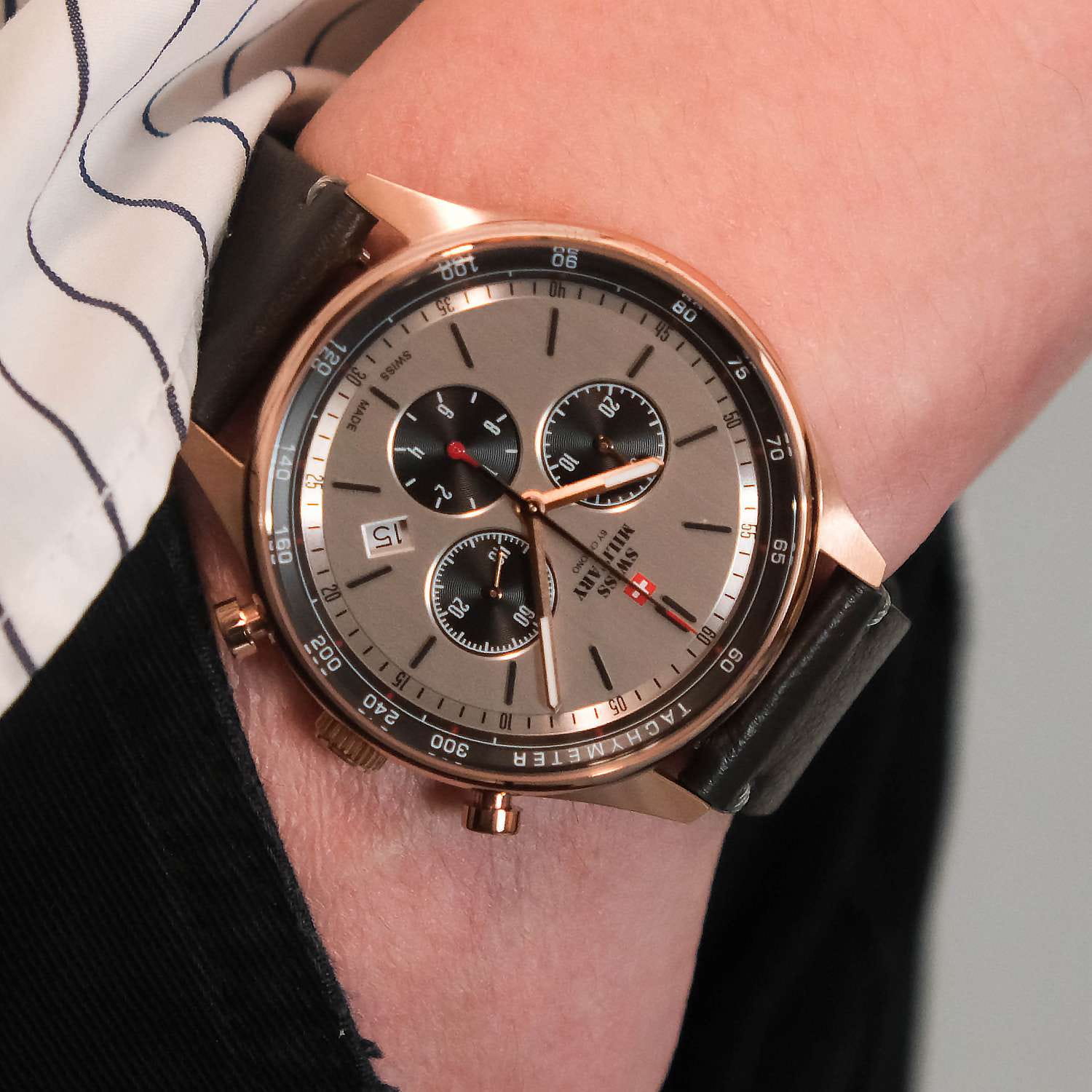 Мужские швейцарские наручные часы-хронографХронографФункция позволяет измерять отрезки времени с особой точностью: часы, минуты, секунды. Верным признаком хронографа является наличие на циферблате 3 дополнительных окошек-счётчиков. Swiss Military by Chrono SM34013.09, кварцевый механизм с высокой точностью. Класс водозащиты: 100 метров, позволит плавать, нырять и заниматься другими водными видами спорта. Стрелки с люминесцентным покрытиемЛюминесцентное покрытиеПозволяет считывать показания времени в темноте. Производители наносят на стрелки, часовые индексы, безель или поверхность циферблата светонакопительный состав, дающий холодное свечение.. Корпус часов изготовлен из стали с PVD-покрытиемPVDУльтратонкое покрытие наносится в технике вакуумного напыления, сочетает в себе нитрид титана особой прочности со слоем золота или оксида хрома. Несёт в себе декоративную или защитную функцию.. Минеральное стеклоМинеральное стеклоМинеральное стекло представляет собой искусственно выращенный минерал кварца. Такое стекло отличается особой устойчивостью к повреждениям и царапинам. Уступает по некоторым качествам сапфировому стеклу.. Ремешок с классической застежкой.