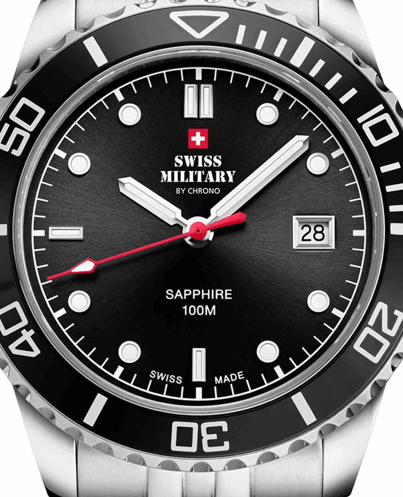 Модель SM34109.01 от Swiss Military by Chrono — это надёжные швейцарские спортивные часы, сочетающие в себе прочность, функциональность и элегантный дизайн. Корпус и браслет выполнены из нержавеющей стали, подчёркивая прочность и элегантность конструкции. Циферблат с солнечным узором и крупными метками, покрытыми люминесцентным покрытиемЛюминесцентное покрытиеПозволяет считывать показания времени в темноте. Производители наносят на стрелки, часовые индексы, безель или поверхность циферблата светонакопительный состав, дающий холодное свечение., обеспечивает отличную читаемость в любых условиях. Часы оснащены швейцарским кварцевым механизмом, обеспечивающим точный ход. Циферблат защищён сапфировым стекломСапфировое стеклоПрочный и надёжный материал из кристалла сапфира синтетического происхождения, характеризующийся особой твёрдостью и устойчивостью к царапинам и повреждениям., устойчивым к царапинам. Установлена раскладная застёжкаРаскладная застёжкаТакой тип застёжки используется только на браслетах из металла. Она никогда не раскрывается полностью, происходит разделение на 2 и более частей. Раскладывающая застёжка снизит вероятность потери часов к минимуму. для надёжной фиксации на запястье. Односторонний вращающийся безель с PVD-покрытиемPVDУльтратонкое покрытие наносится в технике вакуумного напыления, сочетает в себе нитрид титана особой прочности со слоем золота или оксида хрома. Несёт в себе декоративную или защитную функцию. позволяет точно отслеживать время. Модель обладает водонепроницаемостью до 100 метров, что делает её подходящей для плавания и сноркелинга.