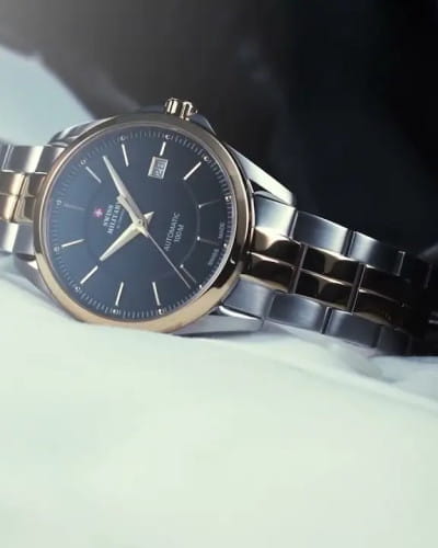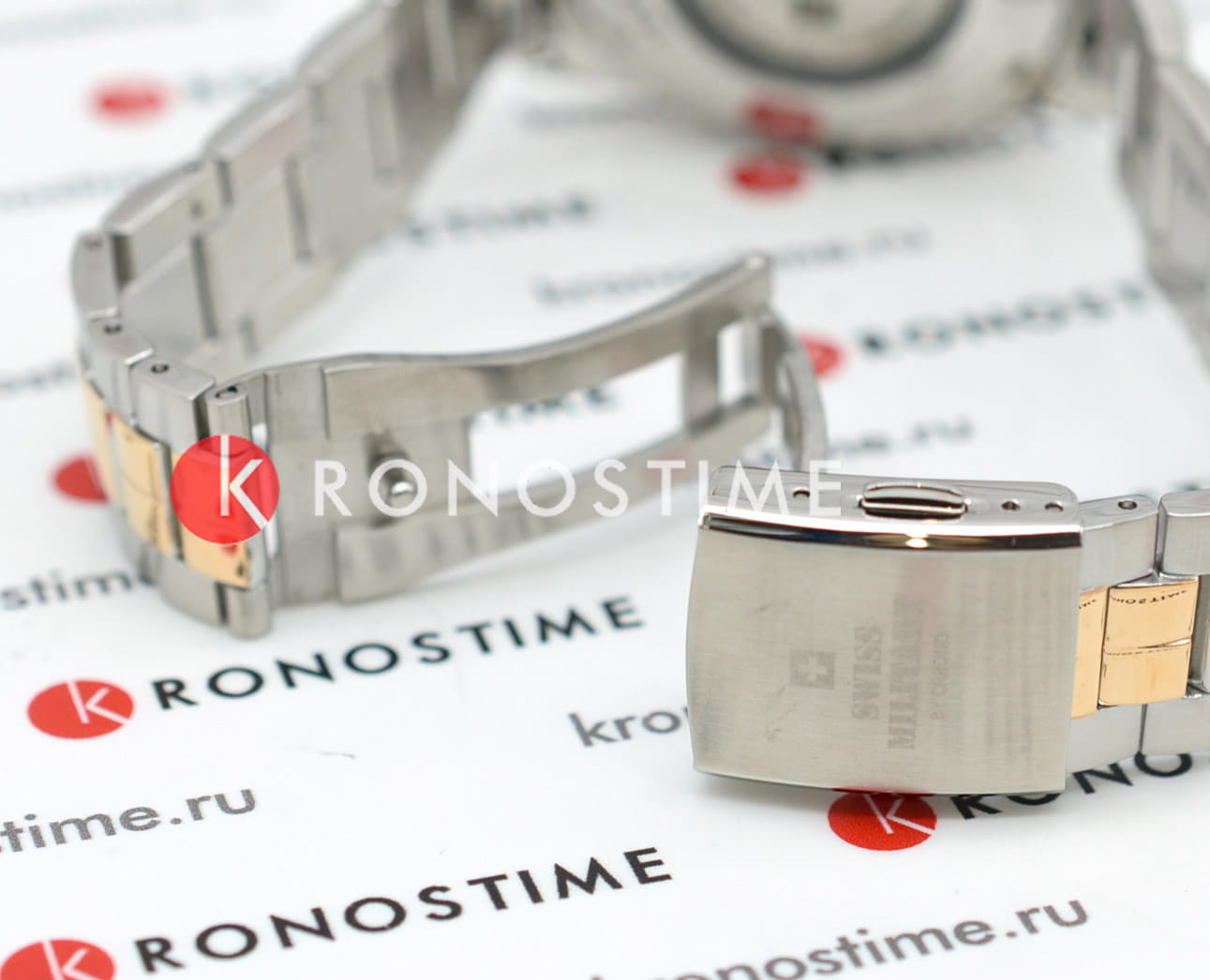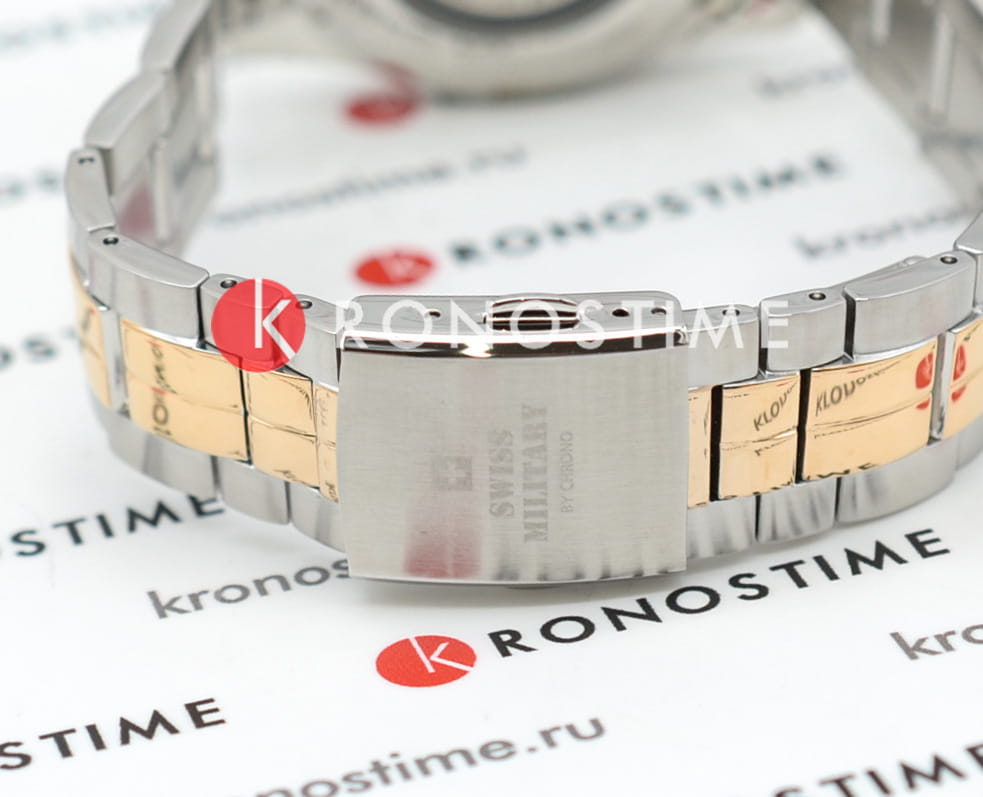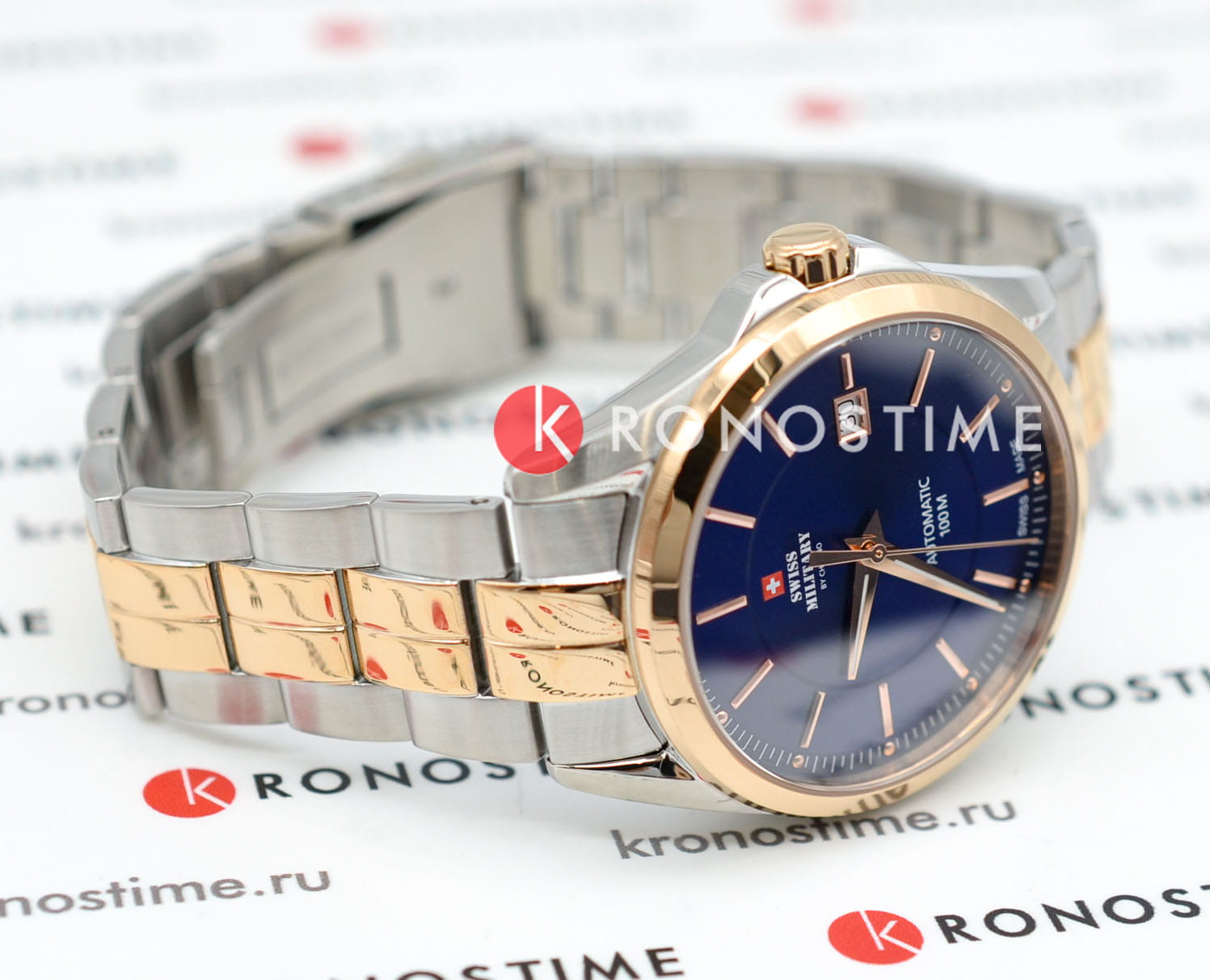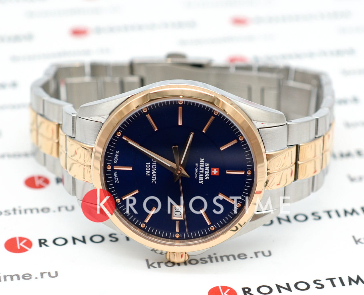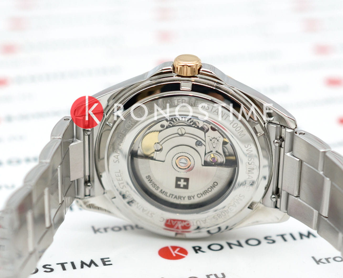 Мужские швейцарские наручные часы Swiss Military by Chrono SMA34085.10, механический механизм (автоматический калибр) с высокой точностью. Сапфировое стеклоСапфировое стеклоПрочный и надёжный материал из кристалла сапфира синтетического происхождения, характеризующийся особой твёрдостью и устойчивостью к царапинам и повреждениям. устойчивое к появлению царапин, обладающее высокой прозрачностью. Класс водозащиты: 100 метров, позволит плавать, нырять и заниматься другими водными видами спорта. Корпус часов изготовлен из стали с частичным PVD-покрытиемPVDУльтратонкое покрытие наносится в технике вакуумного напыления, сочетает в себе нитрид титана особой прочности со слоем золота или оксида хрома. Несёт в себе декоративную или защитную функцию., цвета желтое золото. Люминесцентная подсветкаЛюминесцентное покрытиеПозволяет считывать показания времени в темноте. Производители наносят на стрелки, часовые индексы, безель или поверхность циферблата светонакопительный состав, дающий холодное свечение. стрелок. Браслет с раскладной застёжкойРаскладная застёжкаТакой тип застёжки используется только на браслетах из металла. Она никогда не раскрывается полностью, происходит разделение на 2 и более частей. Раскладывающая застёжка снизит вероятность потери часов к минимуму..
